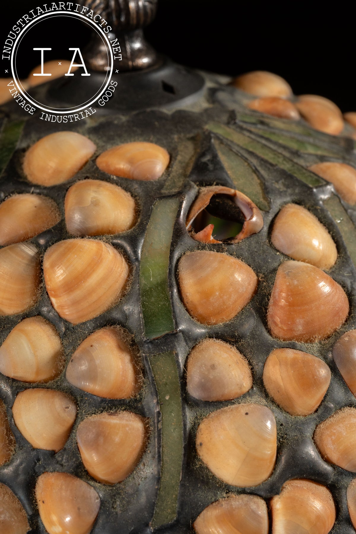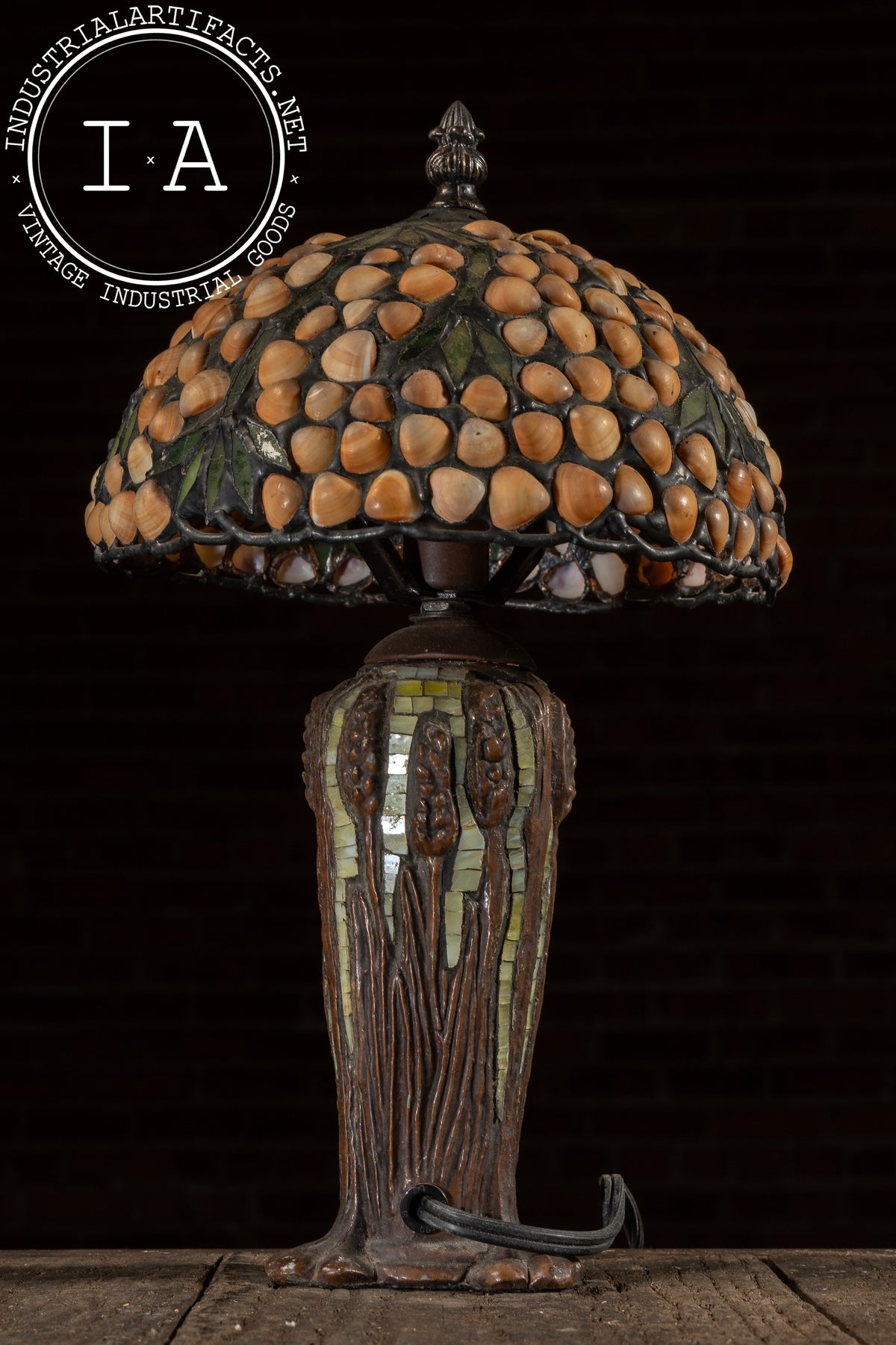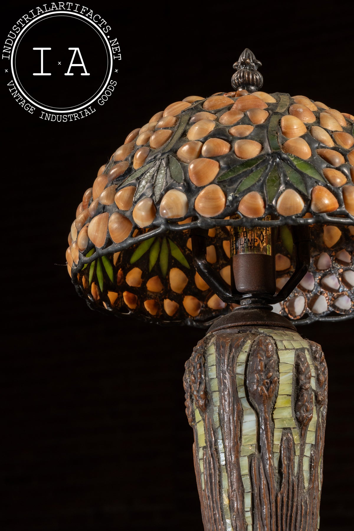 Please note that the shade of this lamp has suffered damage. There are two broken seashell cabochons on the shade. The lamp is otherwise in excellent condition.