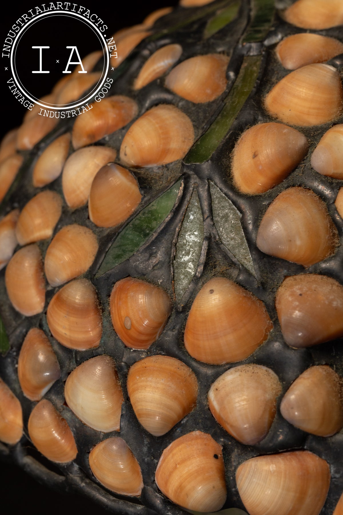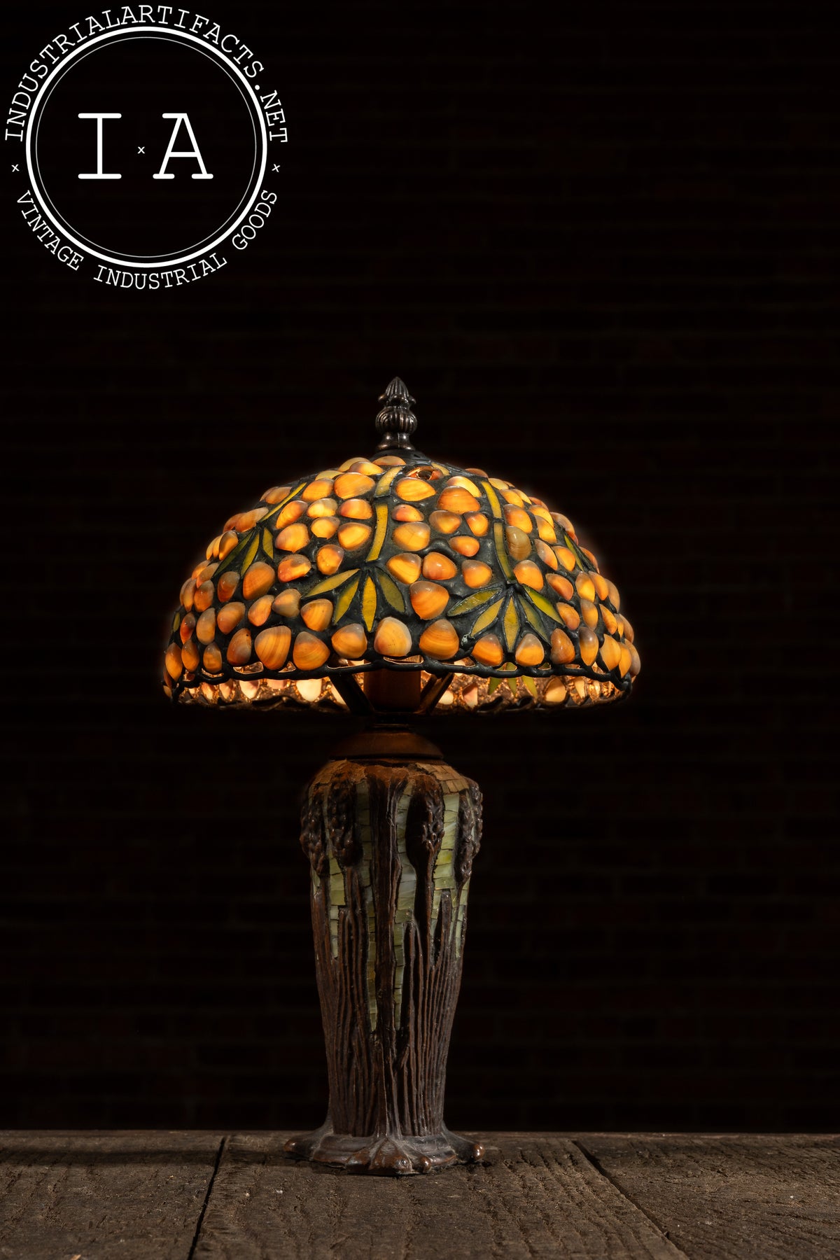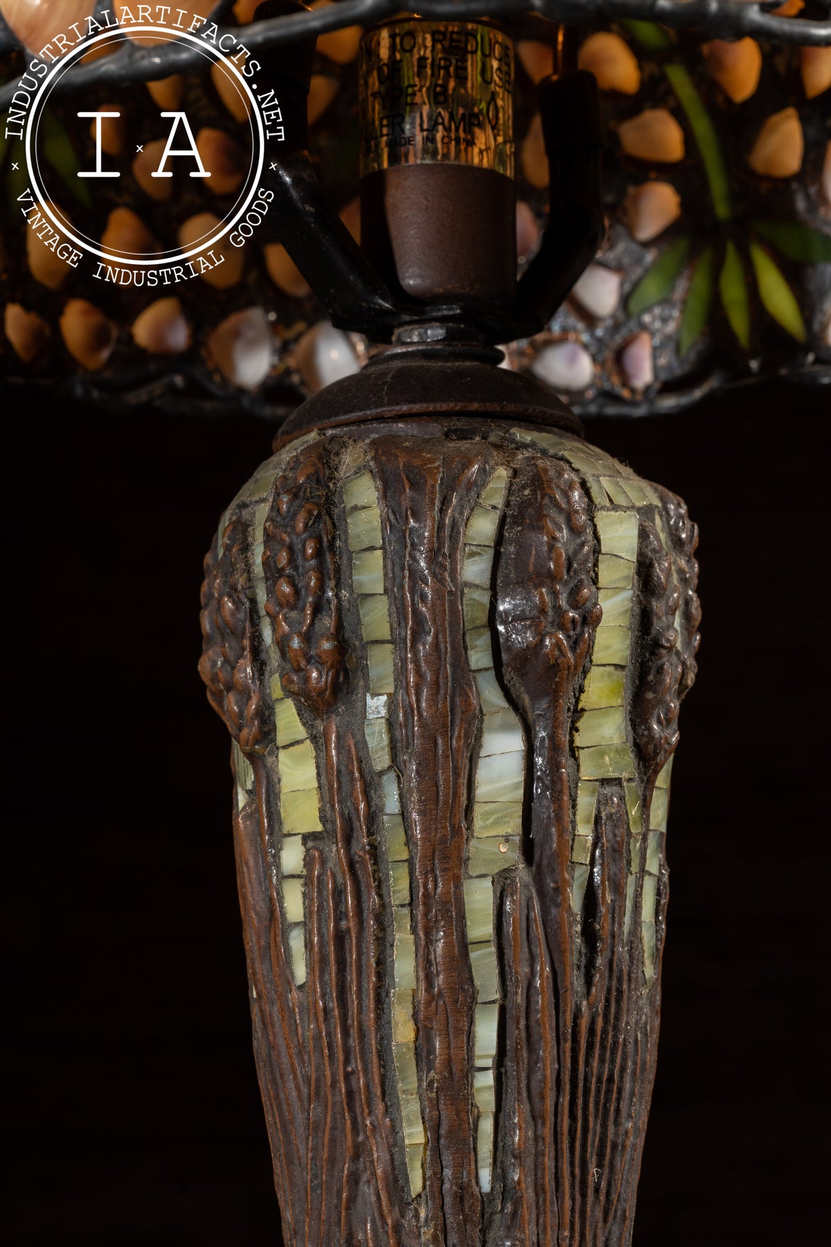 Please note that the shade of this lamp has suffered damage. There are two broken seashell cabochons on the shade. The lamp is otherwise in excellent condition.