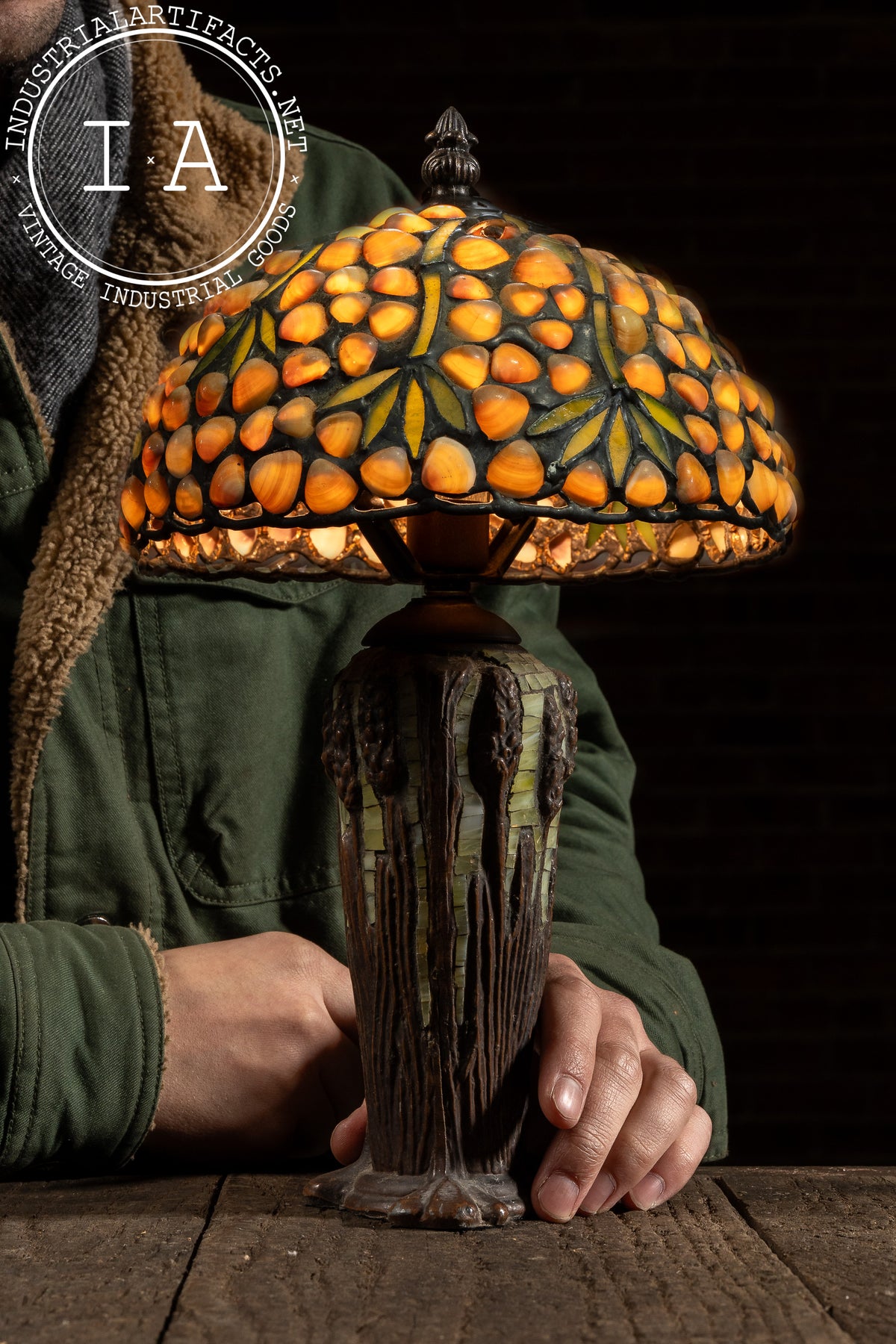 This handcrafted table lamp features a richly textured shade designed by Richard Hoosin, composed of warm amber seashells arranged in a clustered organic motif with deep green stained glass veins running throughout. The shade channels the Arts & Crafts revival aesthetic, with a dense, hand-laid leaded pattern that throws a warm, dappled glow when lit. The naturalistic palette delivers the same "forest-floor amber" character that Hoosin's studio work is known for.