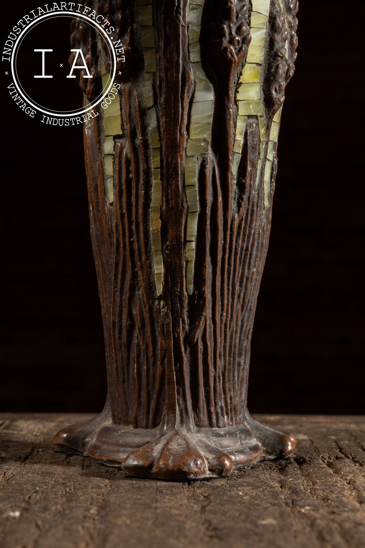 The sculpted base pairs a cast-resin trunk form with inset green glass elements, giving the piece a cohesive woodland tone from top to bottom. Vertical root-like ribbing follows the column down to a broad, organic foot. The lamp operates on a single standard socket and produces a beautifully warm, atmospheric light. This lamp base is not designed by Richard Hoosin, but pairs nicely with the shade.