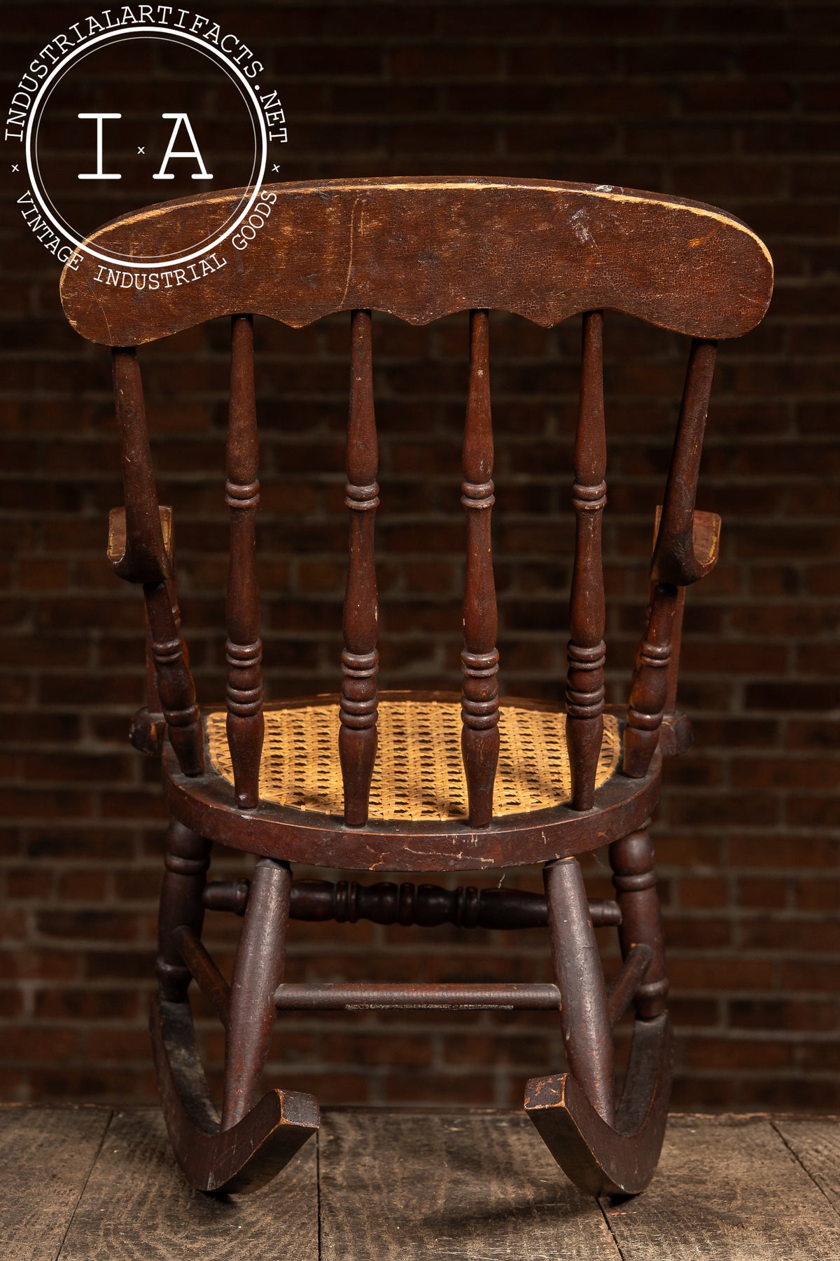 A charming child-size wooden rocking chair featuring turned spindles, splayed arms, and a hand-painted crest rail decorated with florals and faint geometric stenciling. The frame retains its original warm brown finish with authentic agewear throughout. The hand-woven cane seat appears to be a later replacement, tightly woven and in excellent usable condition. The rockers and undercarriage display classic 19th-century turning profiles, giving the piece both decorative appeal and historical character.