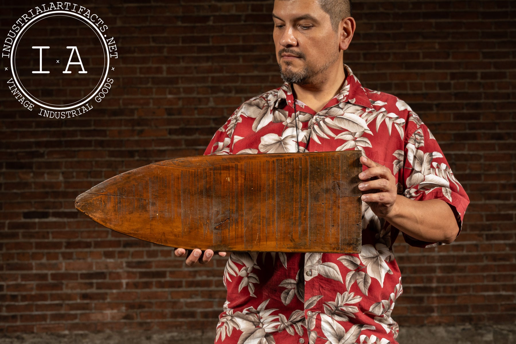 Condition shows heavy surface wear, faded paint, age cracks, and a darkened patina to the wood. Despite this, the town name remains legible and the figural arrow form reads clearly. An evocative artifact of small-town Americana with strong regional appeal.