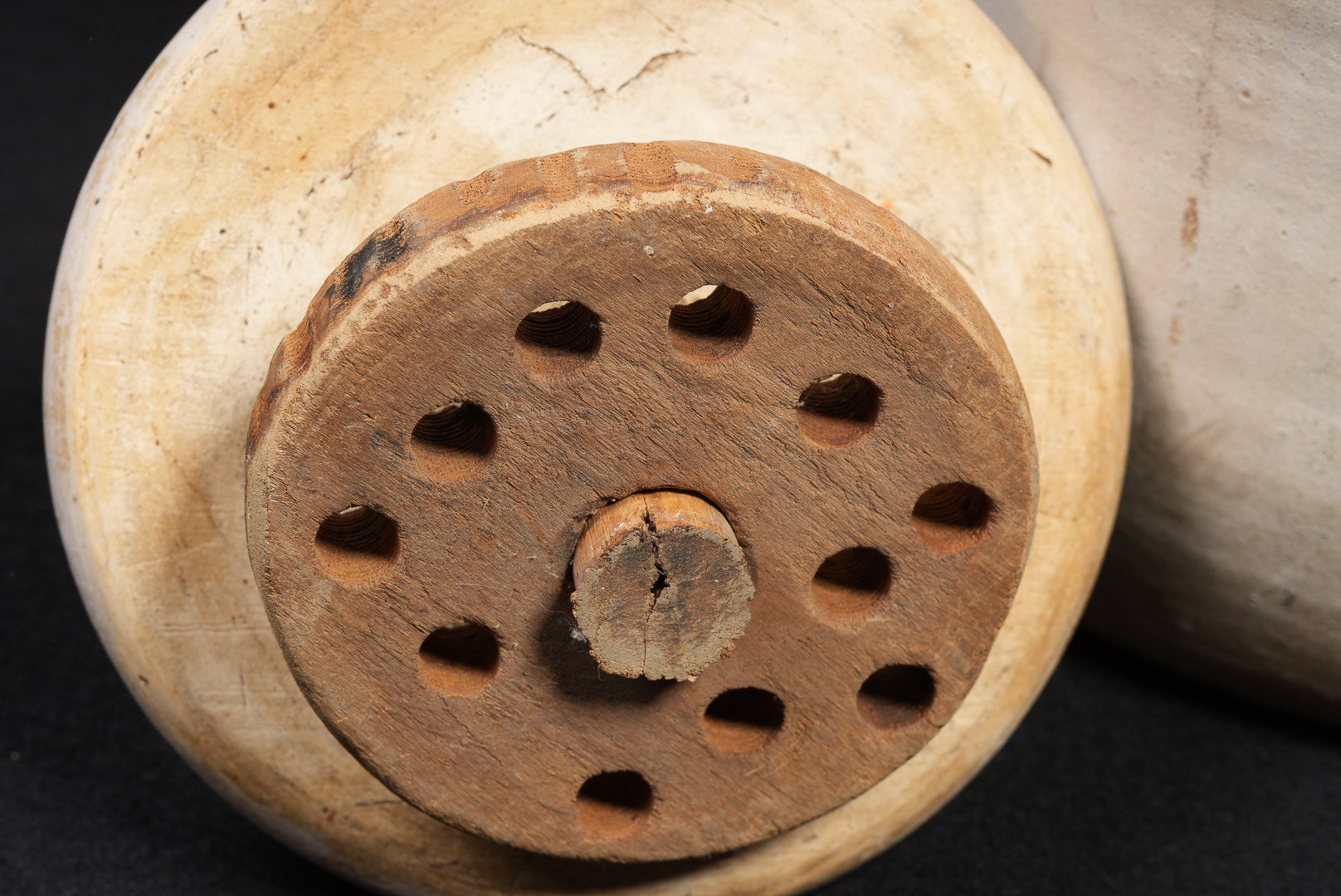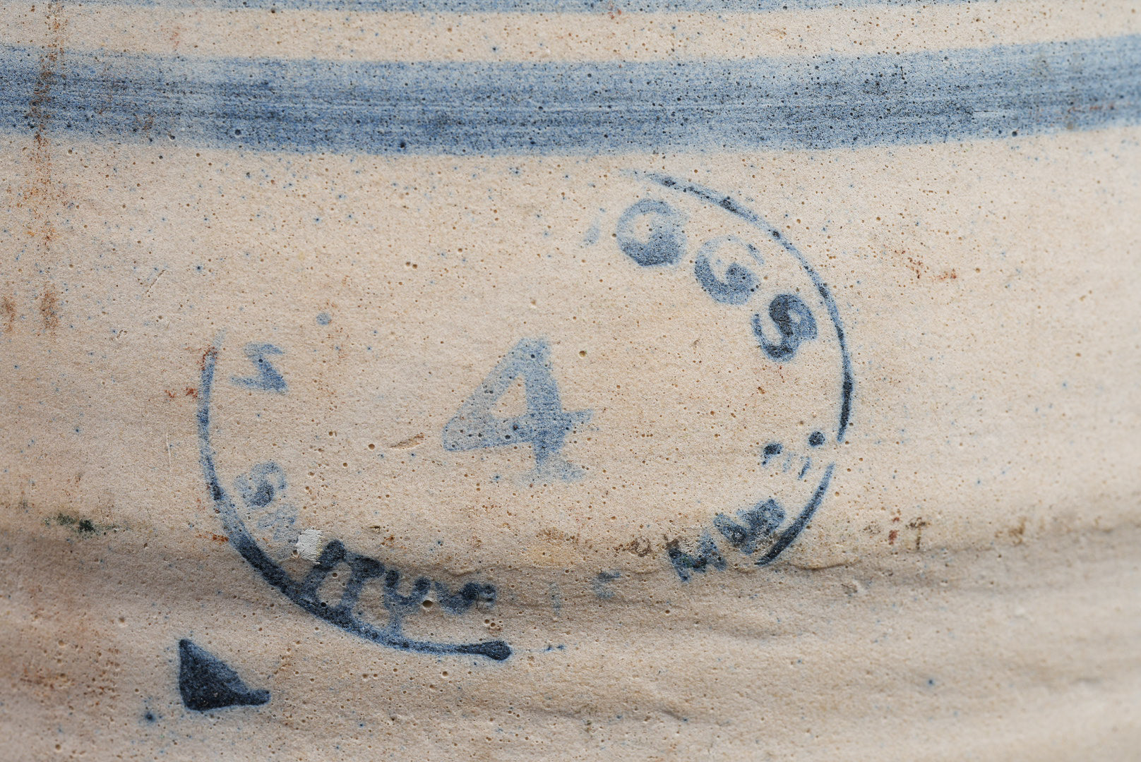 This salt-glazed stoneware butter churn was produced by W. D. Suggs of Smithville, Mississippi, a noted Southern potter active in the early 1900s. The churn features a cylindrical form with applied lug handles, a rolled rim, and cobalt stenciled "4" capacity mark along with double cobalt stripes around the shoulder. It retains its original stoneware lid and wooden dasher, used in the traditional churning of cream into butter. A regional example of Mississippi pottery, it reflects the enduring craft tradition of local potters who supplied durable wares for farm and household use.