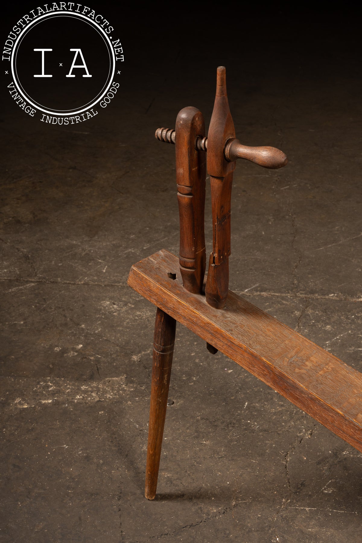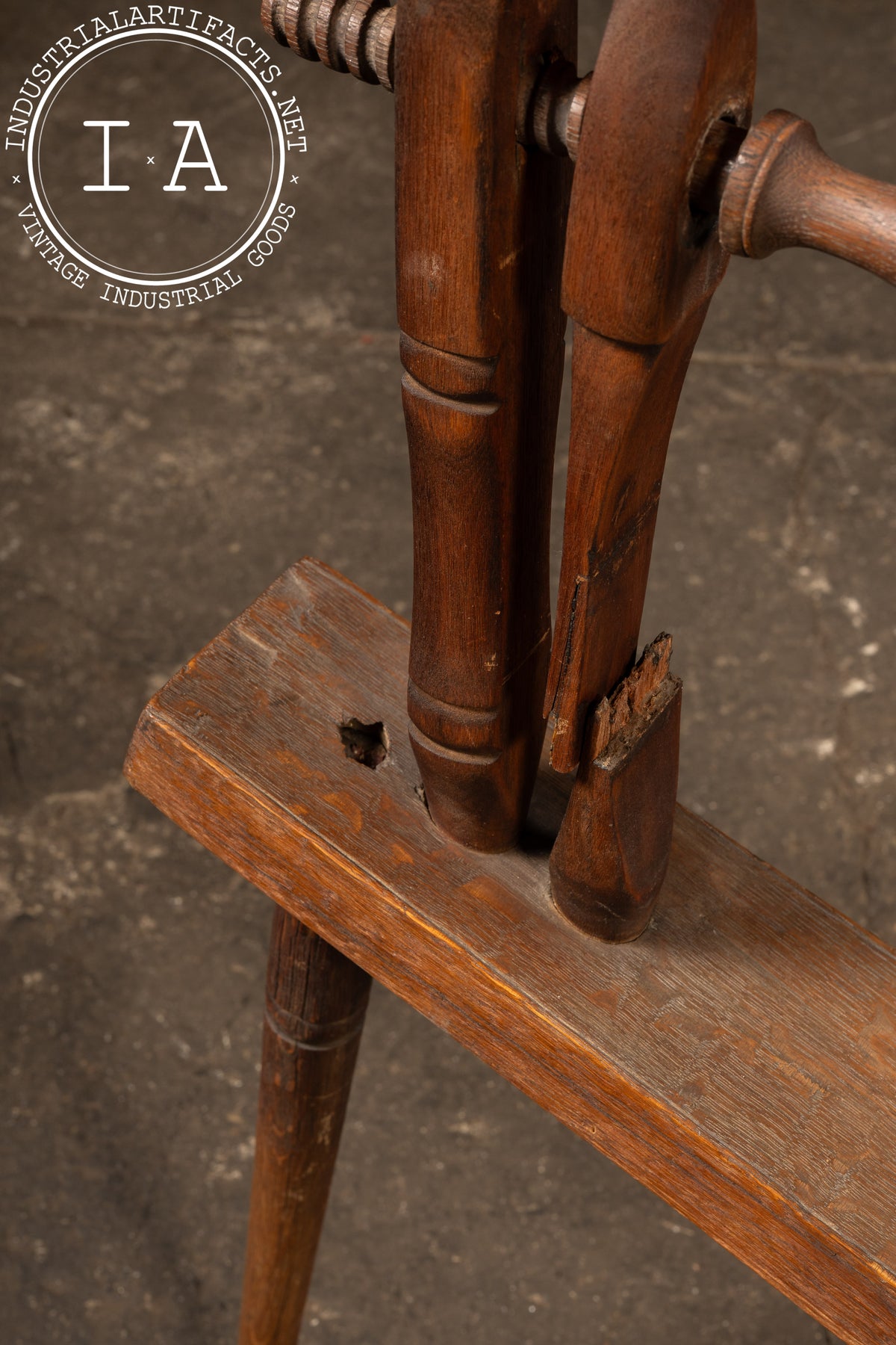Primitive condition with expected age-related wear throughout. Surfaces show handling marks, patina, and minor abrasions consistent with long-term use; no major losses or structural failures observed. Wheel turns freely and the piece remains stable.