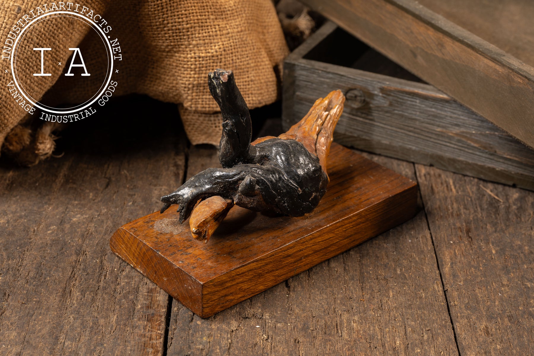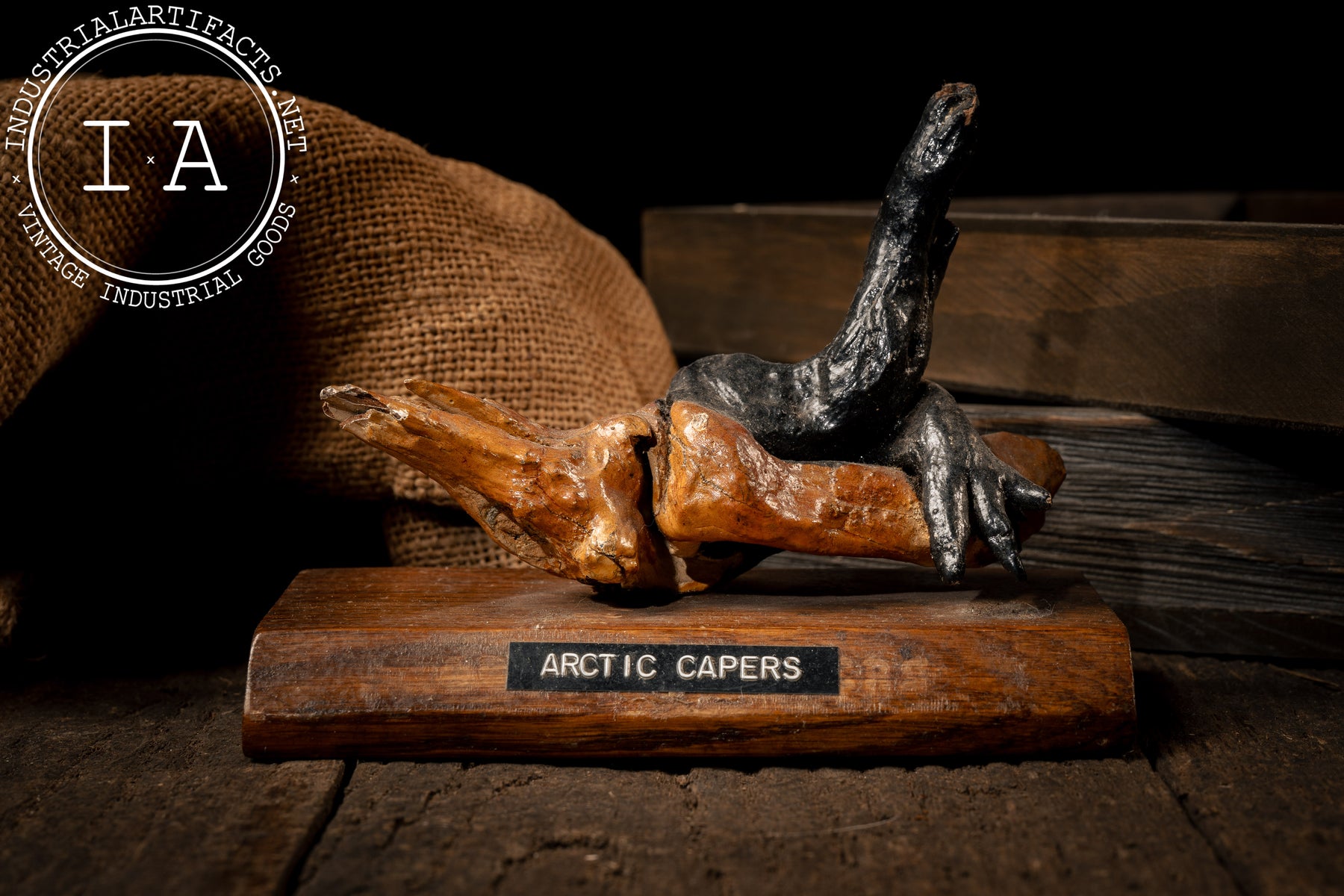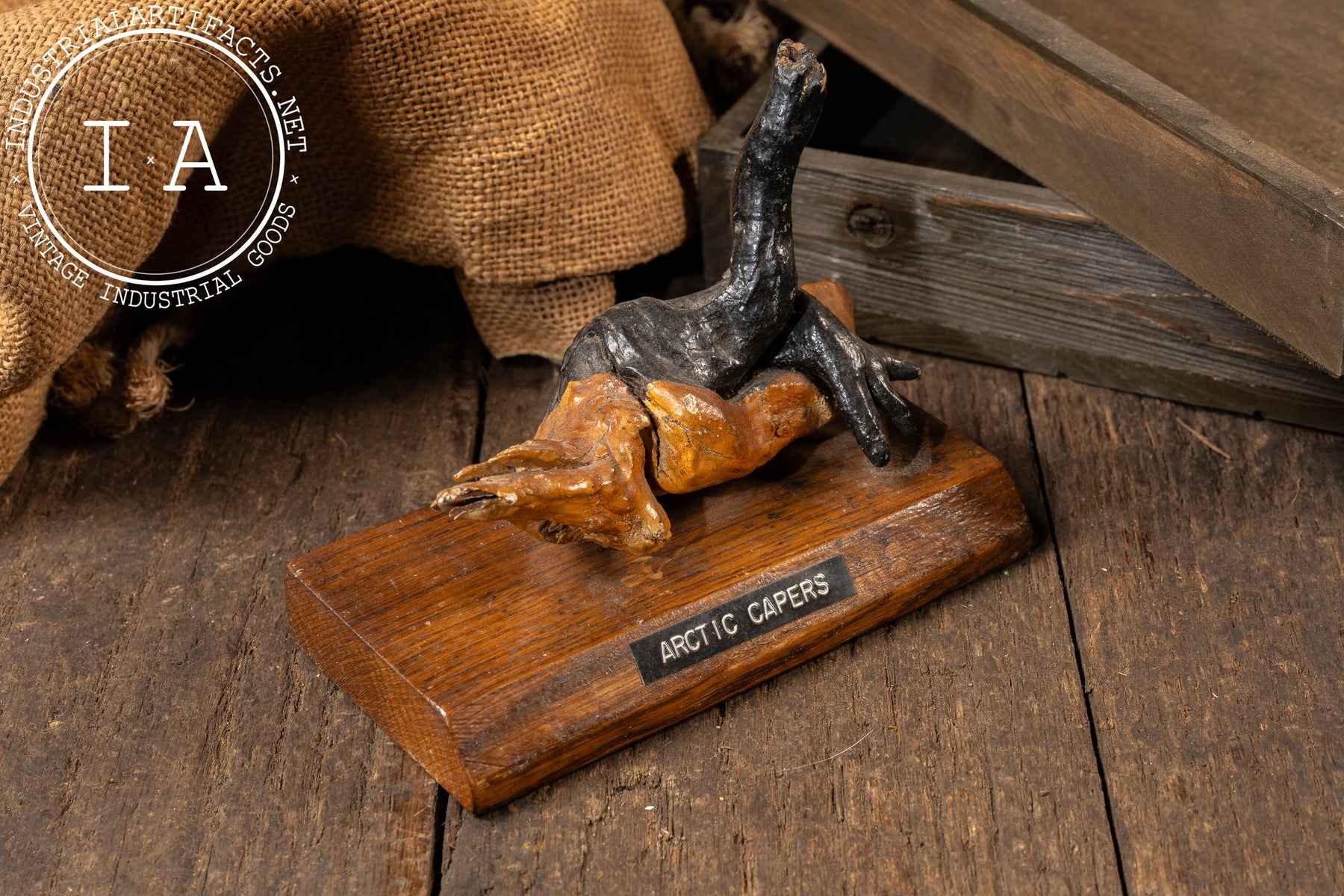 The painted surface combines earthy browns with contrasting black and lighter natural wood tones, emphasizing texture and movement. Pieces like this are characteristic of self-taught folk or outsider artists who allowed found materials to dictate both subject and narrative. The titled base reinforces the sense that this was conceived as a finished, narrative work, with Arctic Capers suggesting humor, motion, and a lighthearted interpretation of animal life rather than literal realism.