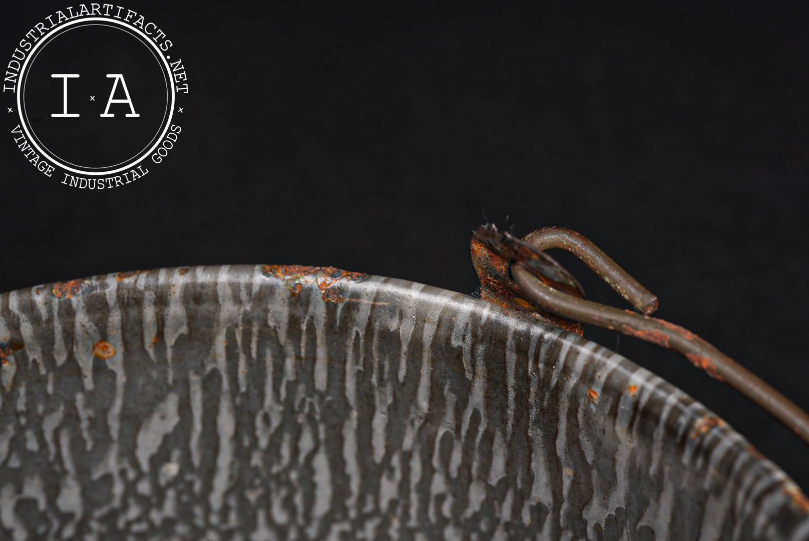 A charming early 20th-century six-piece graniteware kitchen set, featuring a range of essential cookware and serving vessels in mottled gray enamel. The collection includes a tall coffee pot with hinged lid and spout cover, a handled lidded kettle, a cylindrical milk can, a handled saucepan, a small pail with wire bail, and a perforated strainer-all unified by their speckled gray finish and utilitarian craftsmanship. Each piece showcases the textured enamel surface characteristic of turn-of-the-century enamelware, where form met durability in everyday domestic life.