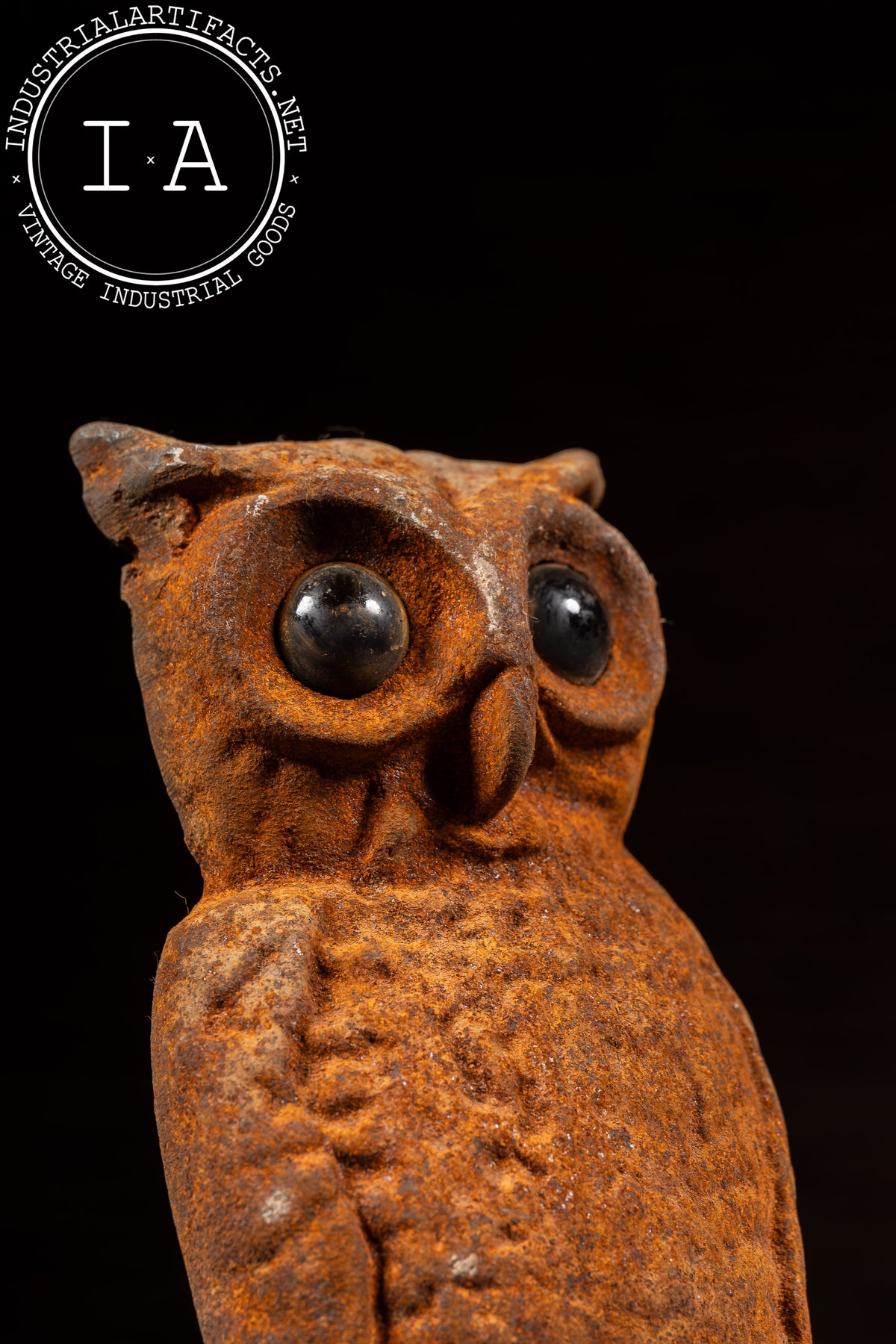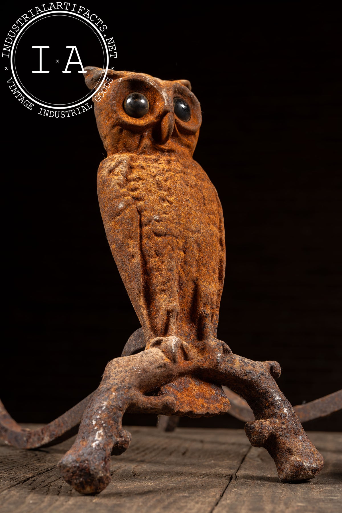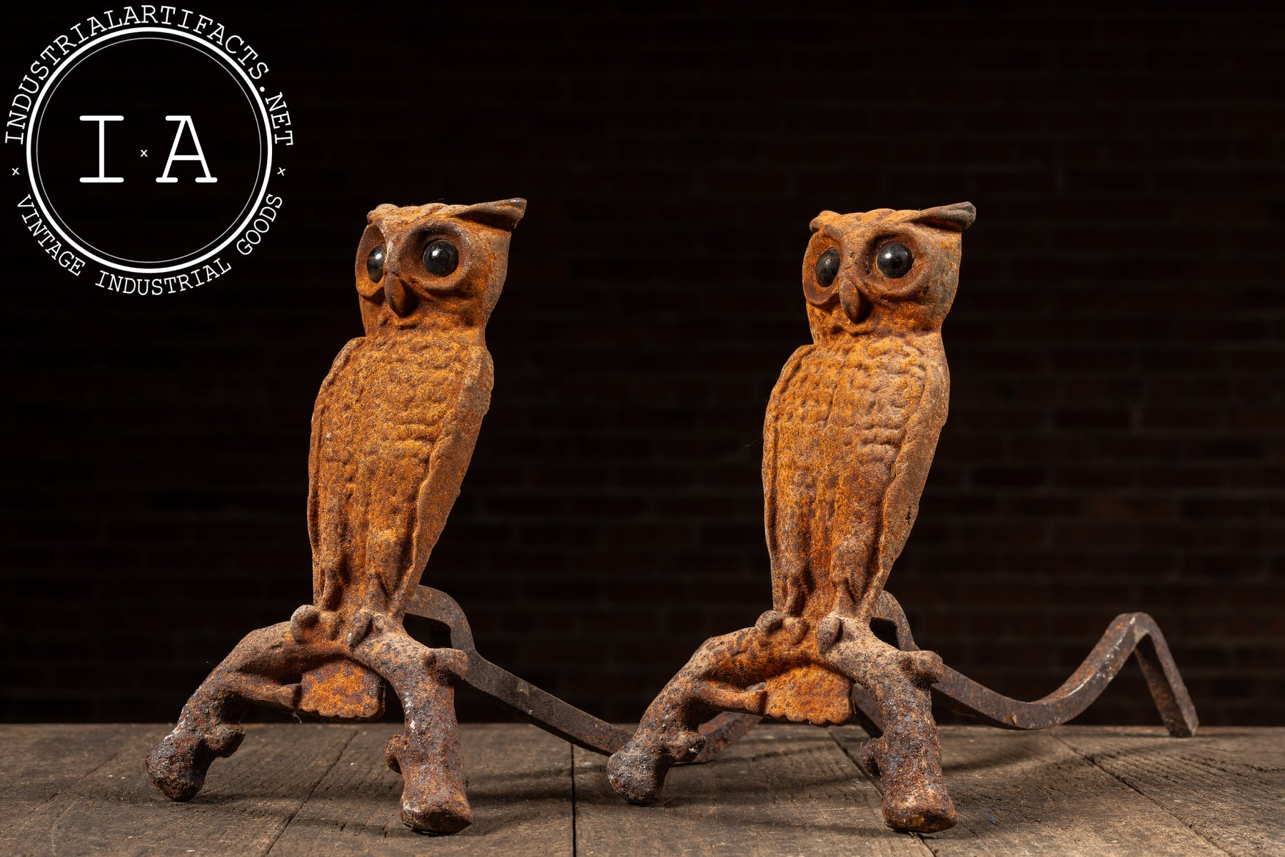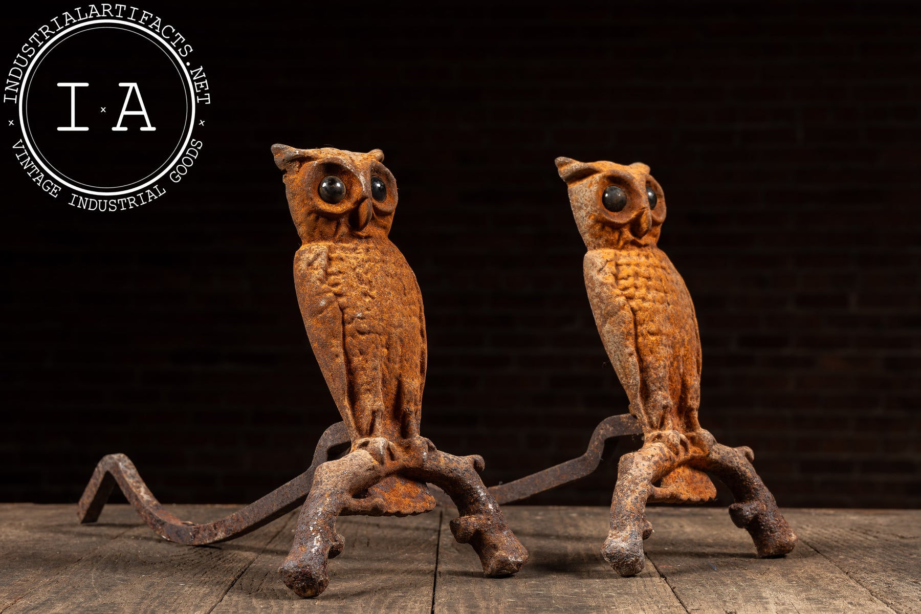 A set of cast iron andirons, made in the image of two owls. These andirons feature glass eyes that flicker and glow as the fire is lit. The andirons are stable but do feature significant rust as shown in the photos. This could be wire brushed clean by the end user. The glass eyes are intact.