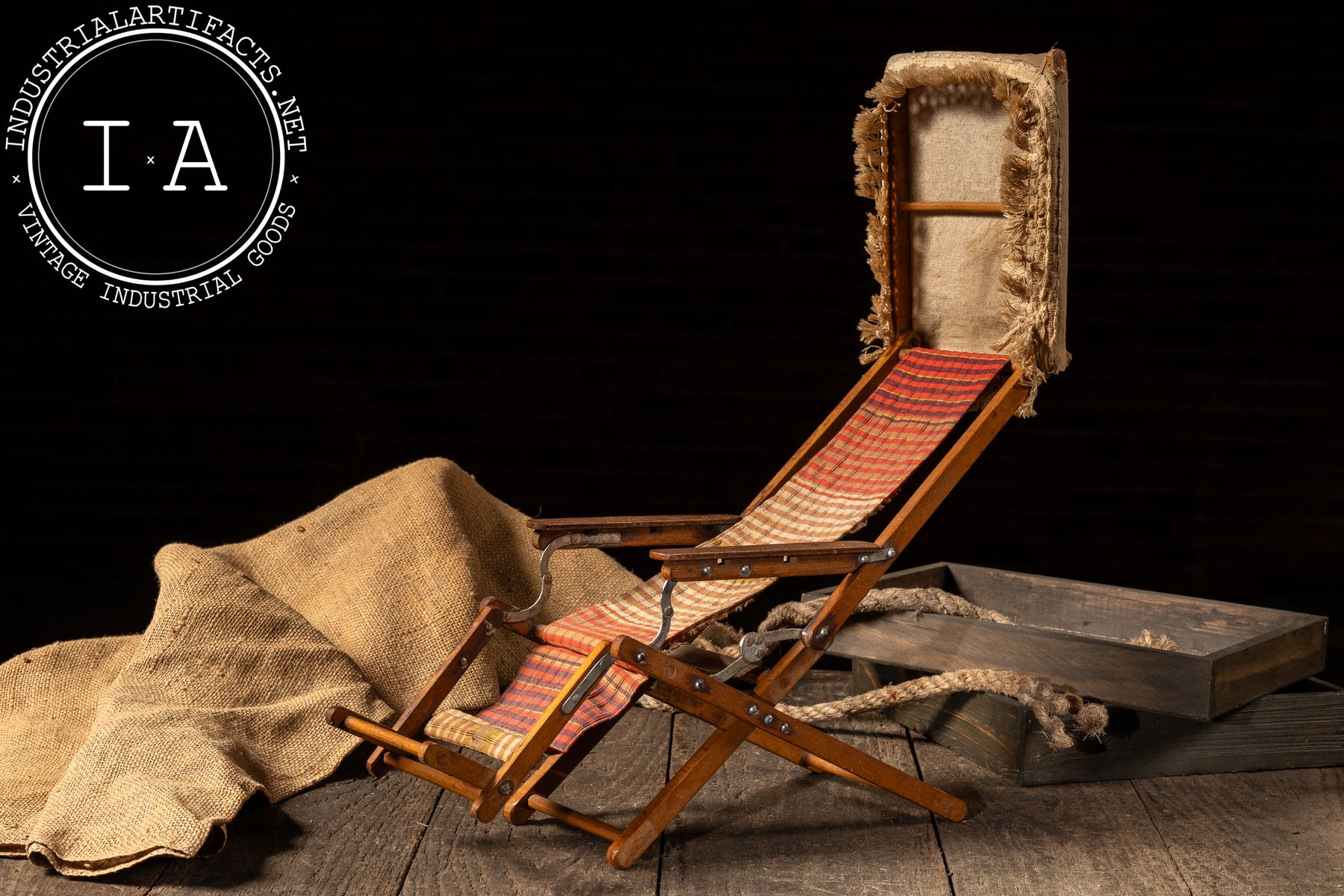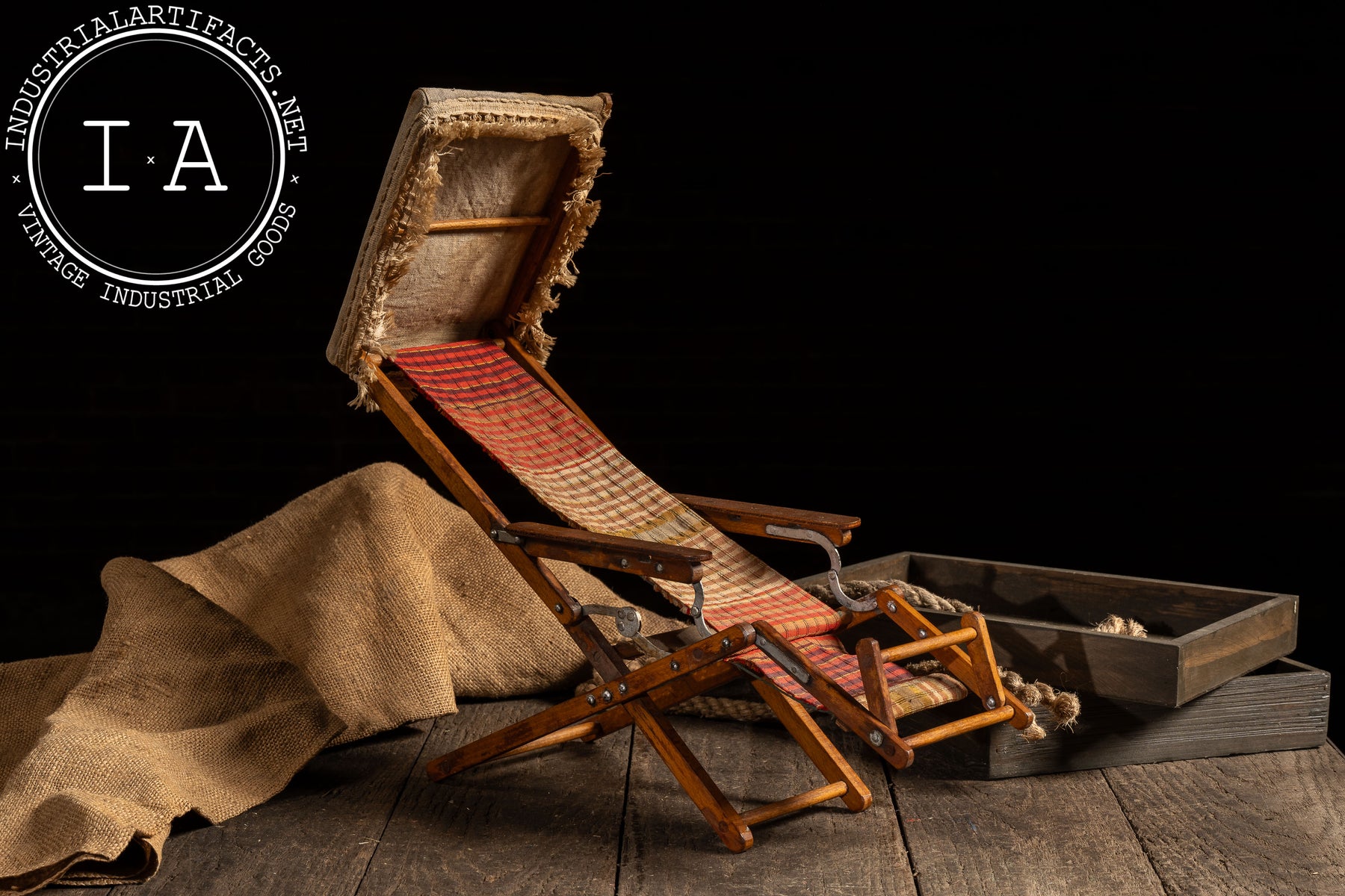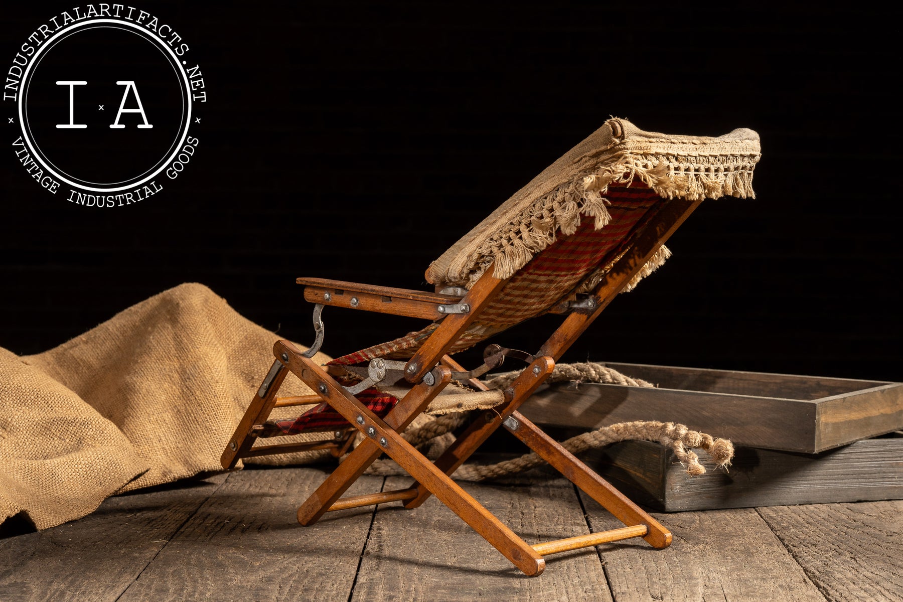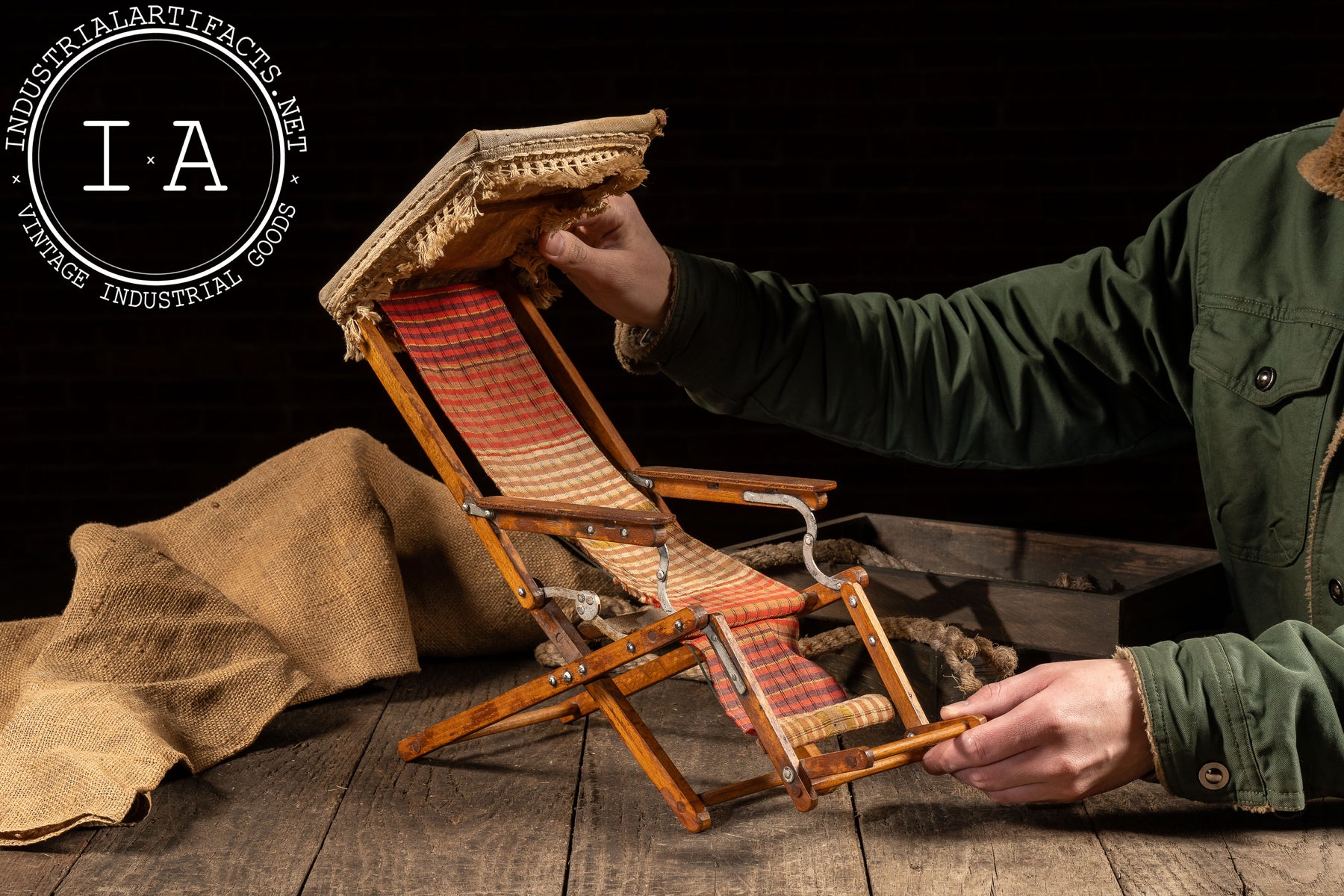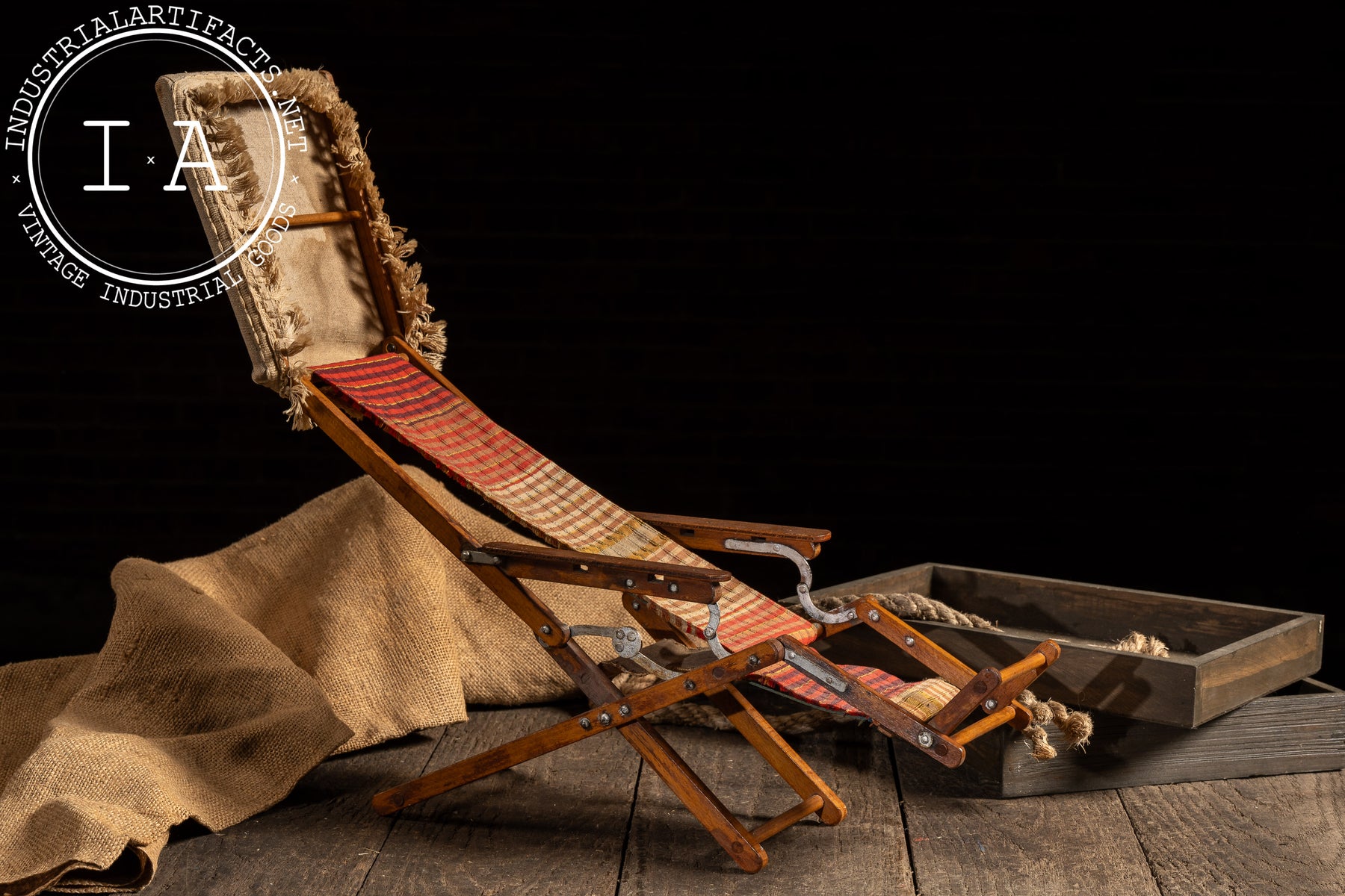 Miniature folding beach lounge chair produced as a salesman sample, constructed in wood with articulated metal hardware and a woven plaid textile sling seat. The chair mirrors full-size resort and seaside lounge furniture of the period, complete with adjustable reclining mechanism, folding leg supports, and an upholstered headrest canopy. Designed to demonstrate form, function, and materials at point of sale, the piece captures the mechanics and proportions of its larger counterpart in compact scale.