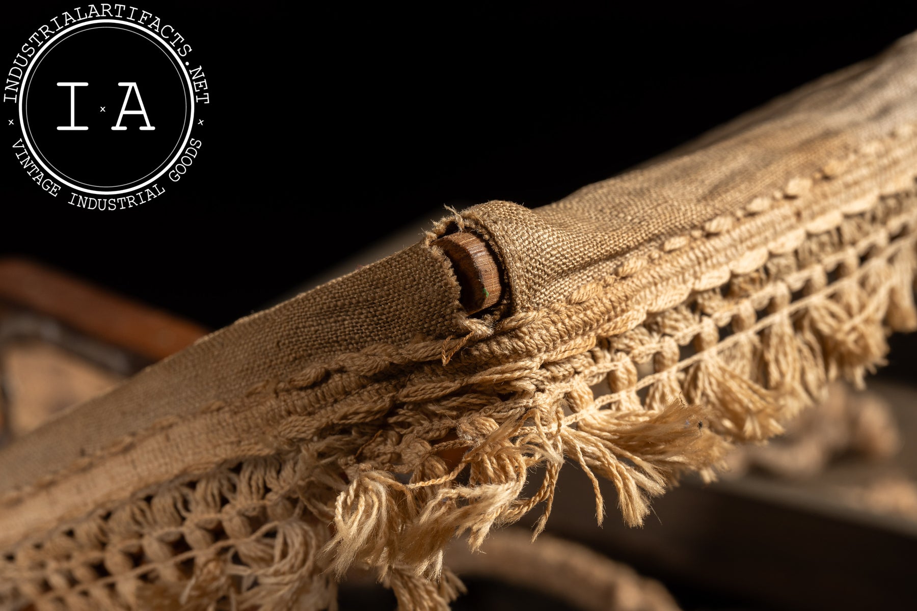 Shows surface wear throughout consistent with age and handling, including fabric wear, fraying along edges, and finish wear to the wood frame. The folding mechanisms operate, though the canopy above the headrest does not remain upright. Structurally stable and displays well.