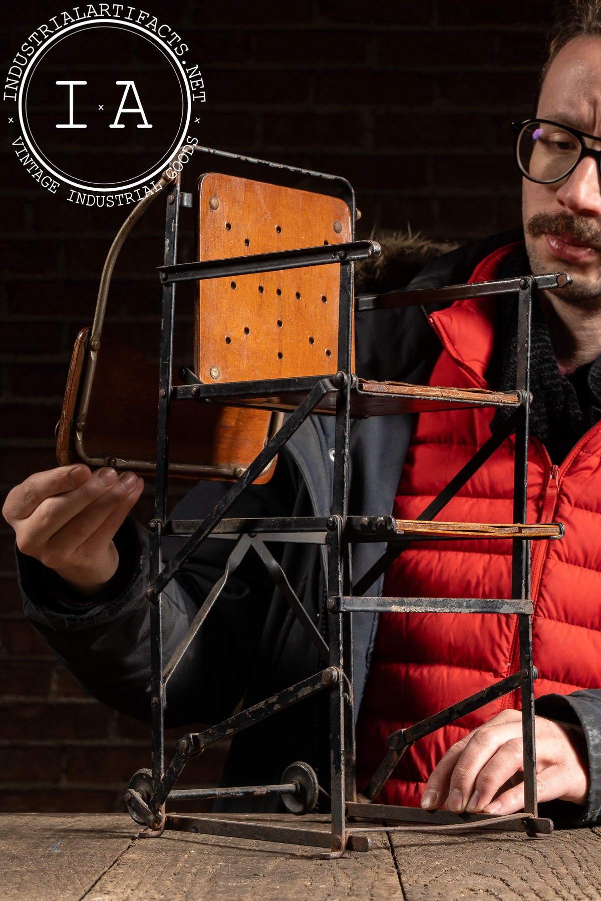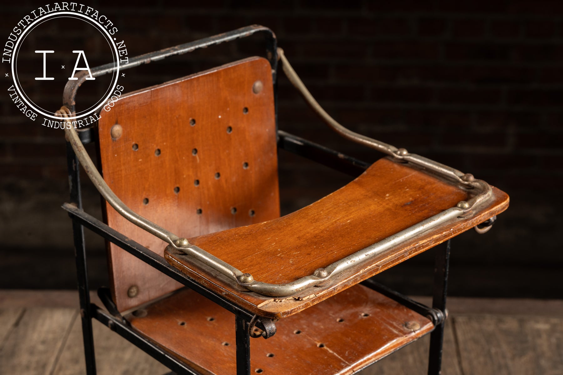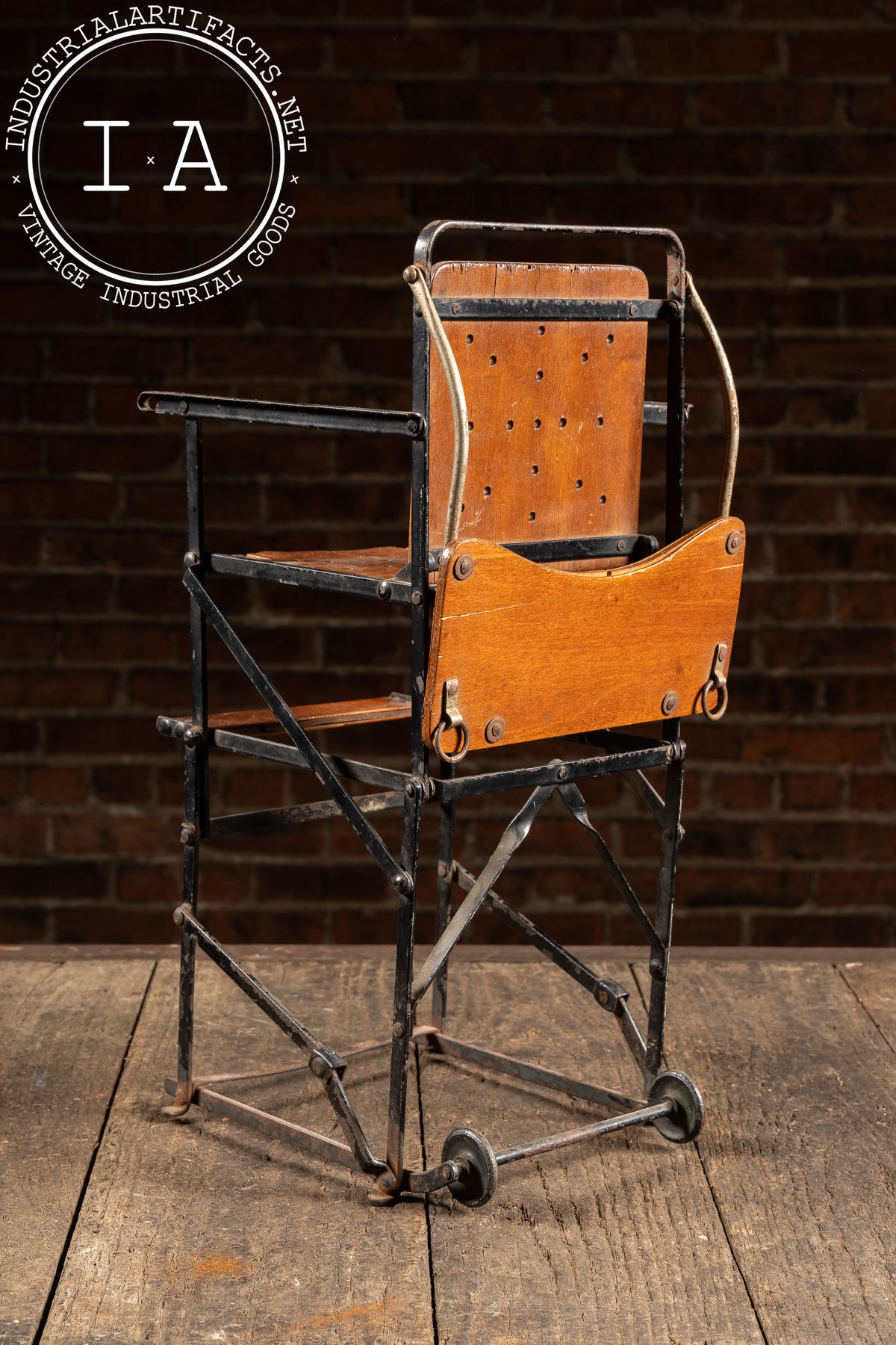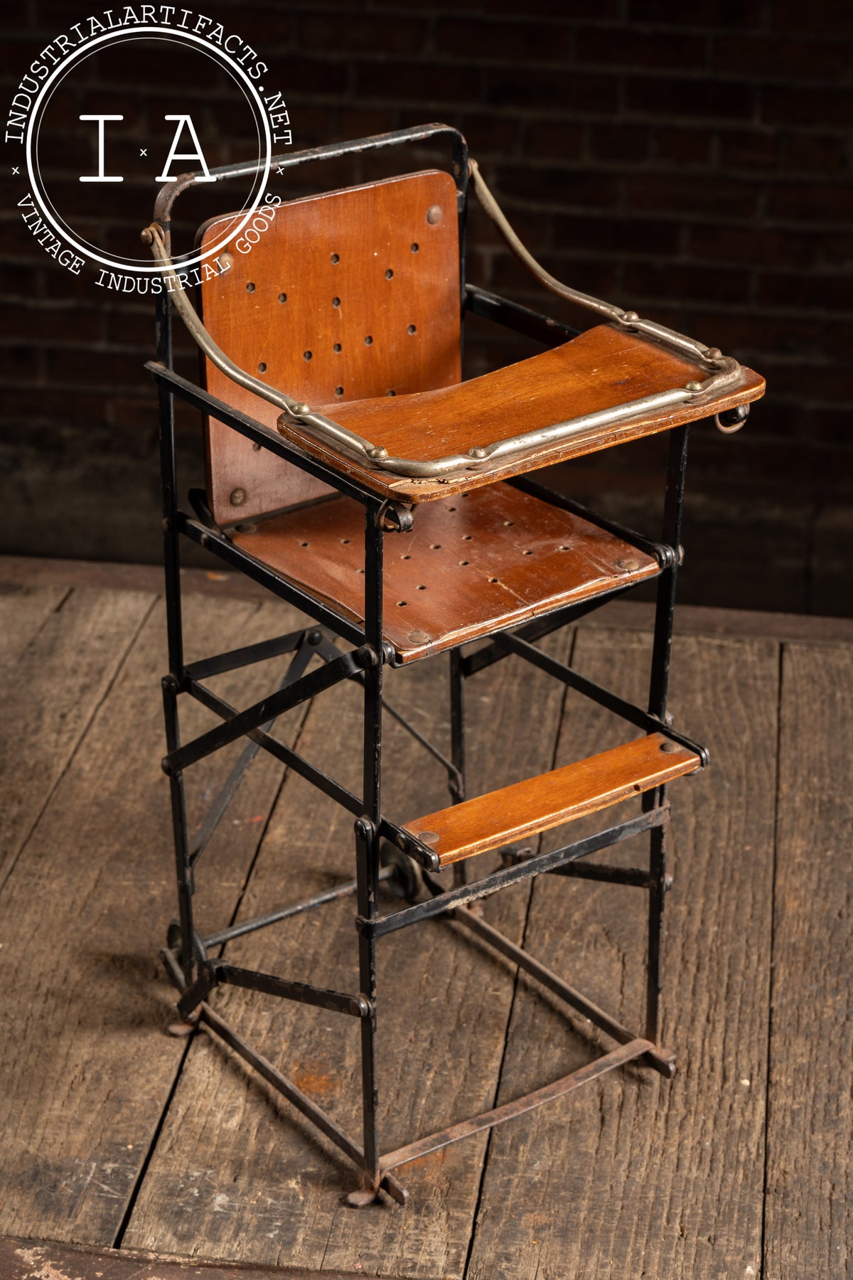 Compact wood-and-metal folding highchair constructed to demonstrate a collapsible, accordion-style mechanism. The chair features a perforated wooden seat and backrest, a hinged wooden tray, and a riveted steel frame engineered to fold inward vertically. The lower frame incorporates small rear wheels, allowing the unit to be tilted and rolled when collapsed-an early solution aimed at portability and storage efficiency. The exposed linkage arms, pivot points, and bracing are intentionally legible, suggesting this piece functioned as a salesman's sample or developmental model used to illustrate mechanical advantages and space-saving design to buyers, retailers, or manufacturers. Its proportions and execution indicate demonstration intent rather than child use.
