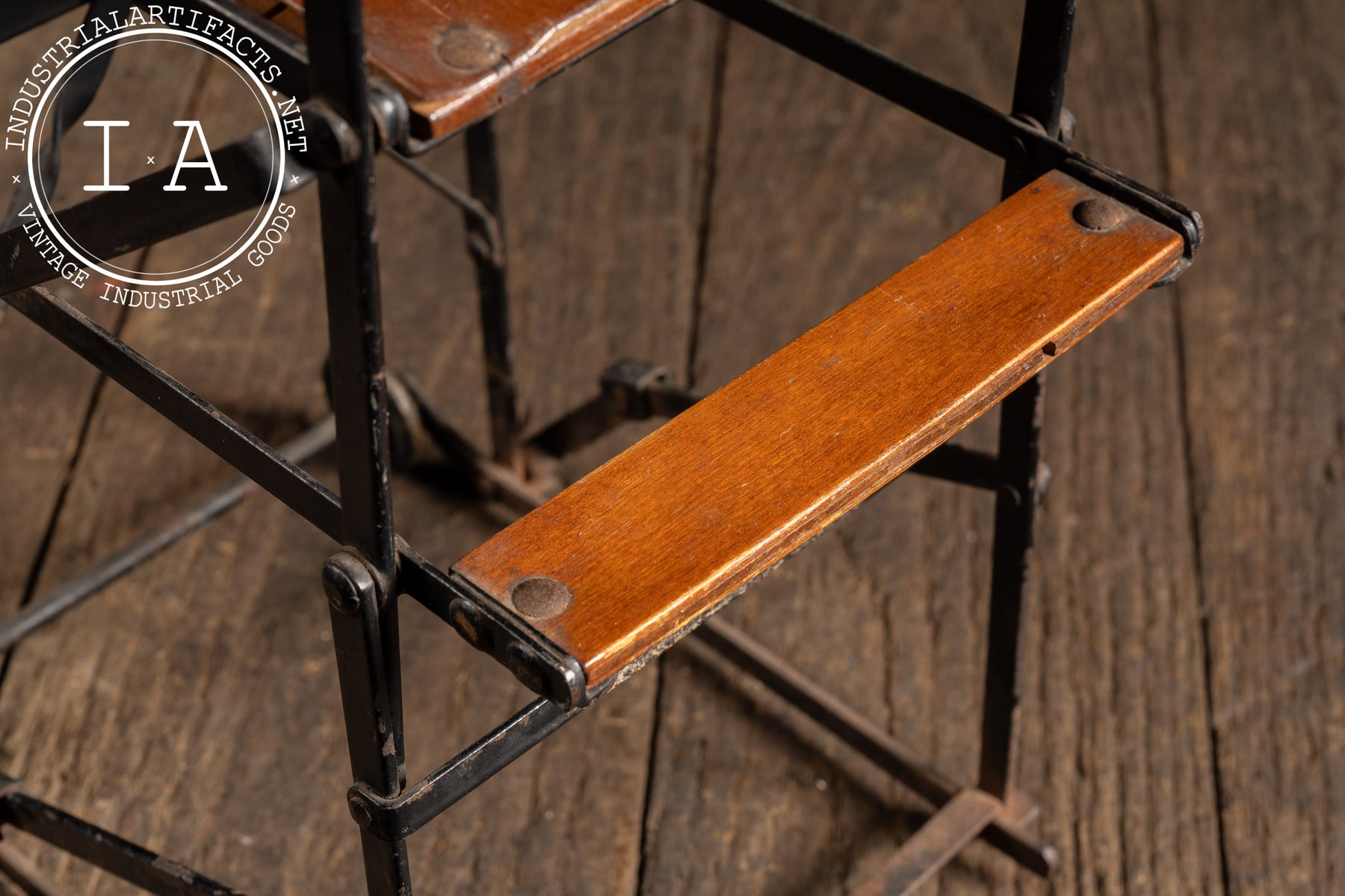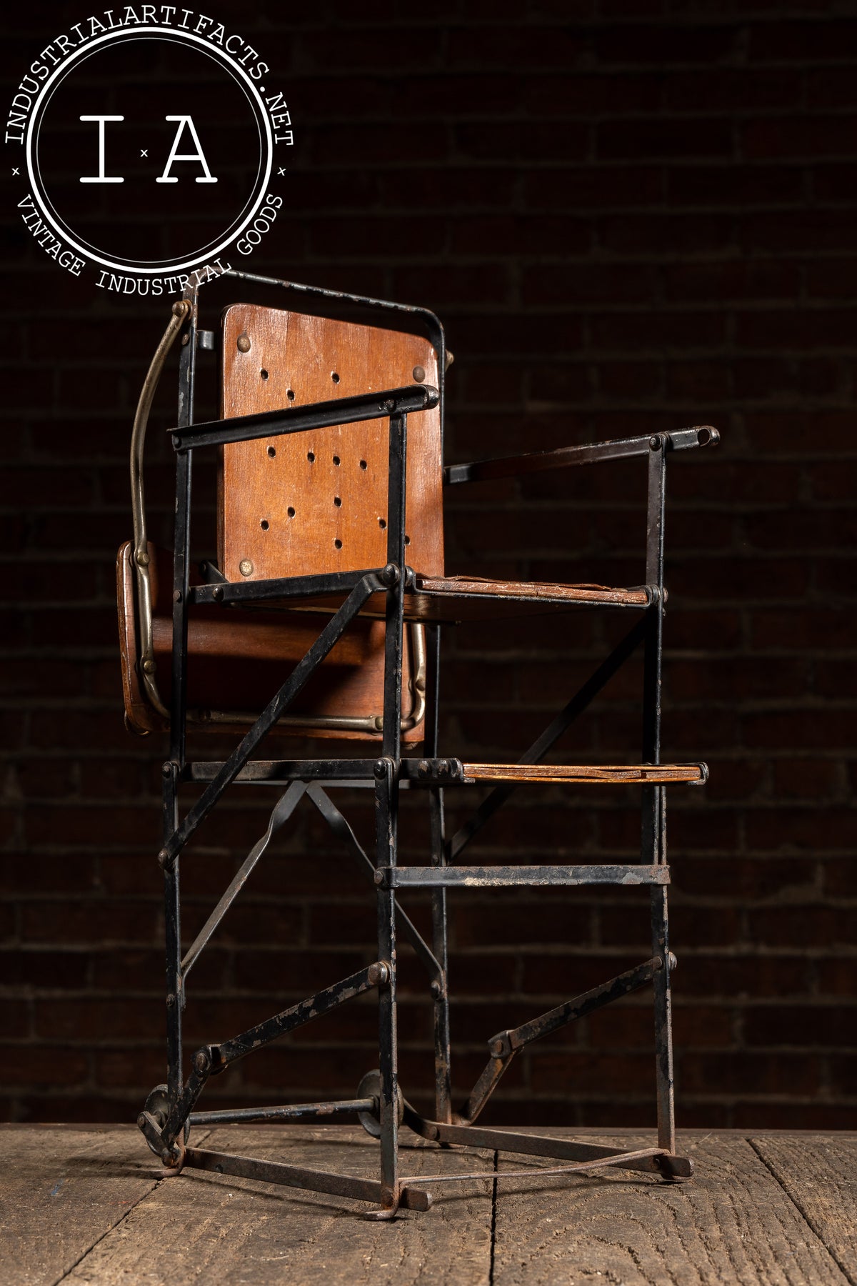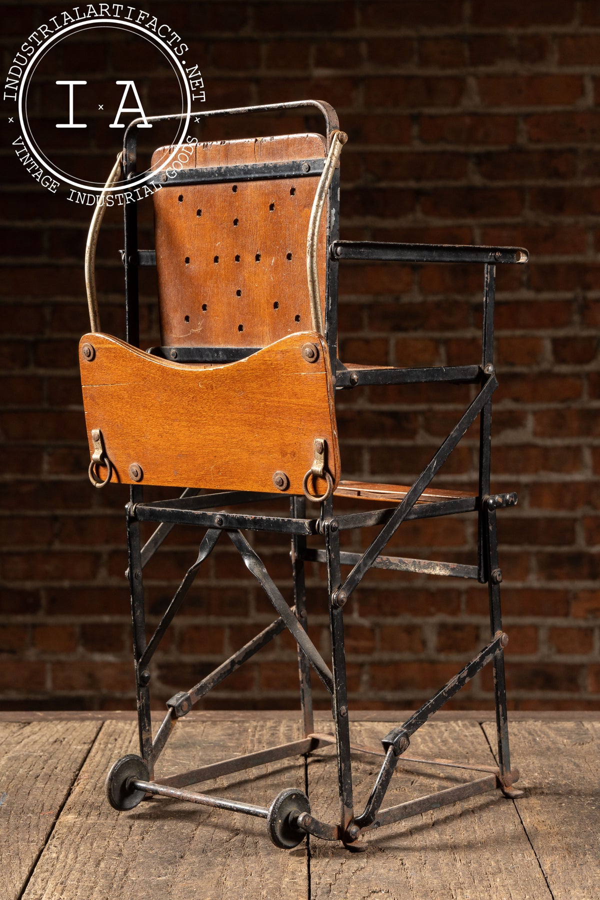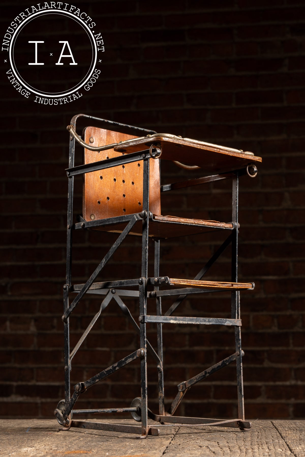 Compact wood-and-metal folding highchair constructed to demonstrate a collapsible, accordion-style mechanism. The chair features a perforated wooden seat and backrest, a hinged wooden tray, and a riveted steel frame engineered to fold inward vertically. The lower frame incorporates small rear wheels, allowing the unit to be tilted and rolled when collapsed-an early solution aimed at portability and storage efficiency. The exposed linkage arms, pivot points, and bracing are intentionally legible, suggesting this piece functioned as a salesman's sample or developmental model used to illustrate mechanical advantages and space-saving design to buyers, retailers, or manufacturers. Its proportions and execution indicate demonstration intent rather than child use.