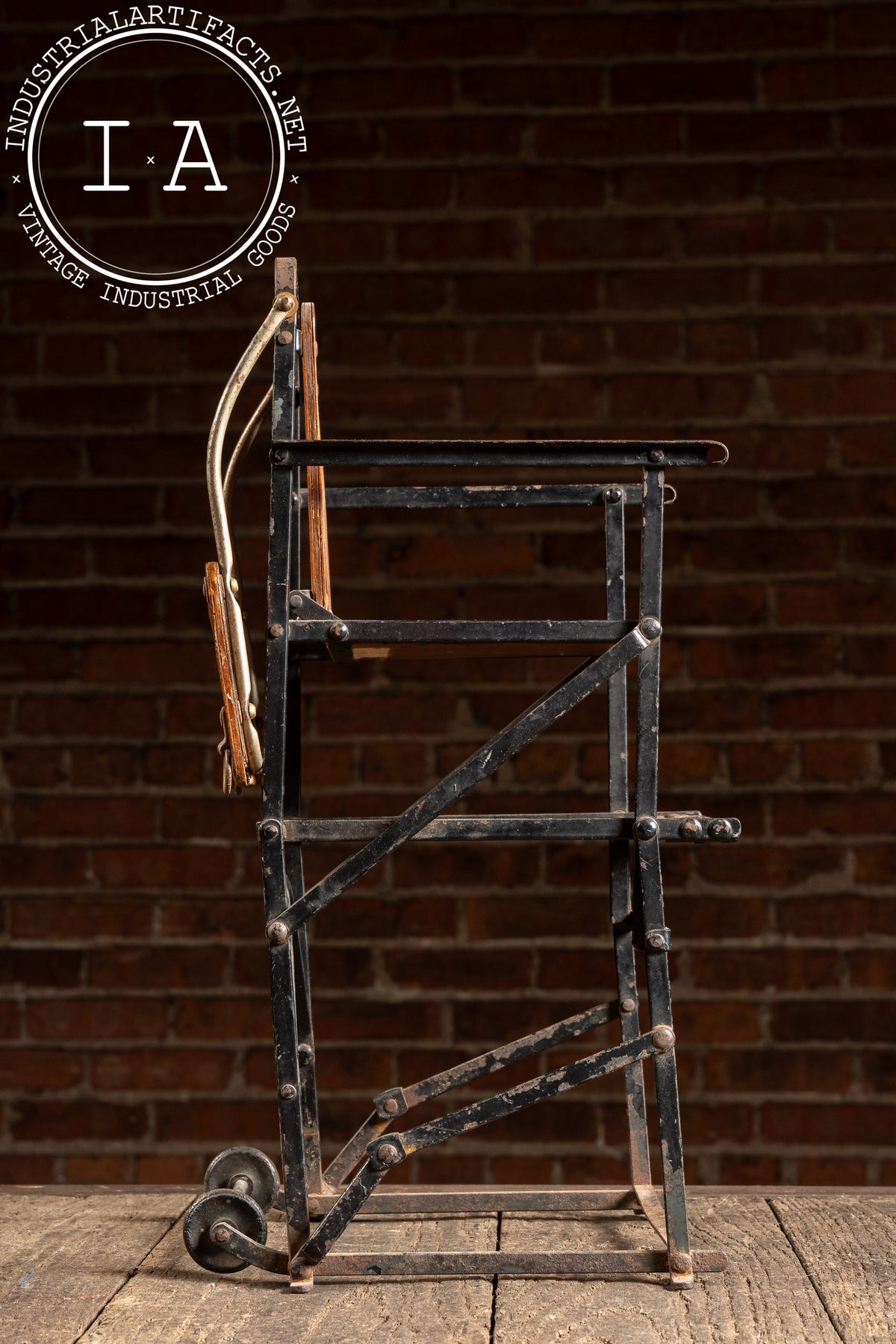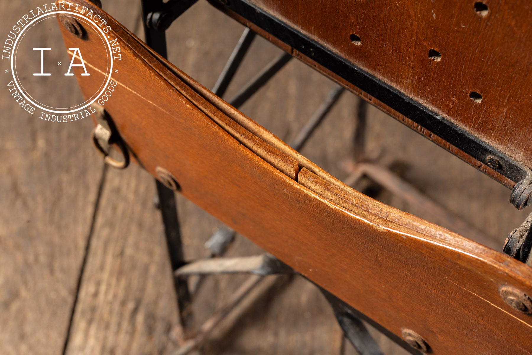 Good overall condition with visible wear consistent with age and demonstration use. Surface wear and finish loss present on the wooden elements; oxidation and paint loss evident on the metal frame. The structure remains intact and displays well; functionality appears largely preserved, though the piece should be considered a display object rather than a functional chair.