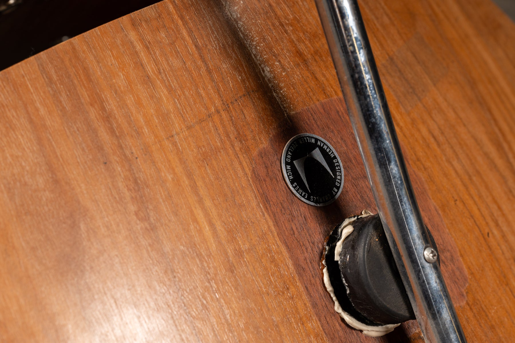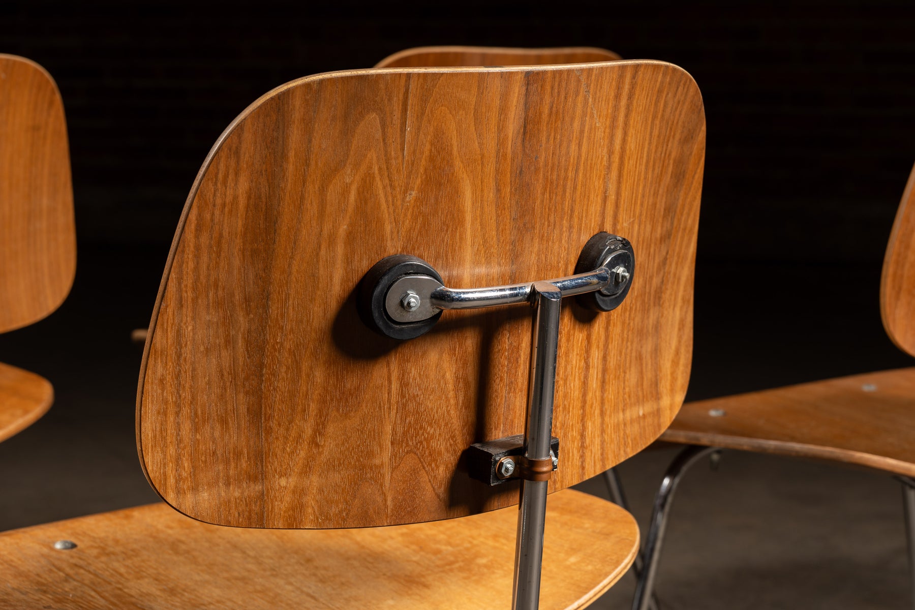 Nutwood and chrome DCM (Dining Chair Metal) dining chair designed by Charles and Ray Eames in 1946 for Herman Miller. This iconic chair features the classic mid-century look people have come to associate with Eames. It features a molded walnut veneer supported by a polished chrome frame.