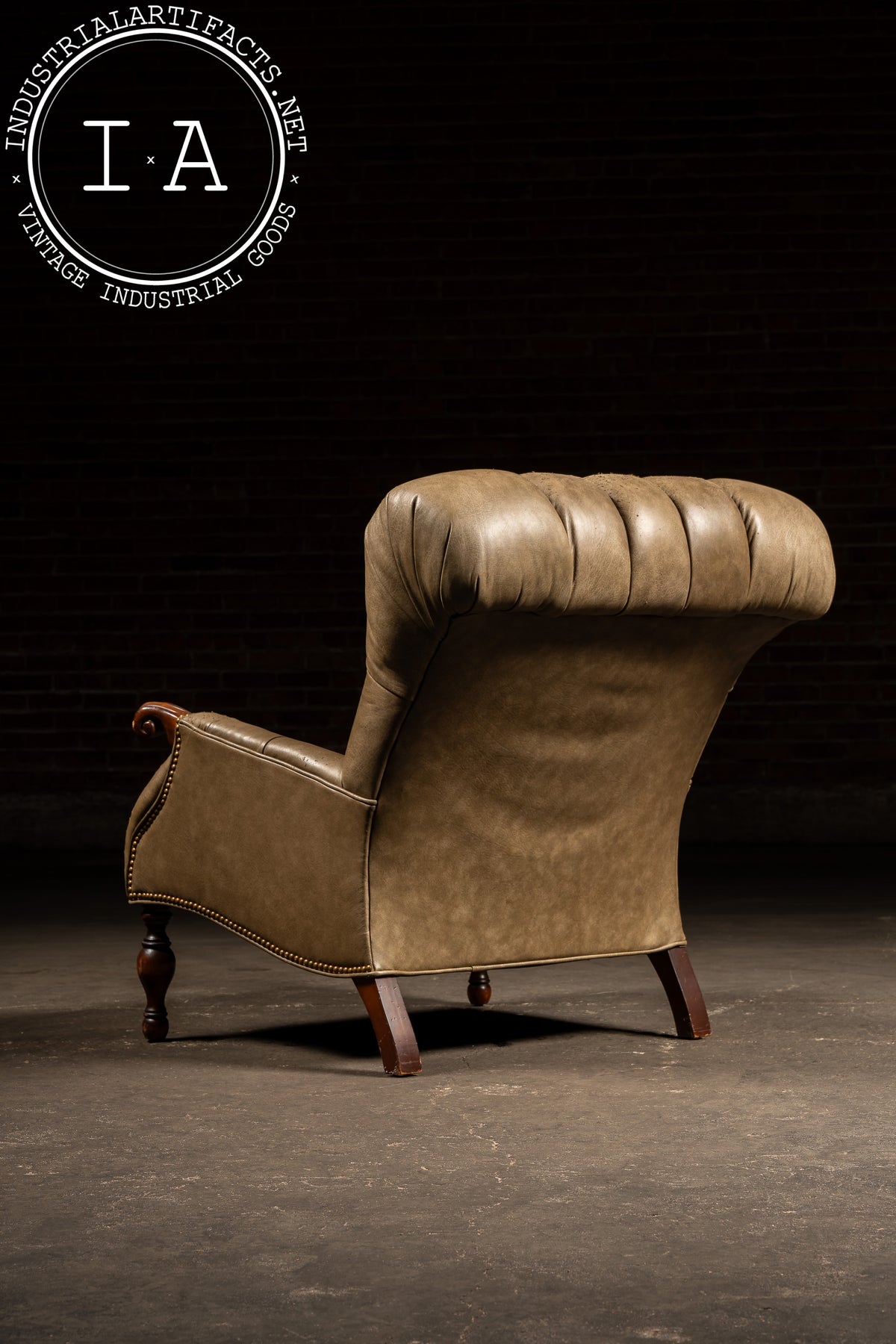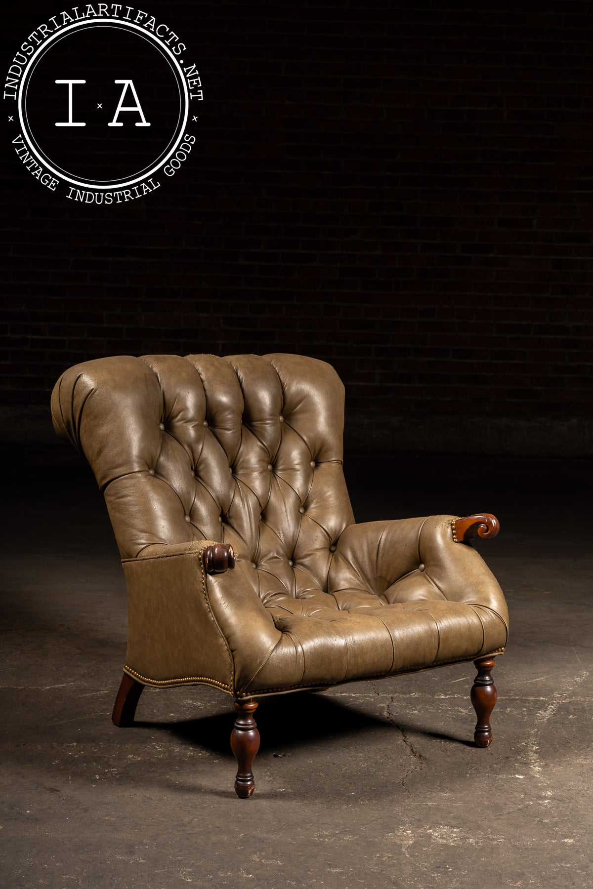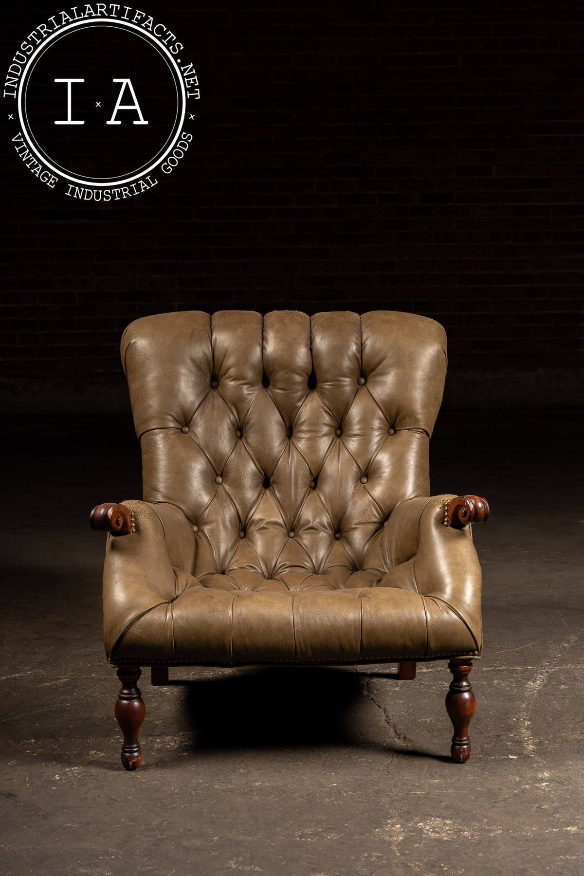 Classic leather Sleepy Hollow chair characterized by its deep, low-slung seat, pronounced recline, and enveloping, high tufted back designed for relaxed lounging. Upholstered in warm brown leather, the chair features traditional diamond tufting across the back and seat, rolled arms with carved wooden terminals, and nailhead trim outlining the lower apron. Turned front legs and subtly splayed rear legs reinforce the grounded, lounge-forward stance that defines the Sleepy Hollow form, a silhouette associated with smoking rooms, libraries, and club interiors of the early 20th century.