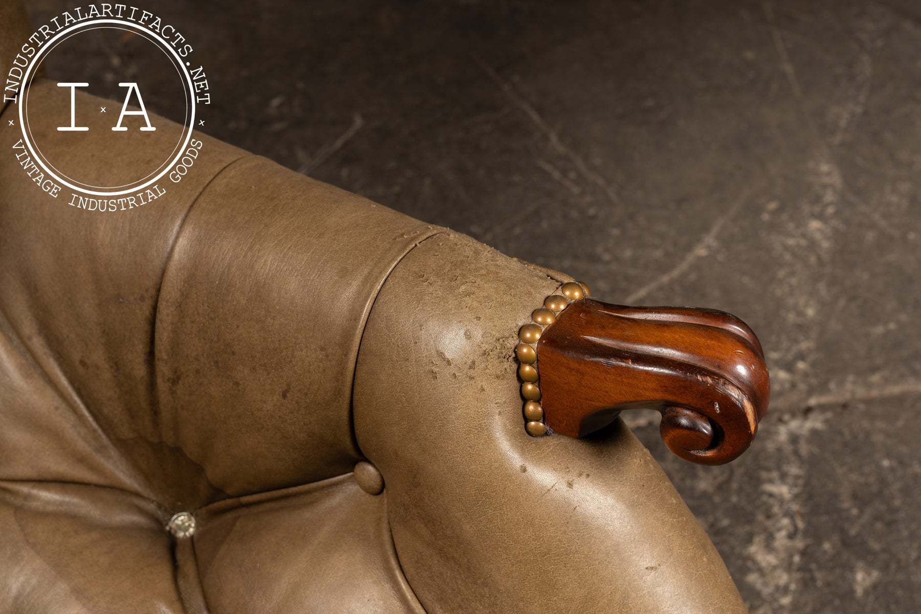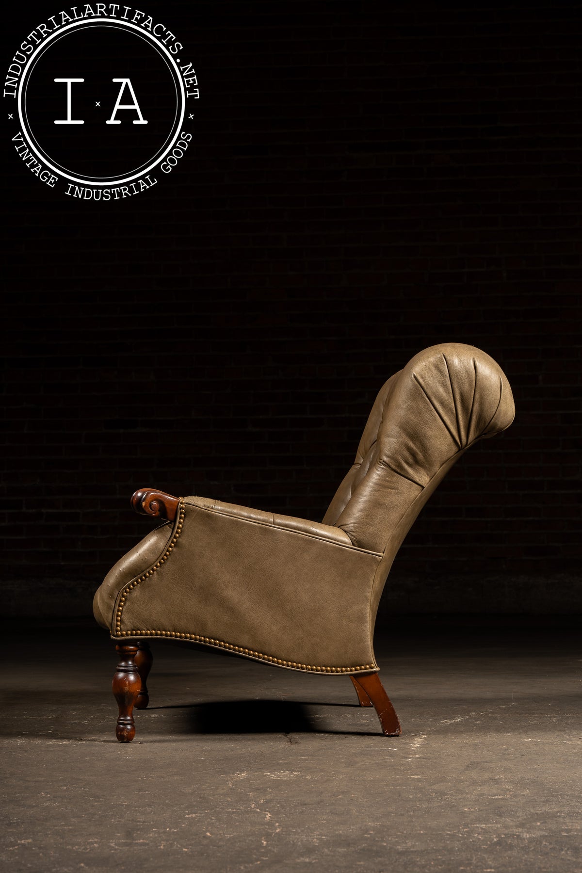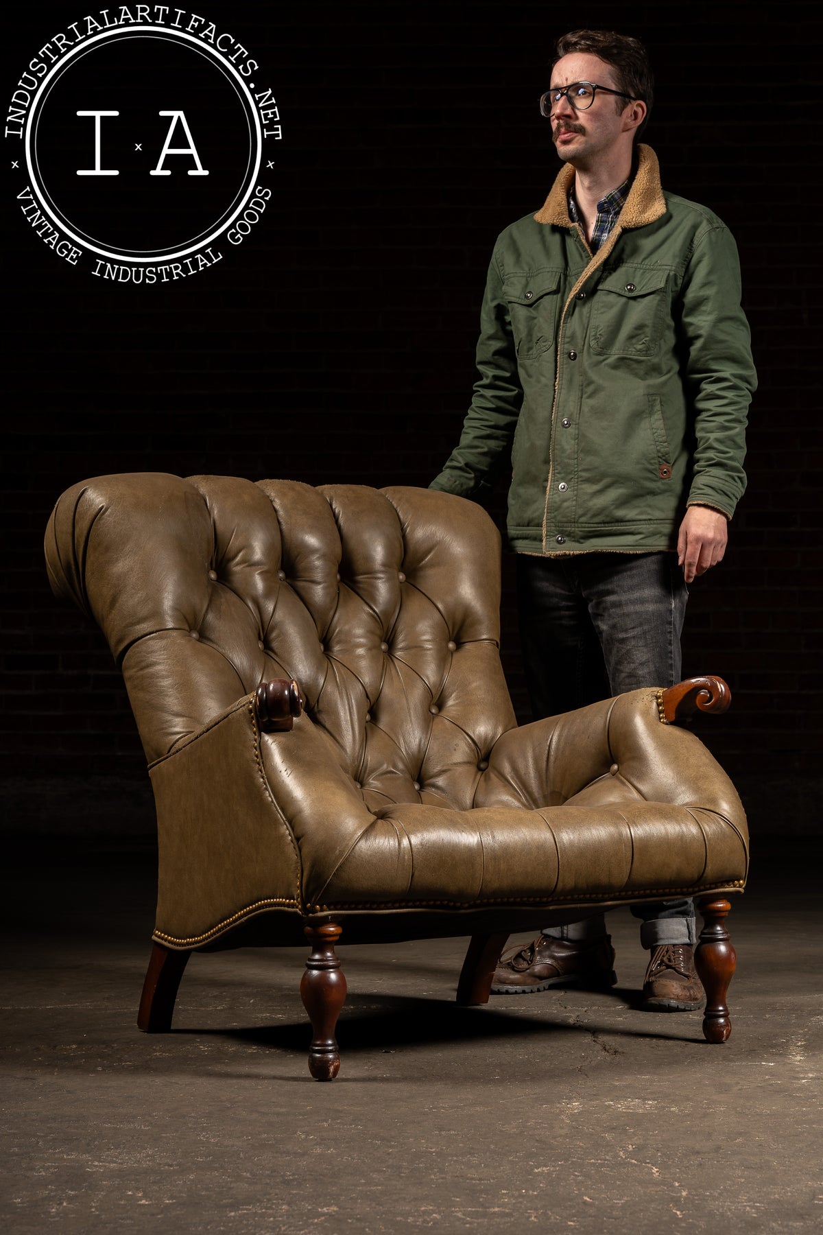Classic leather Sleepy Hollow chair characterized by its deep, low-slung seat, pronounced recline, and enveloping, high tufted back designed for relaxed lounging. Upholstered in warm brown leather, the chair features traditional diamond tufting across the back and seat, rolled arms with carved wooden terminals, and nailhead trim outlining the lower apron. Turned front legs and subtly splayed rear legs reinforce the grounded, lounge-forward stance that defines the Sleepy Hollow form, a silhouette associated with smoking rooms, libraries, and club interiors of the early 20th century.