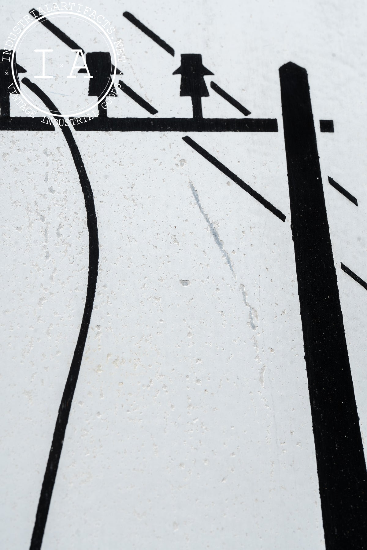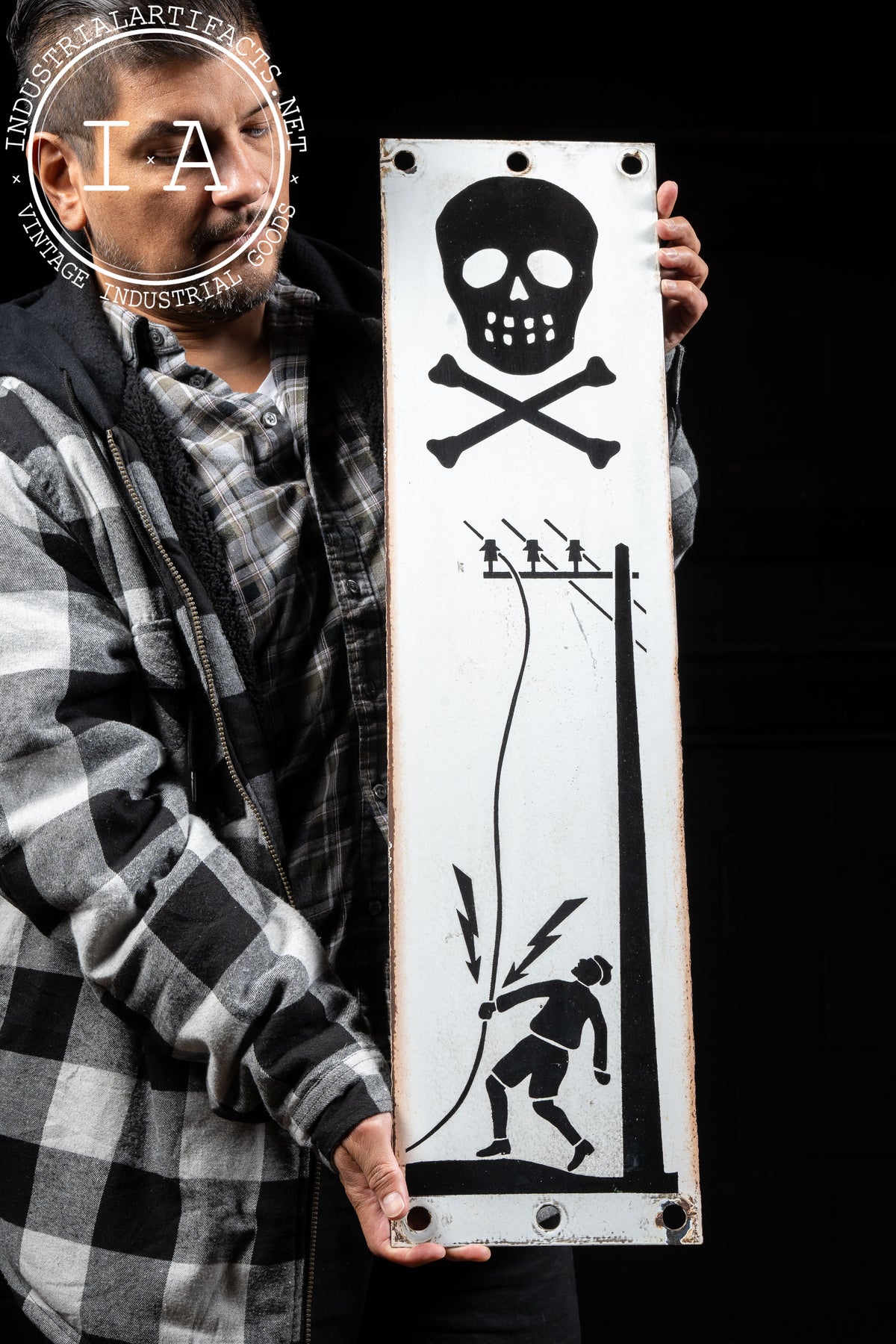 This piece is an early example of a warning sign for potential power line hazards, as evidenced by the utility pole graphic and uniquely-designed human figure. Features an enameled face with black graphics against a white field. Tin sign base.