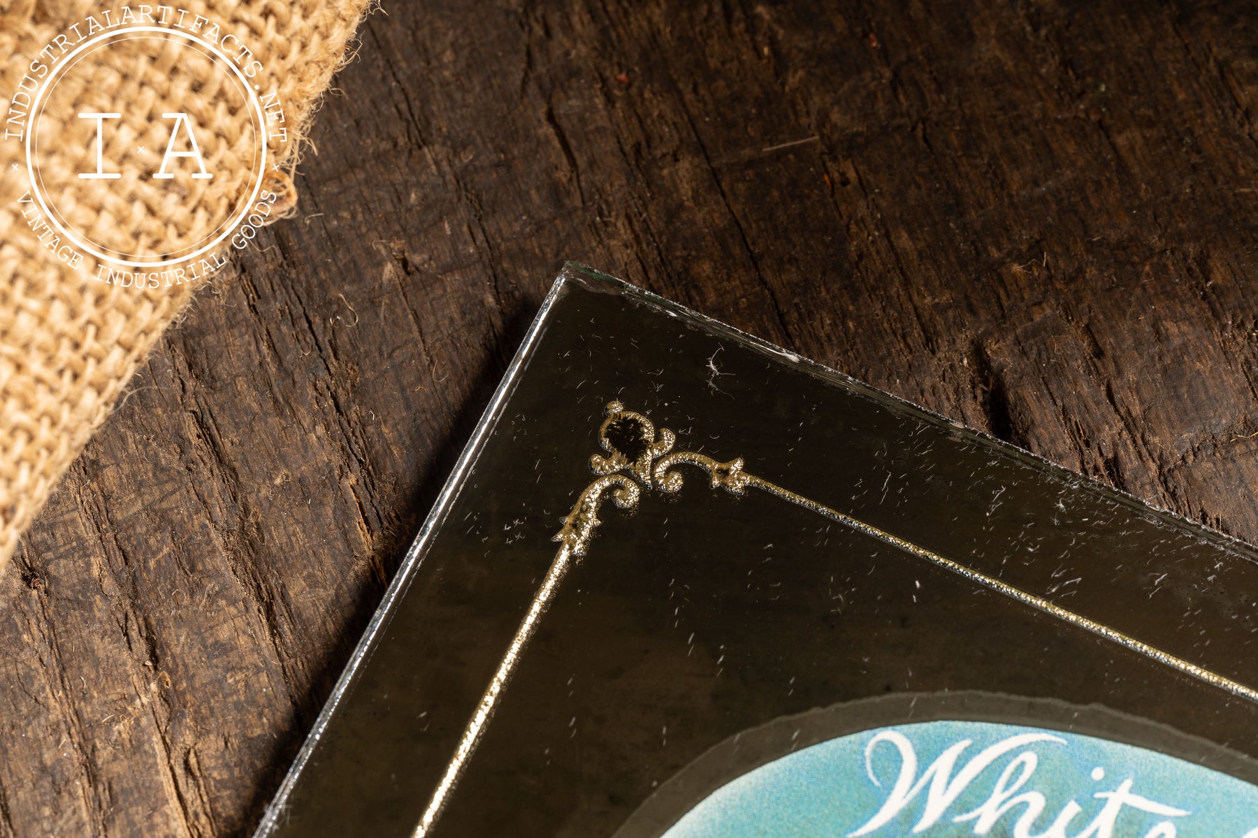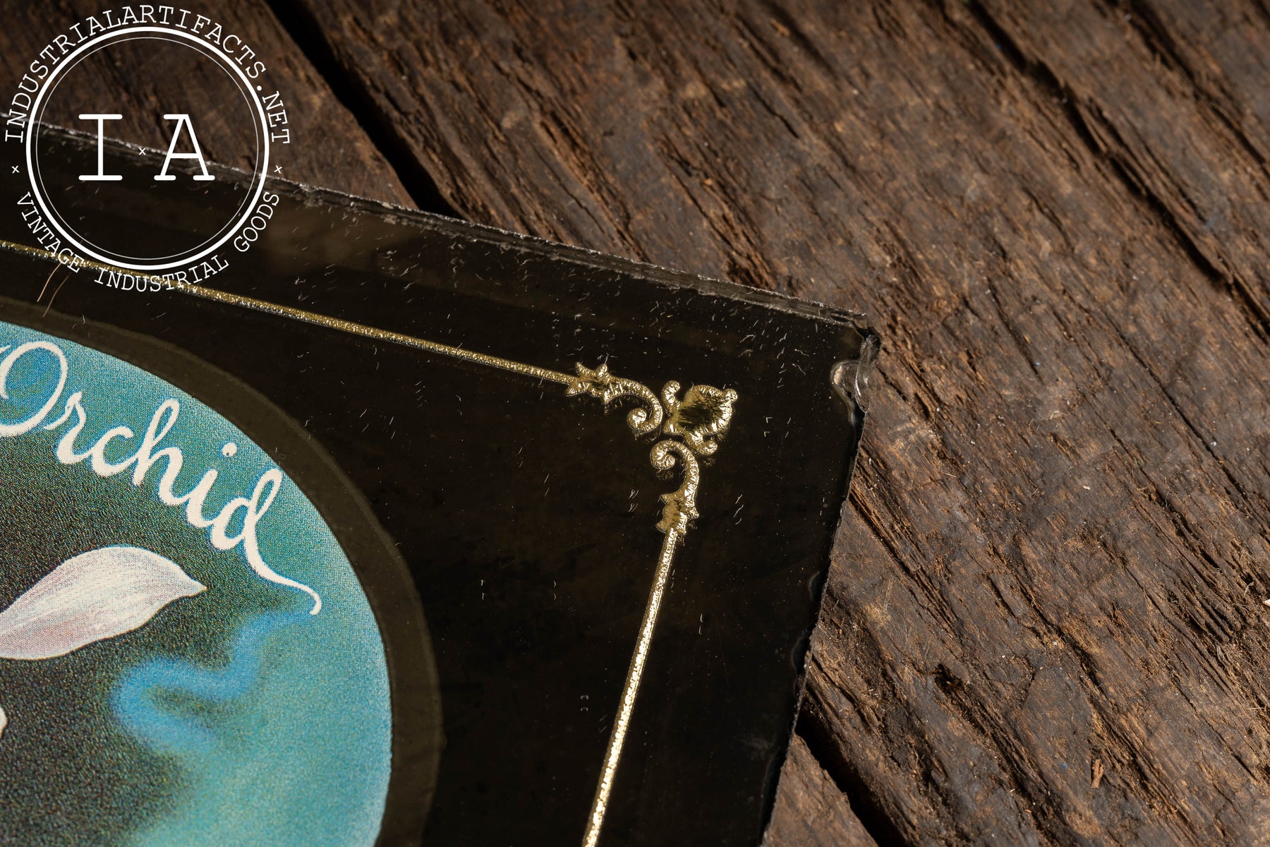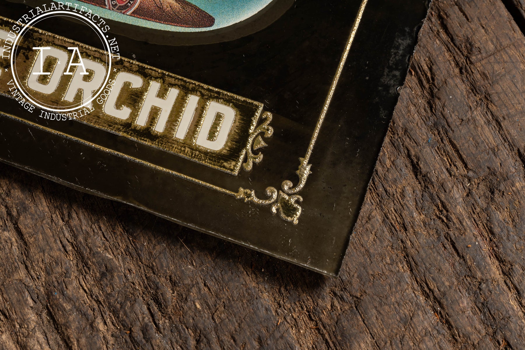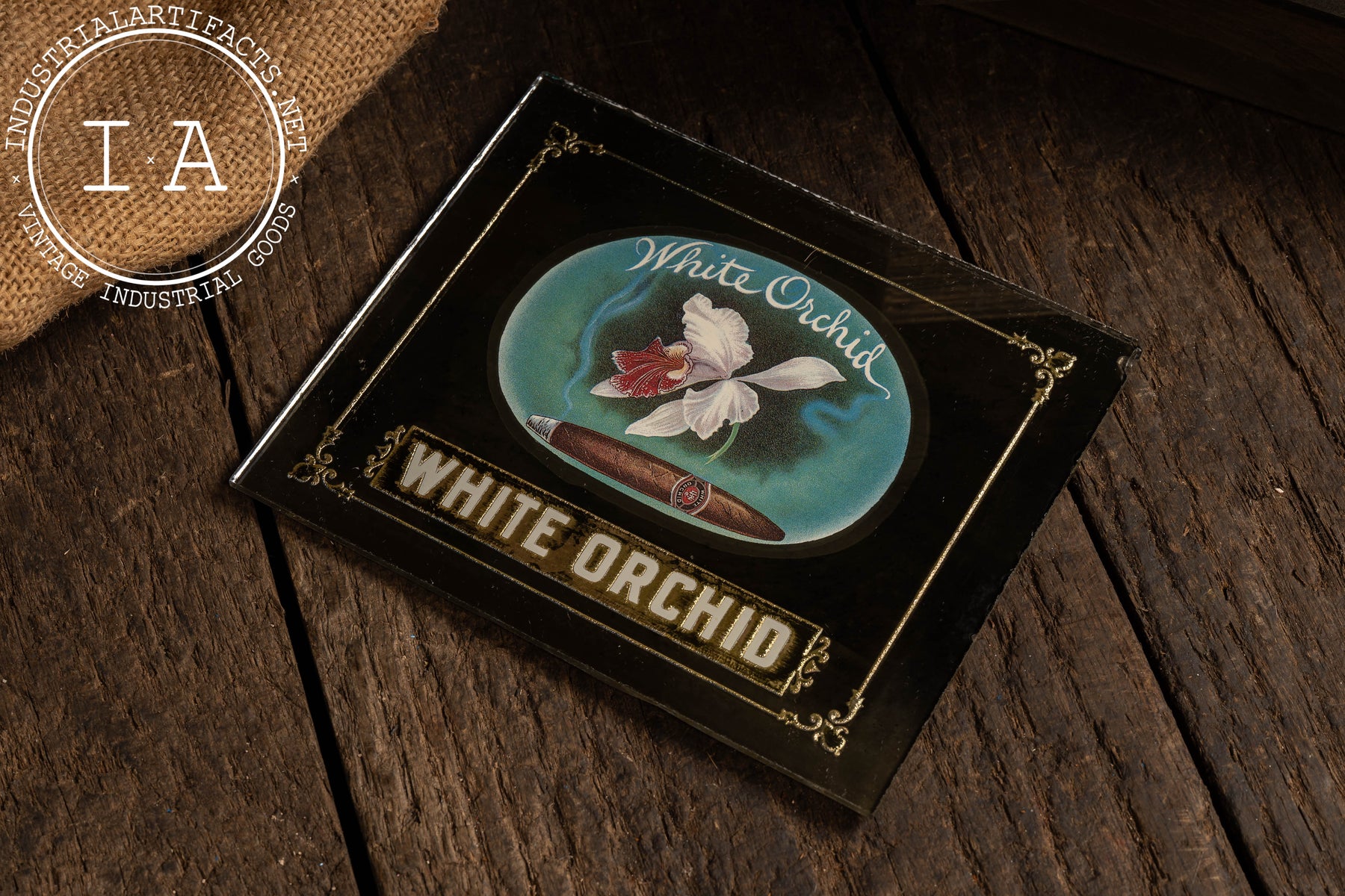 Rectangular mirrored glass advertising sign promoting White Orchid cigars, featuring richly colored printed artwork applied over a reflective mirror backing. The central vignette depicts a blooming white orchid paired with a cigar, floating against the mirrored field and framed by decorative gilt corner flourishes. The mirror backing adds depth and luminosity, catching ambient light and enhancing the contrast of the artwork-an intentional design choice meant to draw attention on tobacconist counters and walls. This combination of mirror and graphic imagery reflects early 20th-century cigar advertising strategies, where visual richness and material quality reinforced perceptions of refinement and premium craftsmanship.
