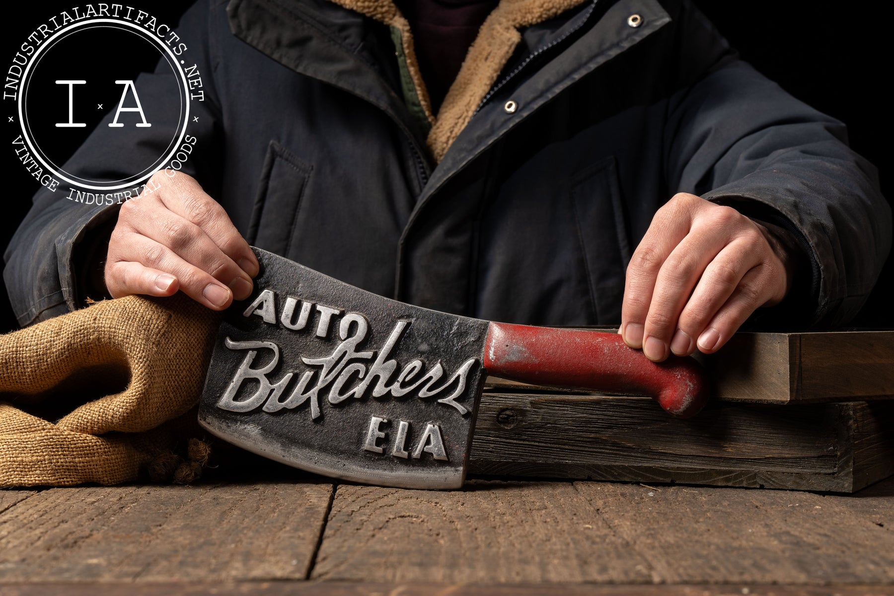 Cast metal cleaver-form plaque bearing the raised lettering "Auto Butchers ELA", finished with contrasting paint and a stylized butcher knife handle. The cleaver motif is the defining symbol of the Auto Butchers, one of the most influential early custom car clubs to emerge from East Los Angeles. The bold, literal imagery reflects the group's philosophy-precision cutting, radical modification, and unapologetic craftsmanship applied to automobiles in the postwar custom era.