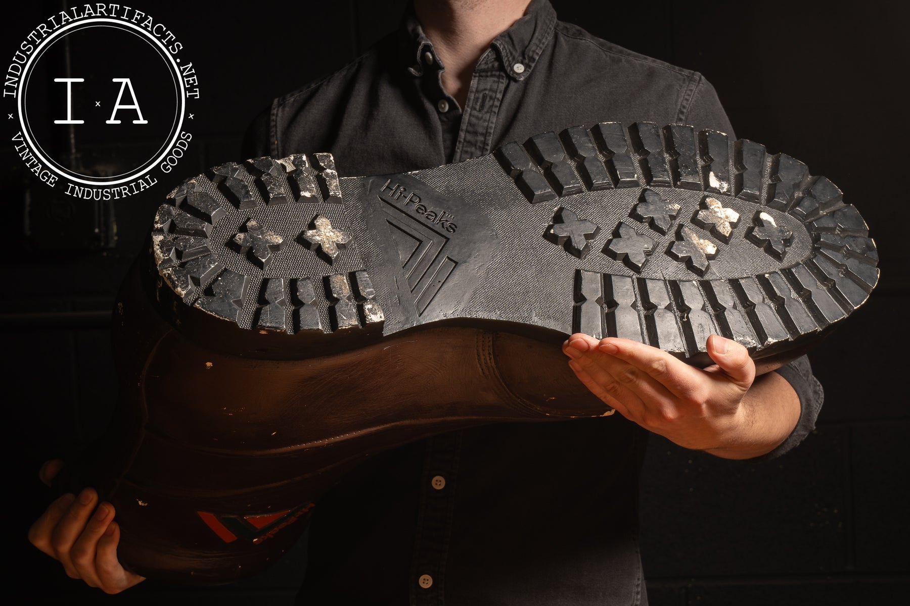 Oversized chalkware boot trade display modeled after Red Wing's "Hi‑Peaks" outdoor boot, complete with molded laces, brass‑tone eyelets, lug sole, and green‑and‑orange mountain badge.