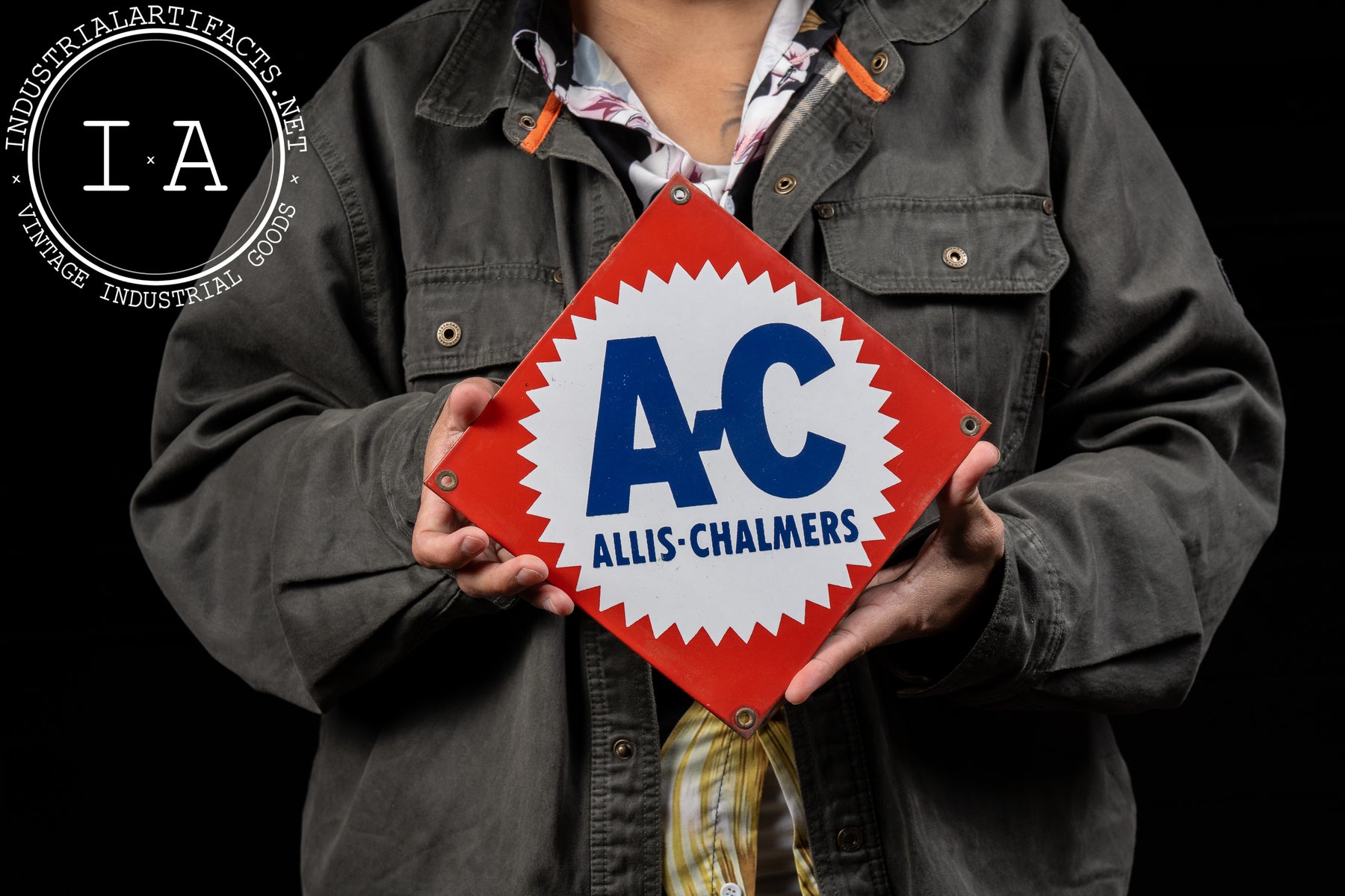 This piece features the second-to-last logo used by Allis-Chalmers, first seen in 1949. Unique to sign design, this square sign is flipped on its corner to accomodate the shape of the logo.