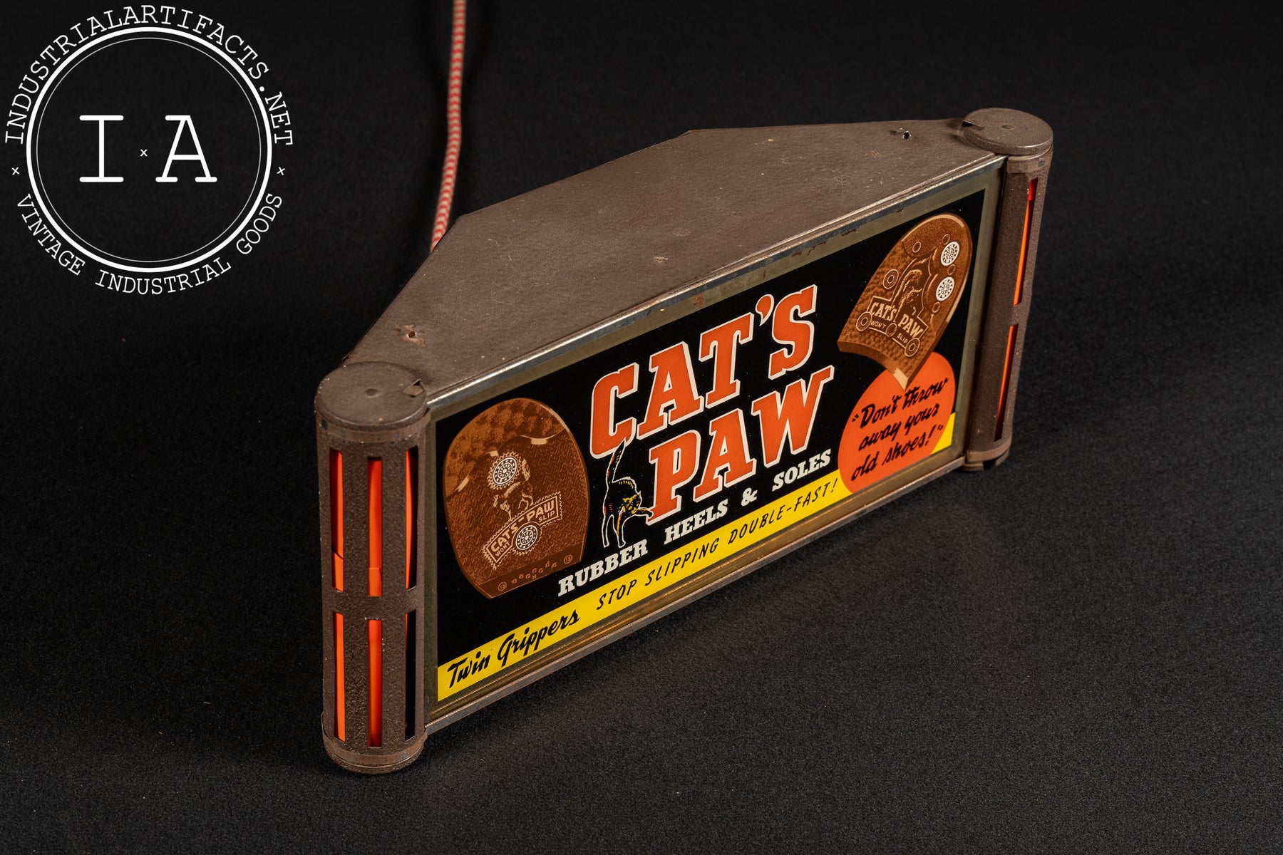 Single-sided illuminated advertising sign featuring a reverse-on-glass (ROG) panel for Cat's Paw rubber heels and soles. The bold red-and-white lettering is flanked by images of the brand's signature rubber heel inserts, alongside the iconic black cat mascot. The slogan "Twin Grippers Stop Slipping Double-Fast!" and "Don't throw away your old shoes!" reinforce its original cobbler shop appeal. The glass panel is housed in its original slotted metal canister with orange side accents that glow when lit.