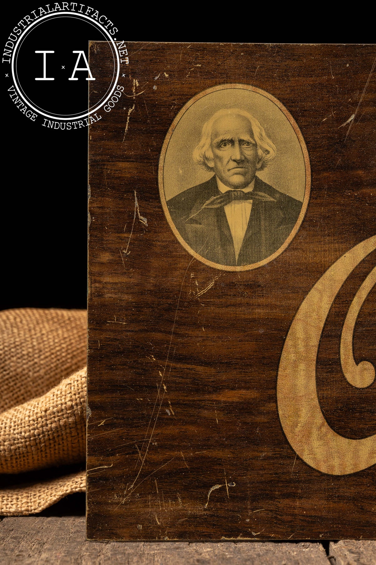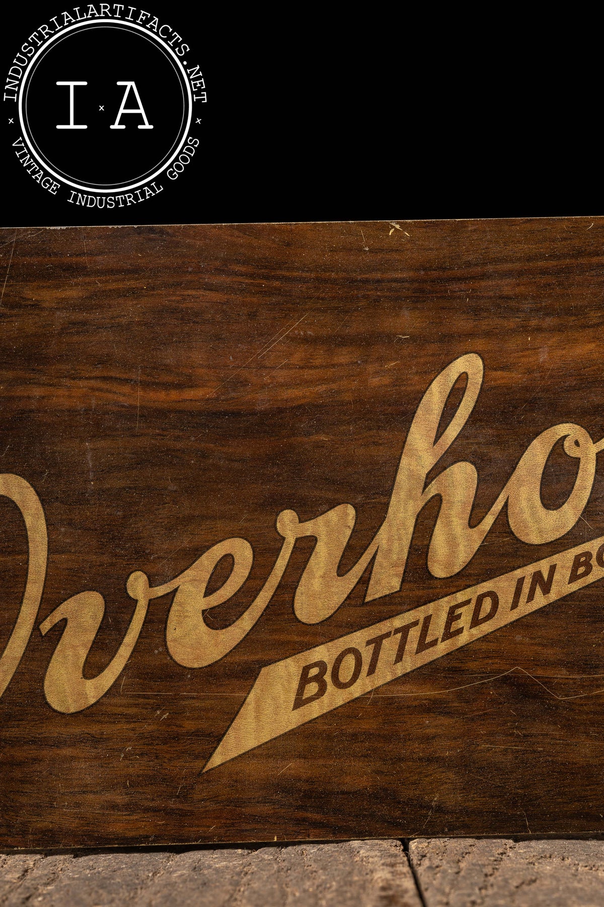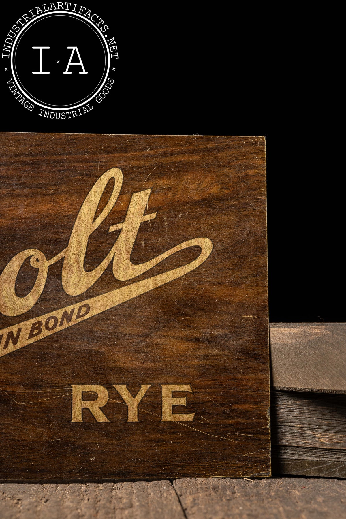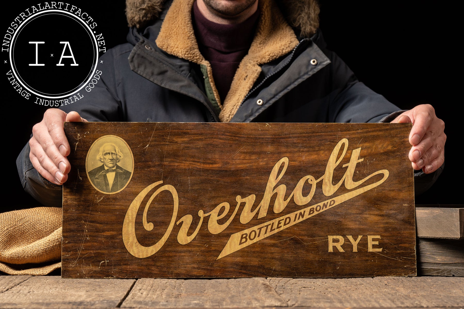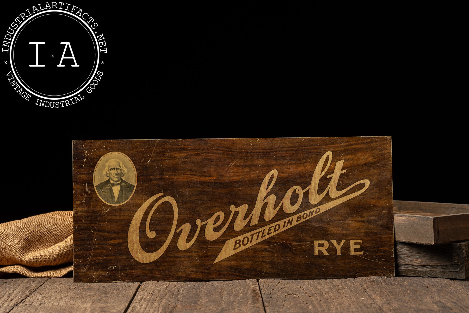 Aluminum advertising sign for Old Overholt Bottled in Bond Rye, featuring bold script lettering and a restrained mid-century layout accented by a small portrait medallion. The faux woodgrain finish printed on aluminum was a common postwar cost-saving and durability-driven approach, allowing the sign to evoke traditional materials while offering improved resistance to moisture and wear. The simple, horizontal format reflects mid-century whiskey advertising priorities, emphasizing brand heritage and federal Bottled in Bond credibility over decorative excess.