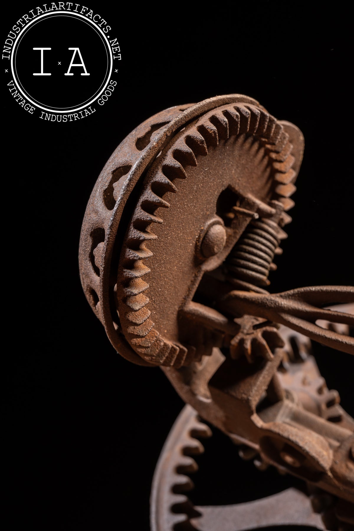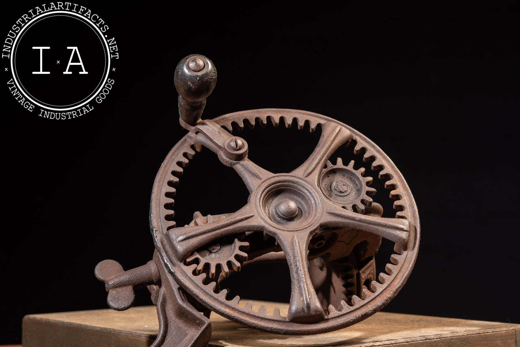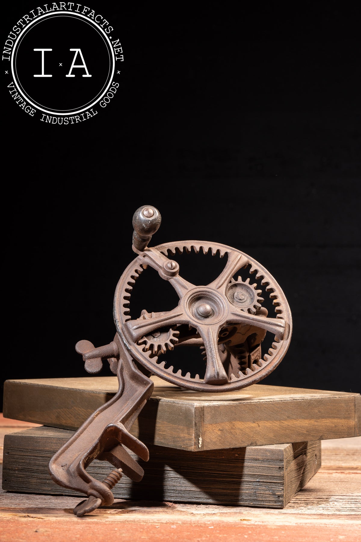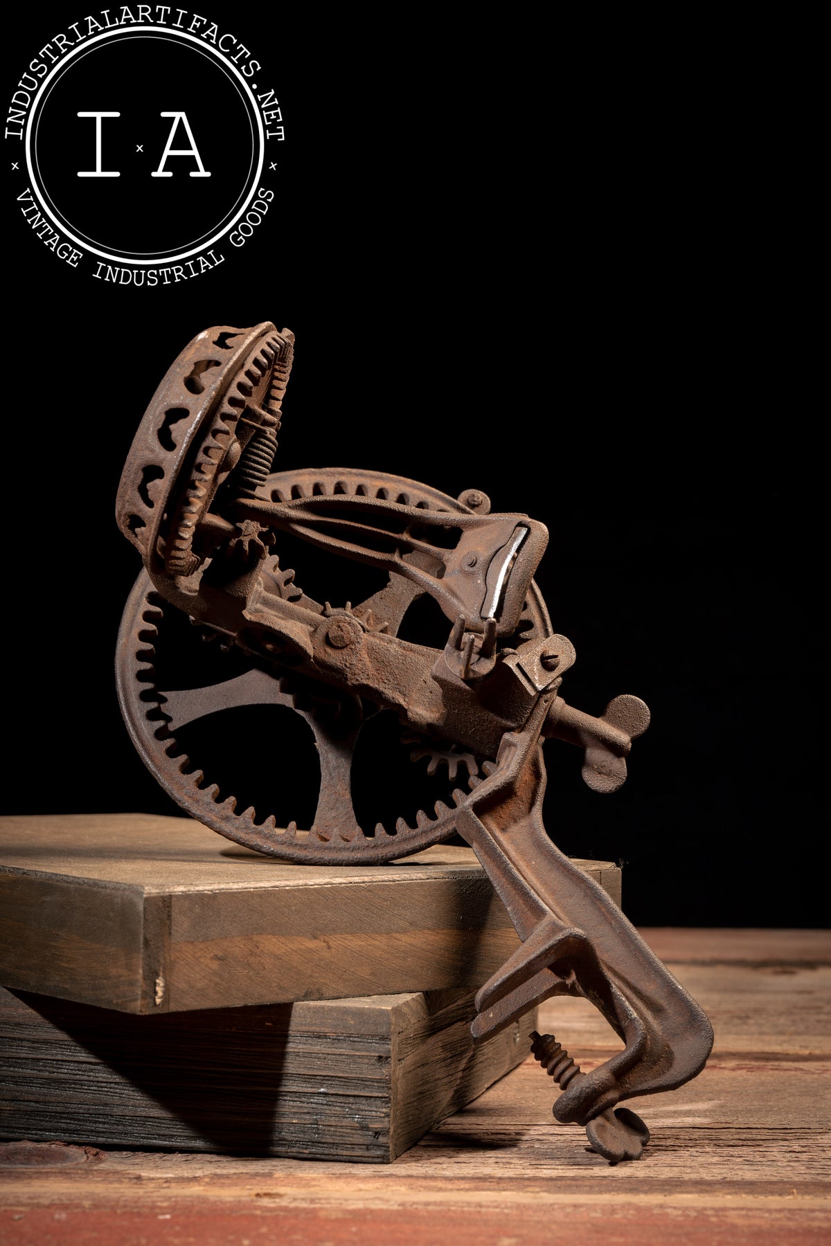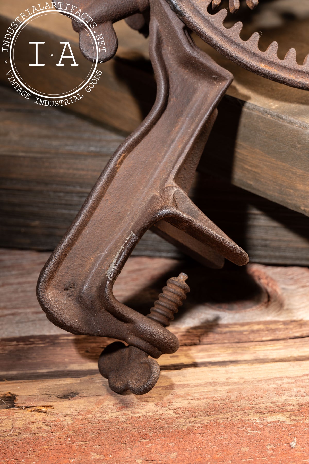 Appears to be in working order with oxidation present throughout, including uniform surface rust and age-consistent wear to the gears, clamp screw, and blade assembly. Structurally solid with intact gearing and handle.