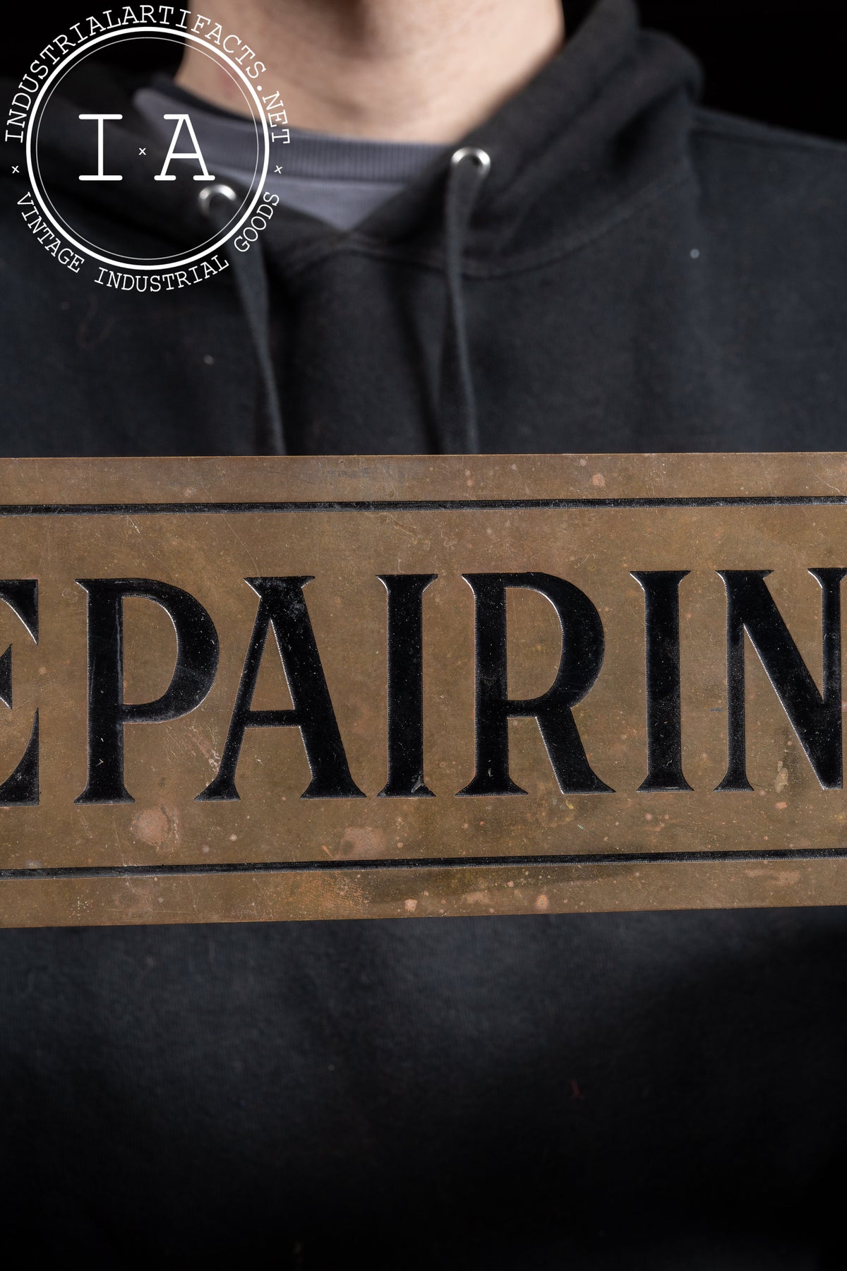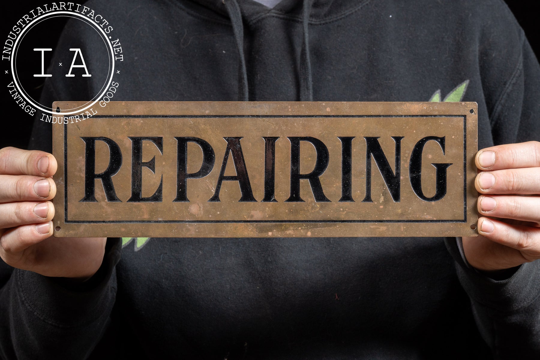 Antique “Repairing” Debossed Brass Sign