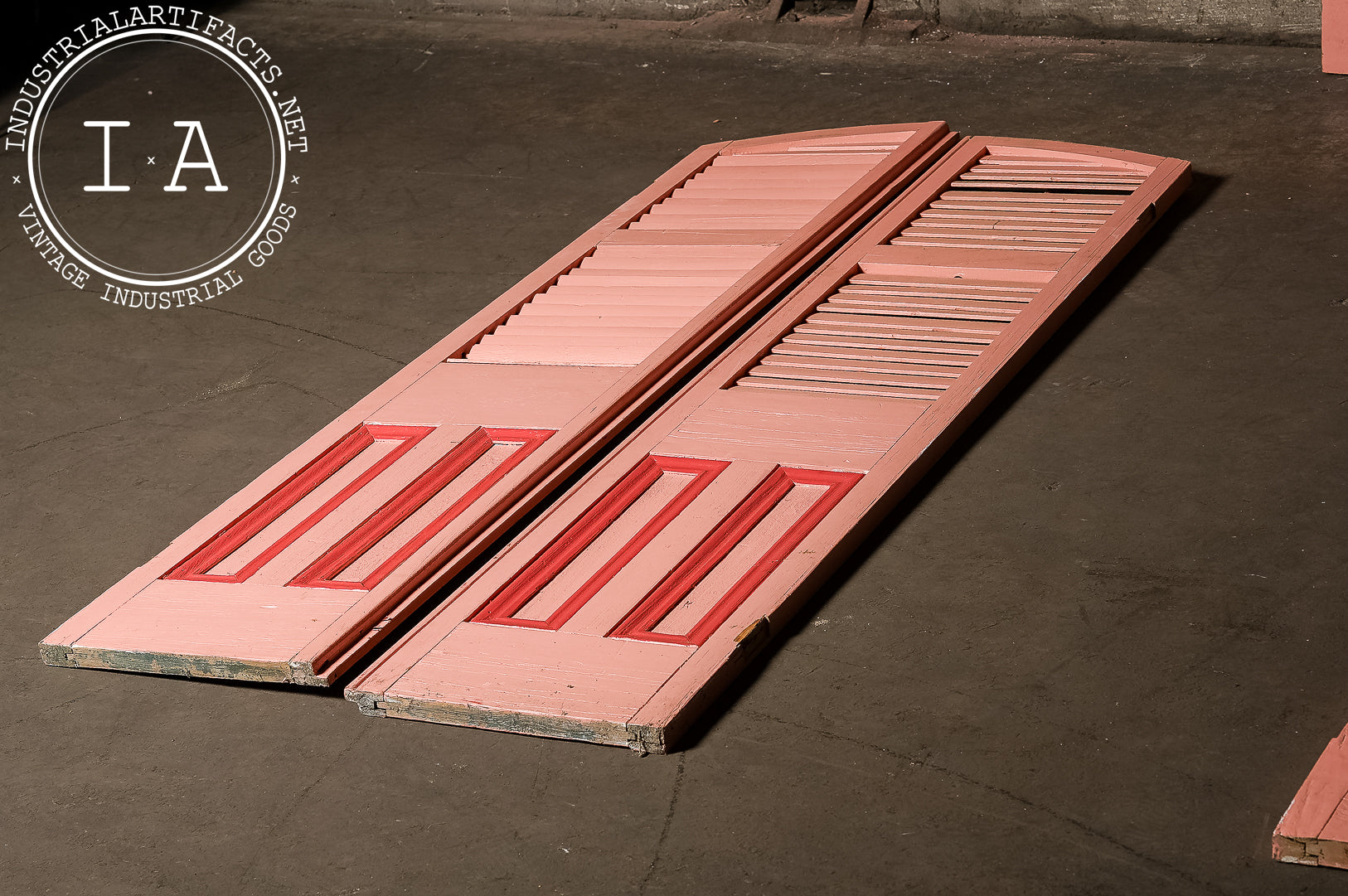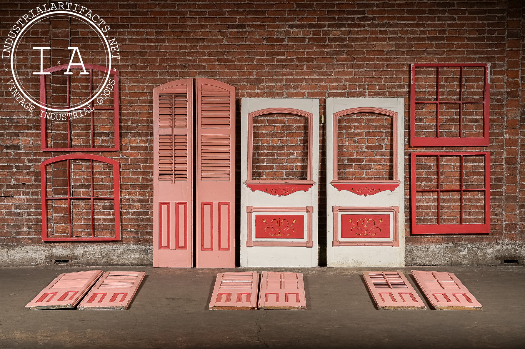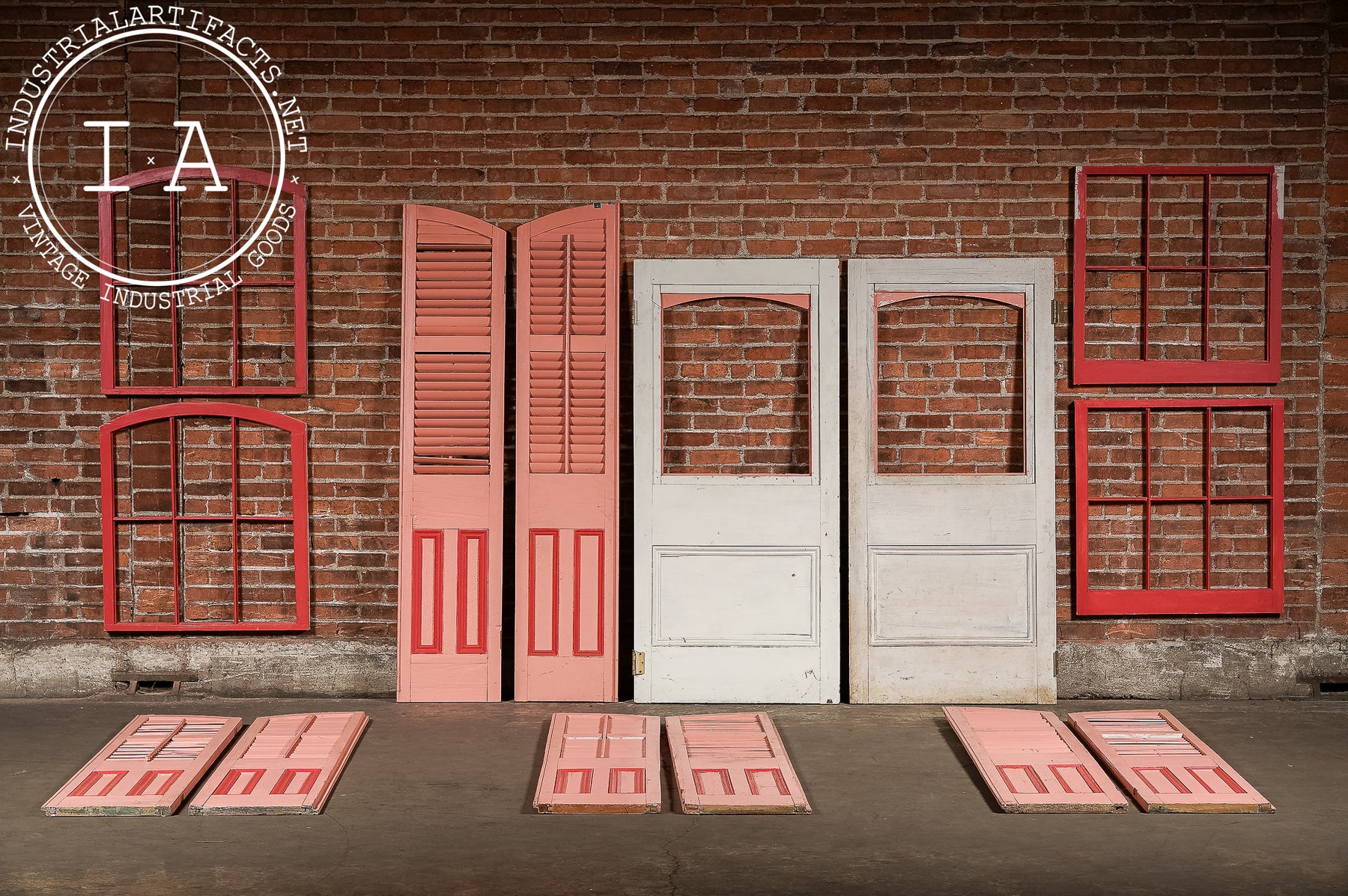 The set includes arched and square multi-pane window frames, louvered shutter doors, and two full-height decorative doors-each painted in layered pink, red, and cream tones characteristic of postwar New Orleans architecture, when color was used to enliven aging residential blocks and commercial corridors. Ornamental elements such as scroll-carved lower panels, shaped transom openings, and board-and-batten shutters echo the eclectic mix of Creole, Victorian, and Caribbean influences that defined much of the city's built environment from the 1930s through the 1960s.