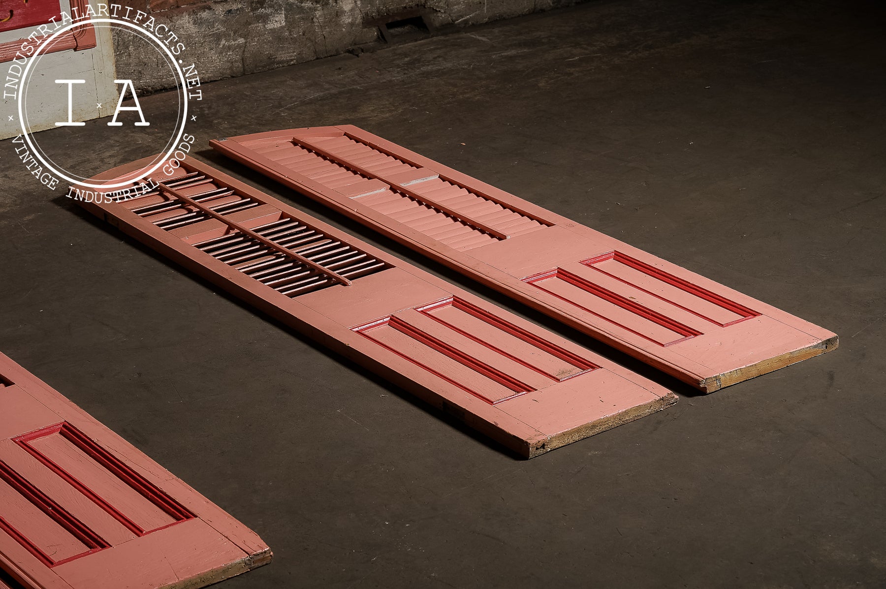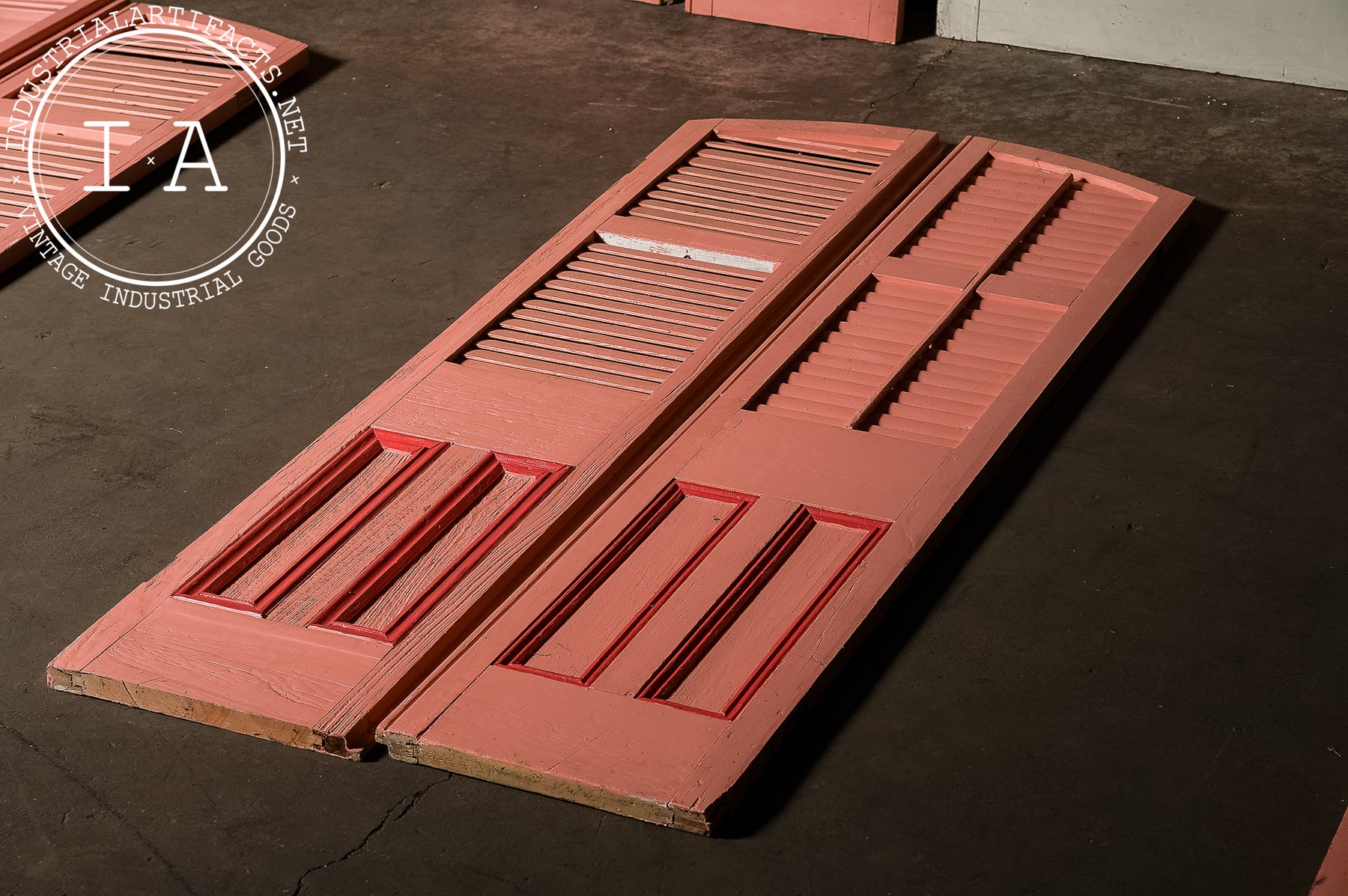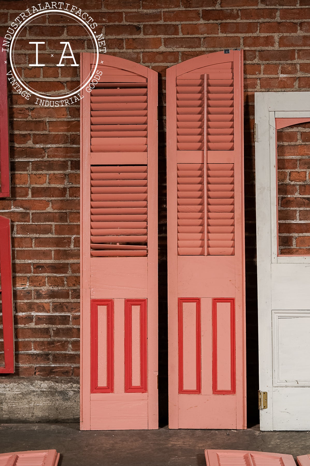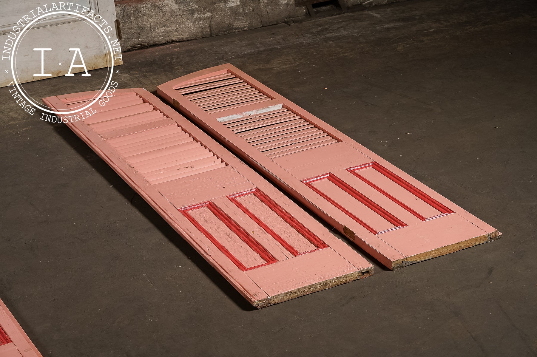 The set includes arched and square multi-pane window frames, louvered shutter doors, and two full-height decorative doors-each painted in layered pink, red, and cream tones characteristic of postwar New Orleans architecture, when color was used to enliven aging residential blocks and commercial corridors. Ornamental elements such as scroll-carved lower panels, shaped transom openings, and board-and-batten shutters echo the eclectic mix of Creole, Victorian, and Caribbean influences that defined much of the city's built environment from the 1930s through the 1960s.