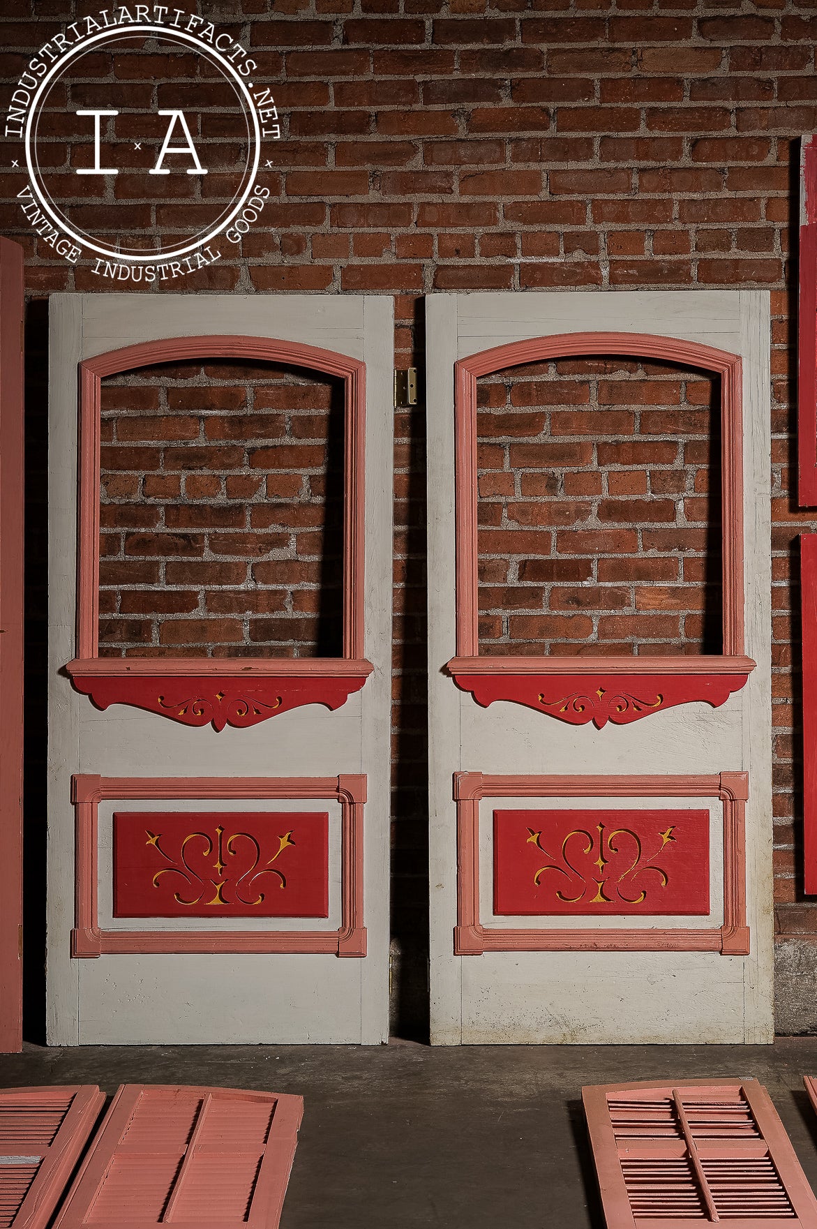 A vibrant, salvaged architectural ensemble sourced directly from New Orleans, comprising doors, shutters, and window panels that once formed part of a traditional Crescent City façade. These pieces reflect the playful, French Creole-influenced vernacular common to mid-century storefronts, shotgun homes, and courtyard structures across the French Quarter and surrounding neighborhoods.