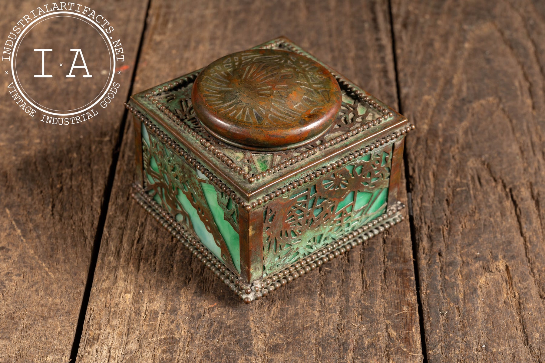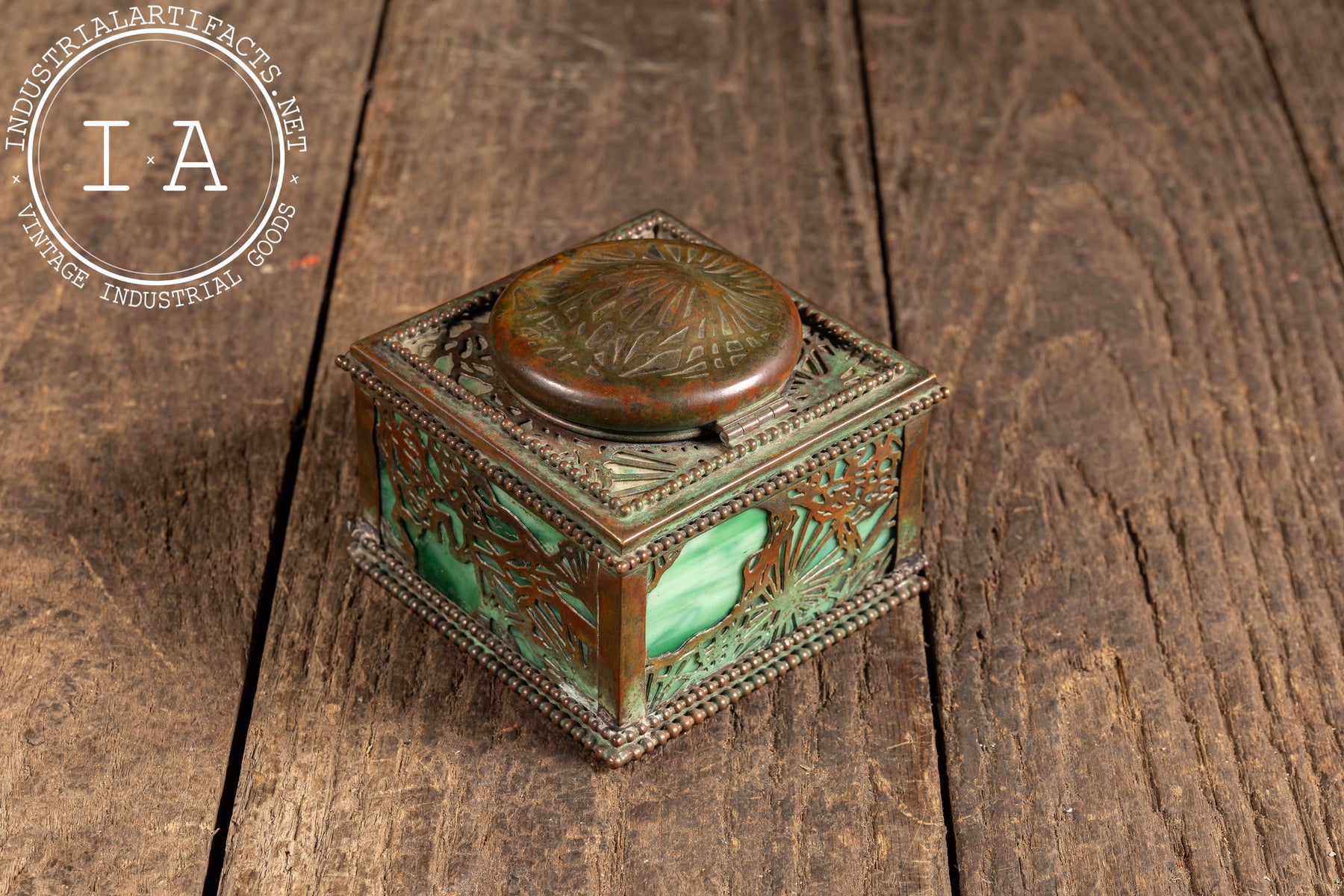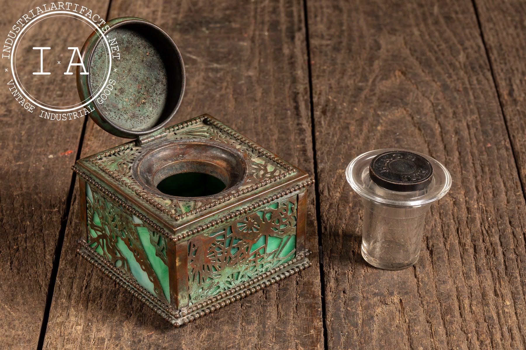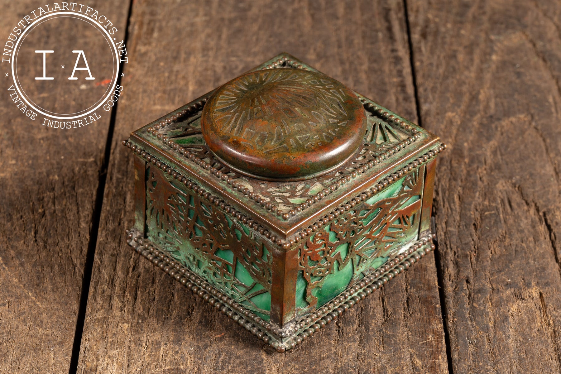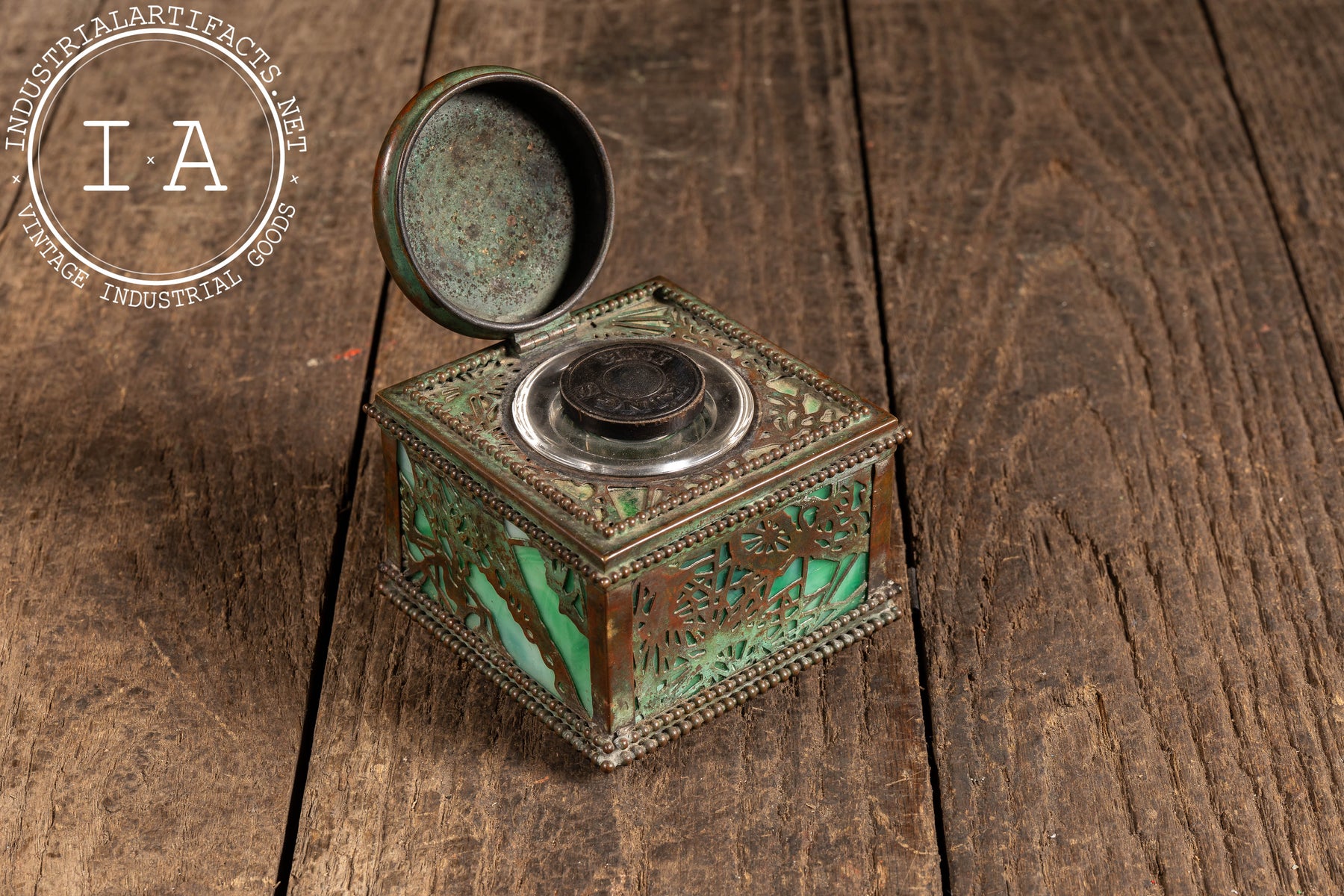 Square desk inkwell executed in patinated bronze with pierced foliate overlay panels set against luminous green stained glass. The form is anchored by a beaded border at the base and lid, with a hinged domed top featuring a radial repoussé pattern. The interior retains its original removable glass ink reservoir with fitted collar, completing the piece as a fully functional writing accessory. The interplay between the pierced bronzework and glowing glass panels is quintessential Tiffany-balancing ornament with material richness in a compact, highly tactile form.