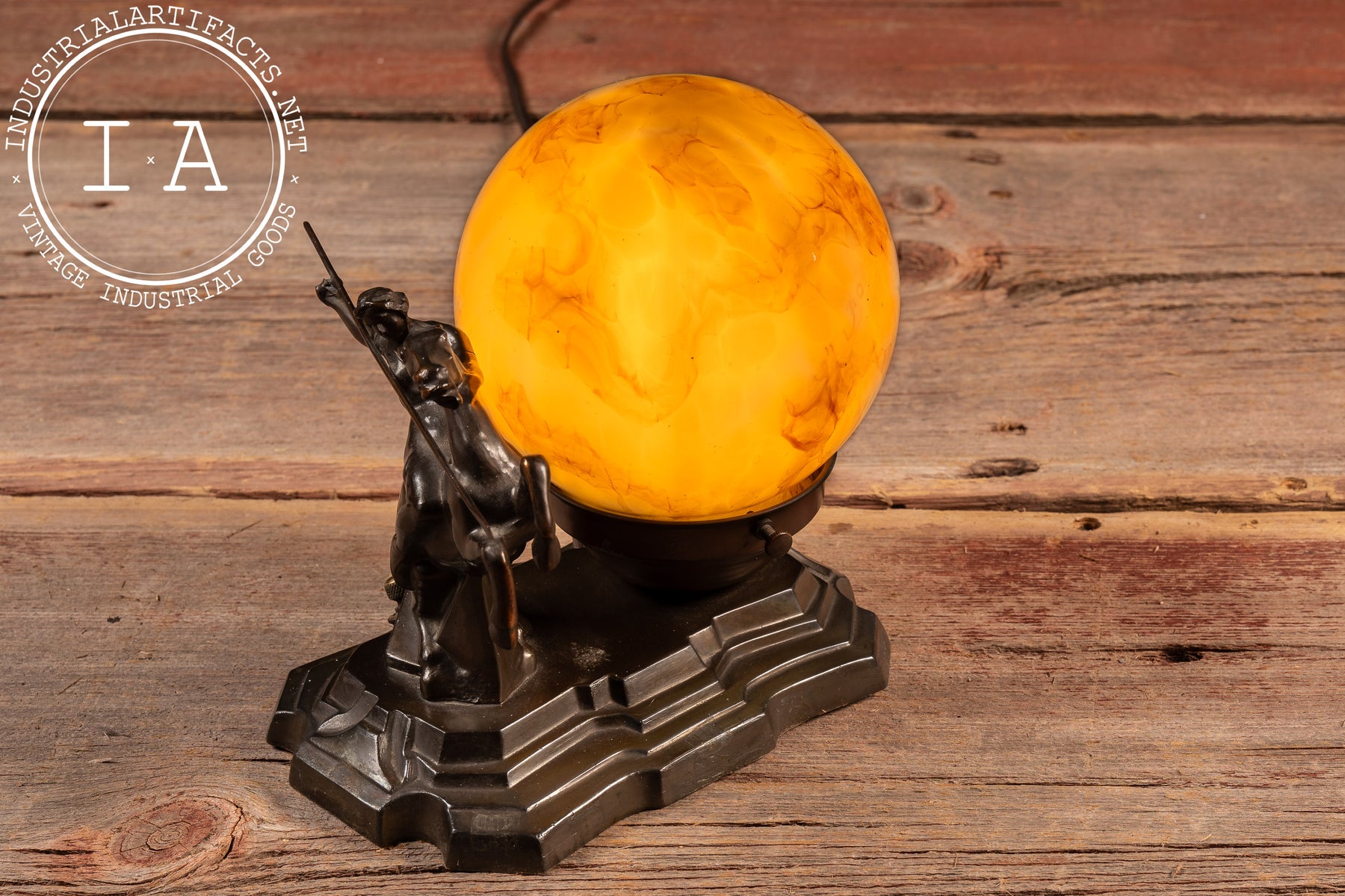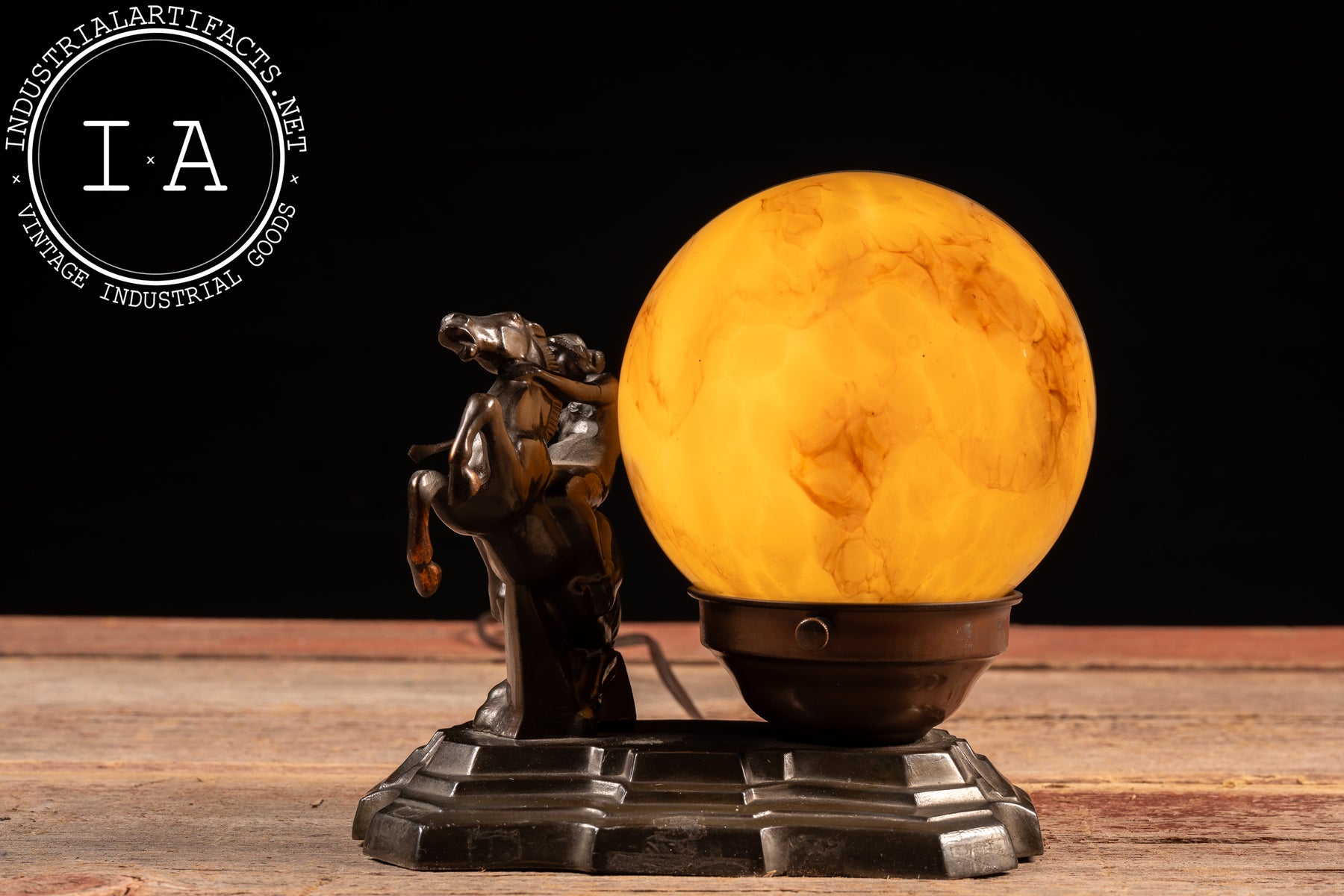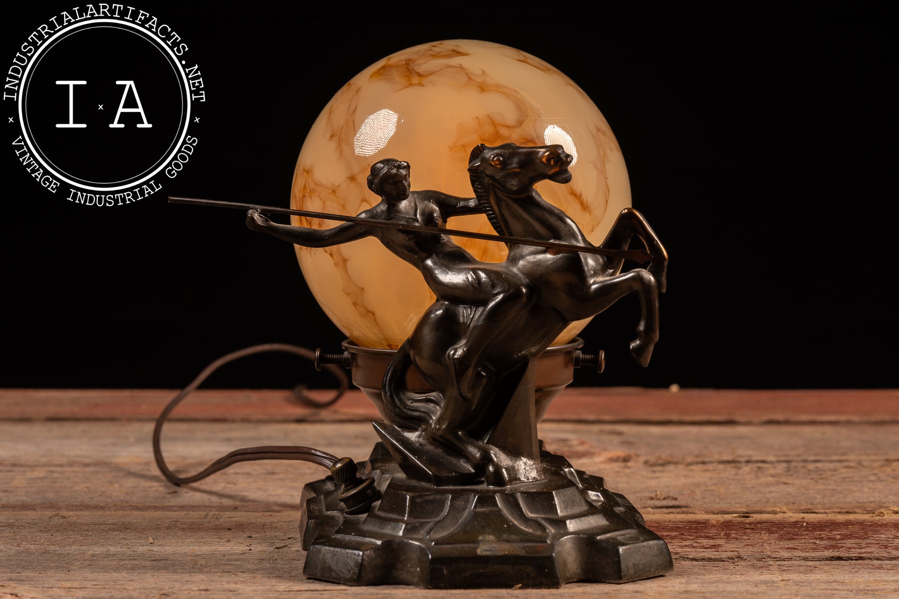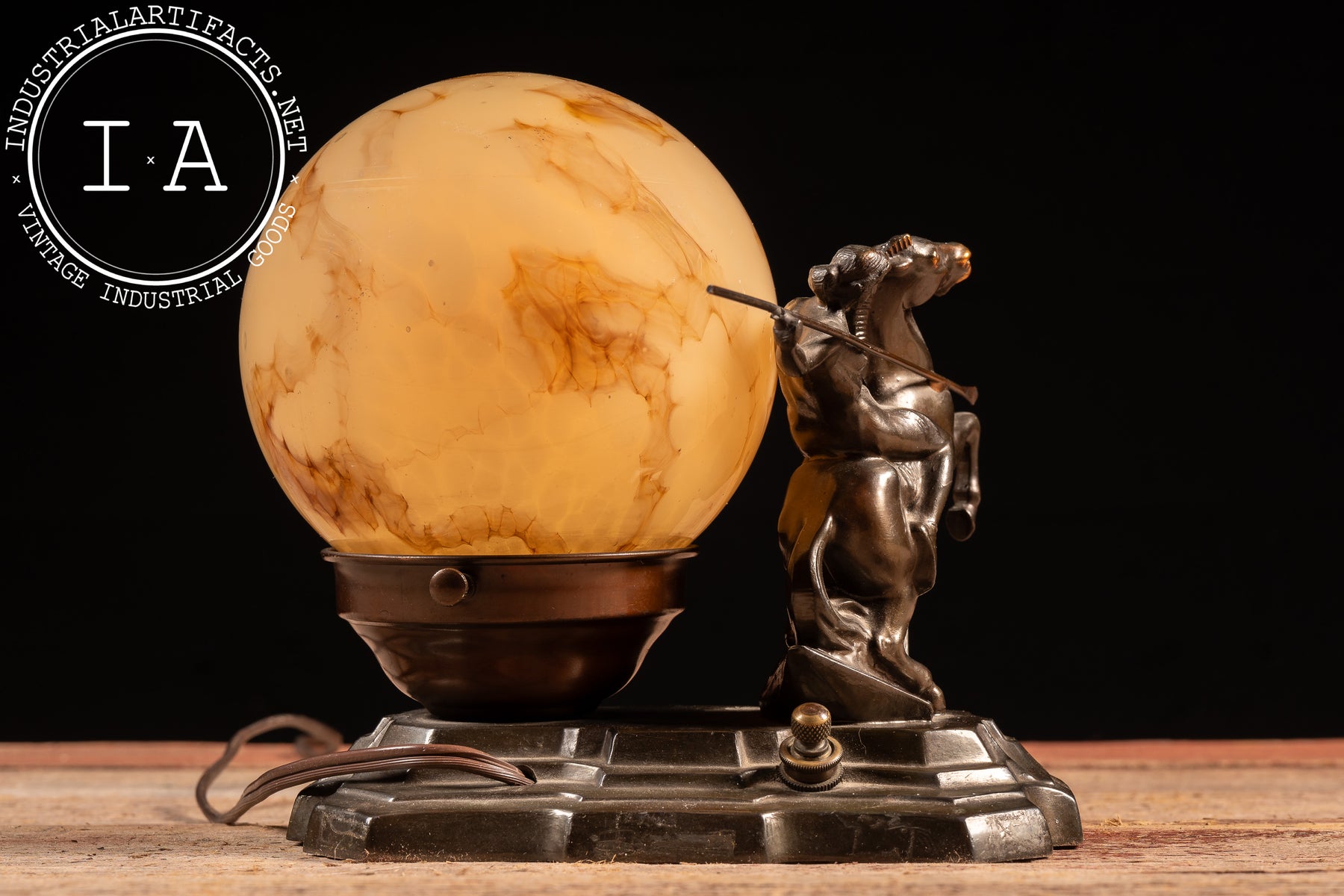 The spherical shade is a marbled caramel-and-cream glass orb, richly veined with amber swirls that bloom when illuminated. Secured within a metal collar with twin set screws, the globe casts a warm honeyed glow that silhouettes the rider and horse, enhancing the theatrical quality of the piece. The base retains its period-style brown cord with inline switch. Compact in footprint but bold in presence, it functions equally as sculptural statement and atmospheric light source-an excellent example of 1930s figural lighting where mythic subject met streamlined modern form.