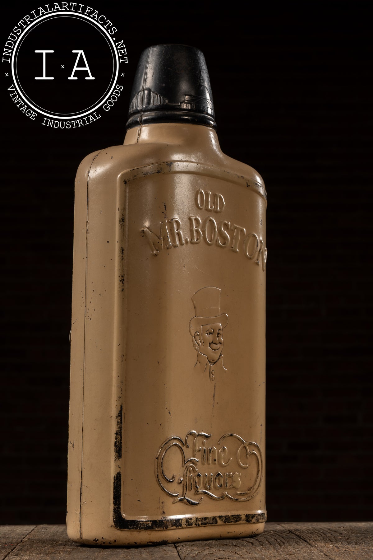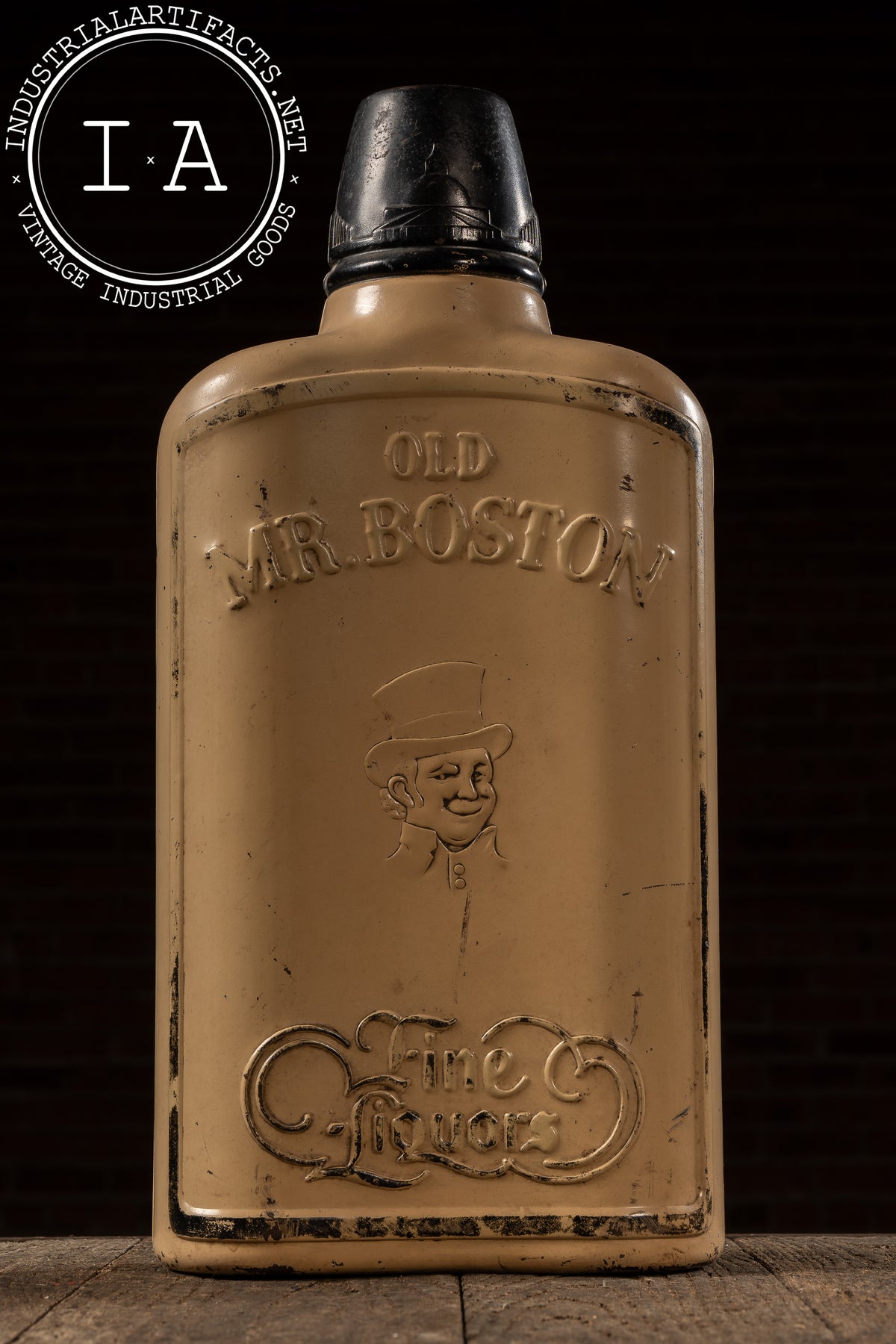 This oversized Old Mr. Boston advertising display was cast in the form of the brand's iconic bottle, complete with raised lettering, embossed top-hat mascot, and a Gilbert 8-day mechanical clock fitted into the front panel. The tan and black painted surface shows moderate wear to the paint.