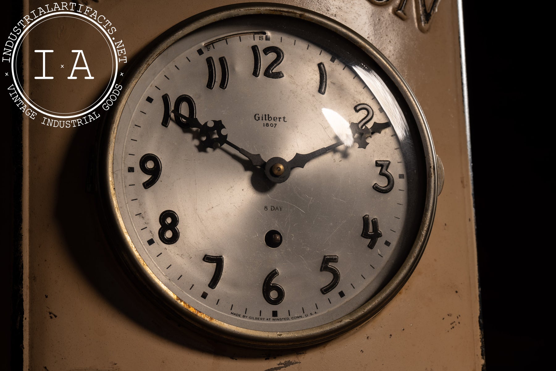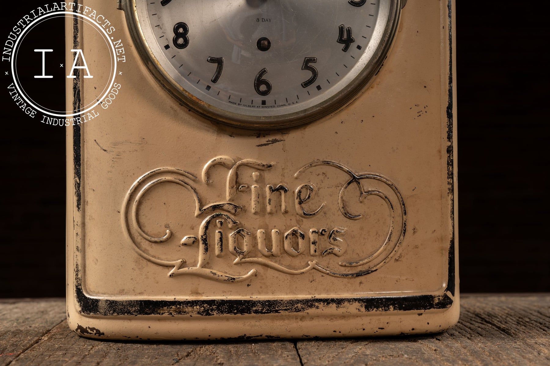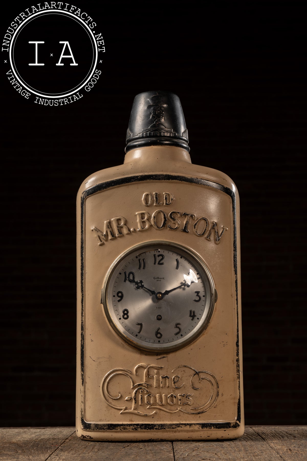 The clock itself is marked by Gilbert of Winsted, Connecticut, one of America's most prolific makers of mechanical store clocks, and remains housed in its original bezel and glass. The cast form retains the script Fine Liquors paneling and molded borderwork characteristic of Old Mr. Boston's post-Prohibition marketing.