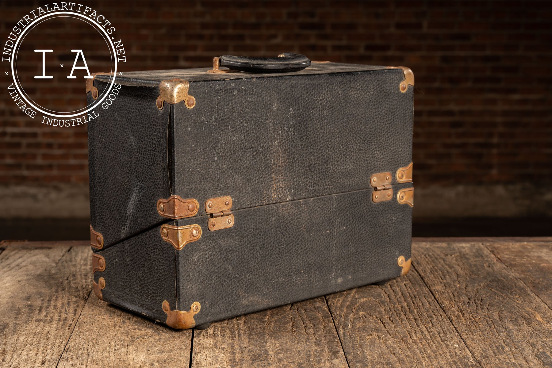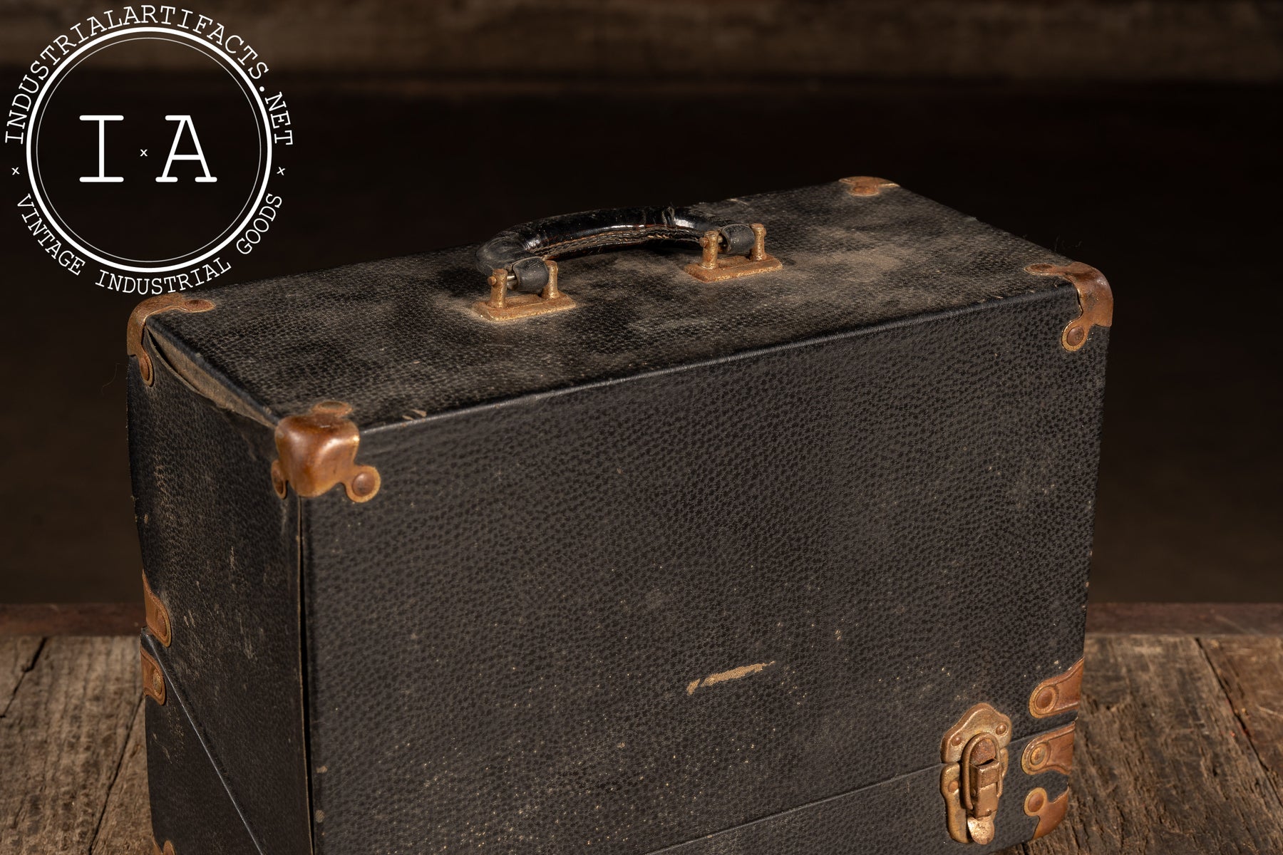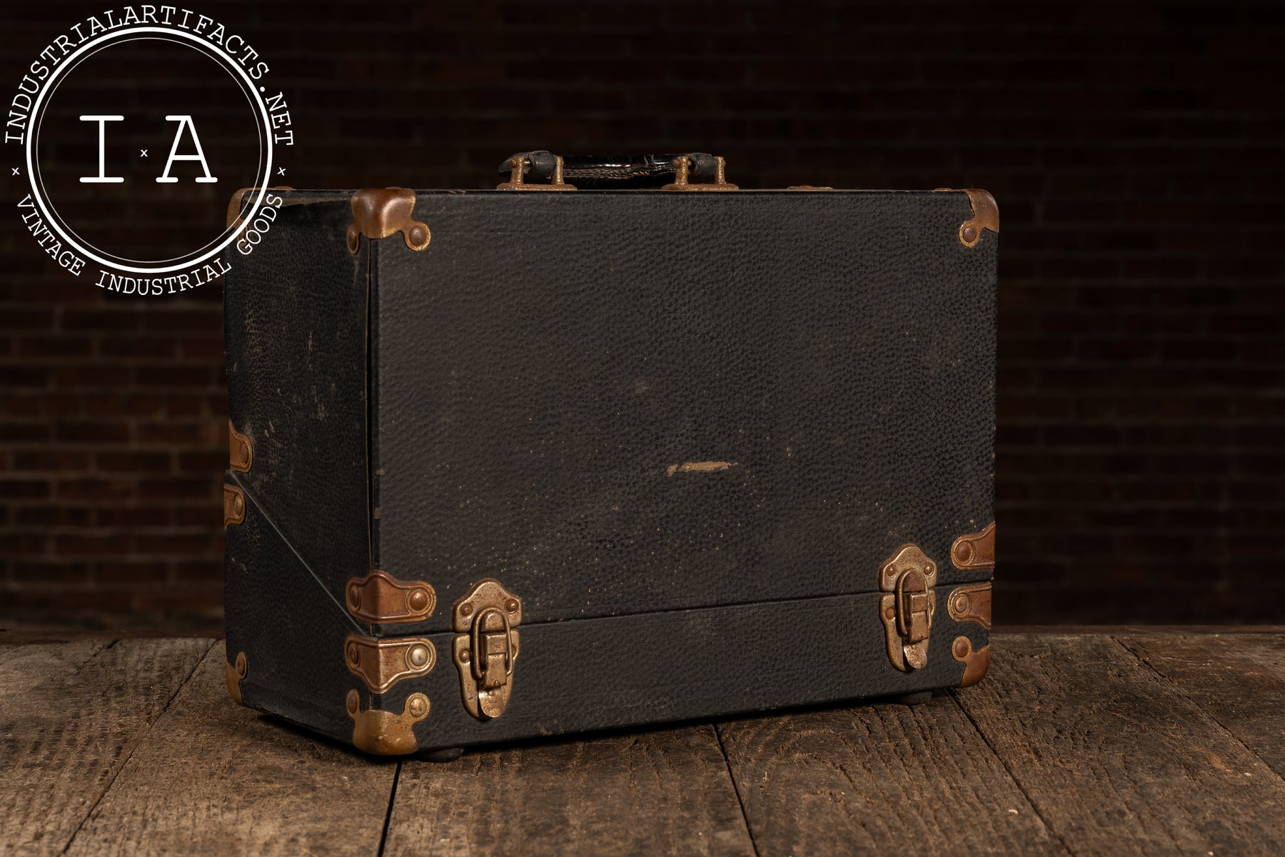 This example retains its matching Dahlberg pillow speaker and comes stored in a fitted carrying case, an uncommon configuration compared to wall-mount units. The plastics display expected surface wear from age and use, and the case shows patina to its hardware and covering. This piece may be a salesman sample radio given its' carrying case.