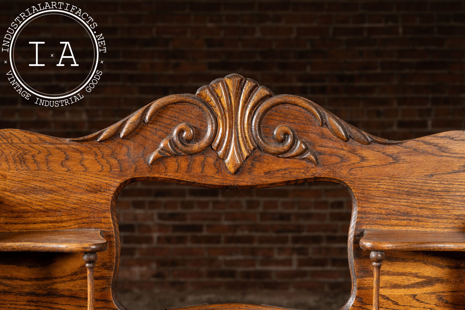 Solid oak drop-front secretary featuring a carved foliate crest, turned spindle supports, and open shelving beneath the writing surface. The desk front folds down to reveal a broad writing area supported by side chains, while the lower section includes two fixed shelves for books or storage. The top mirror cutout and scrollwork detailing reflect the decorative craftsmanship of early American domestic furniture, merging utility with ornament.