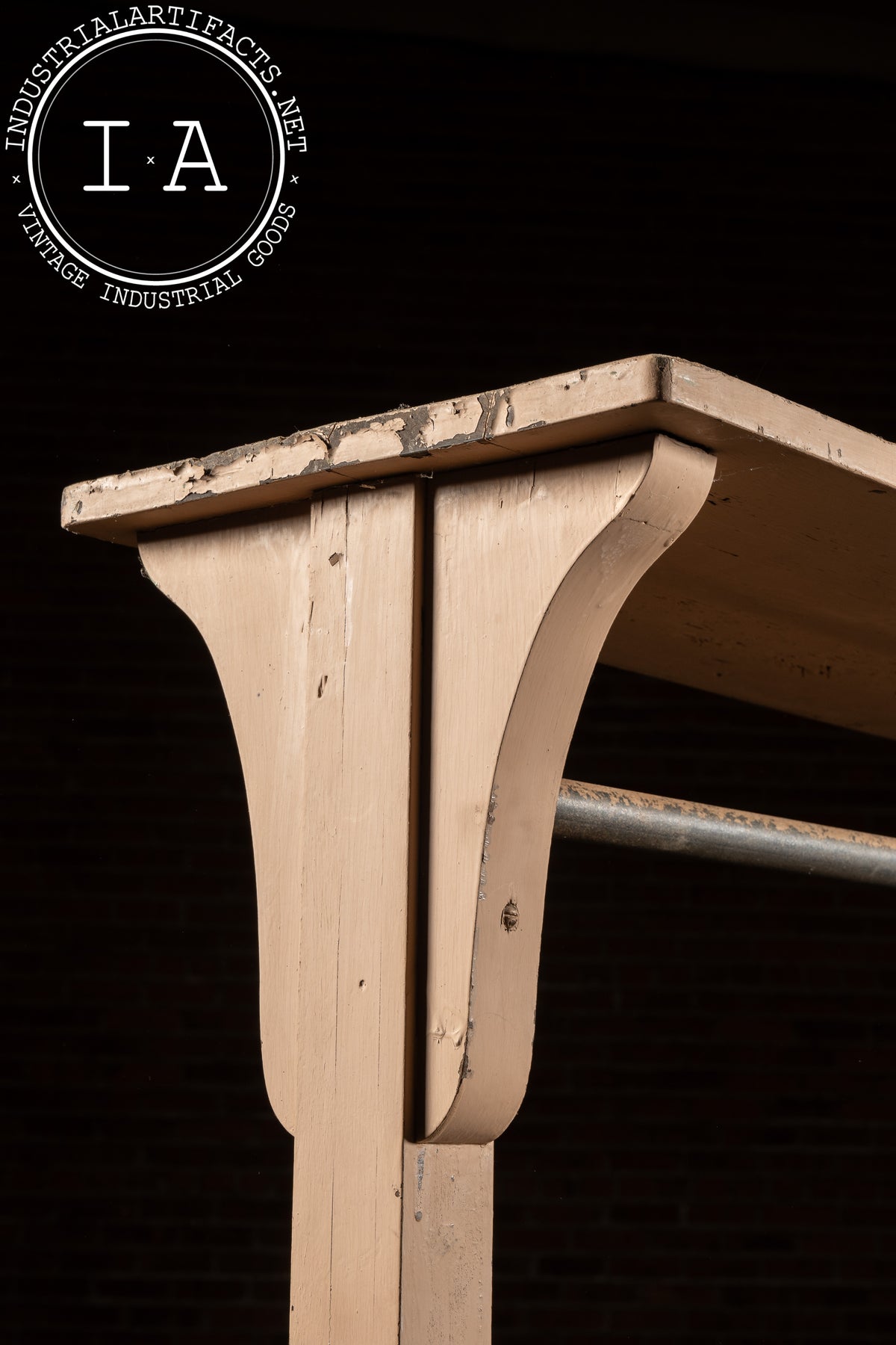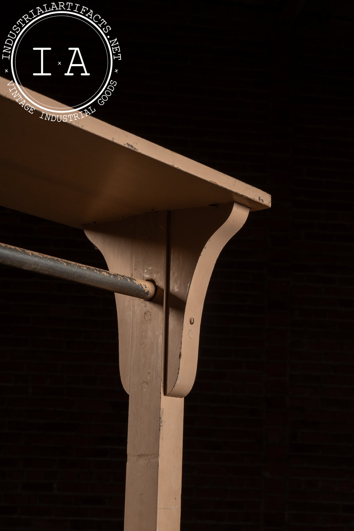 This rack reflects the practical elegance of early 20th-century commercial furnishings, when form followed function and durability was paramount. Likely produced for use in a department store, tailor shop, or factory changing area, it balances light visual presence with robust construction. The softly contoured feet, chamfered edges, and integrated bracing give it a restrained architectural character, while the original painted surface speaks to its working life. Pieces like this were built to be moved, loaded, and reused endlessly-an honest artifact of pre-war retail and industrial interiors.