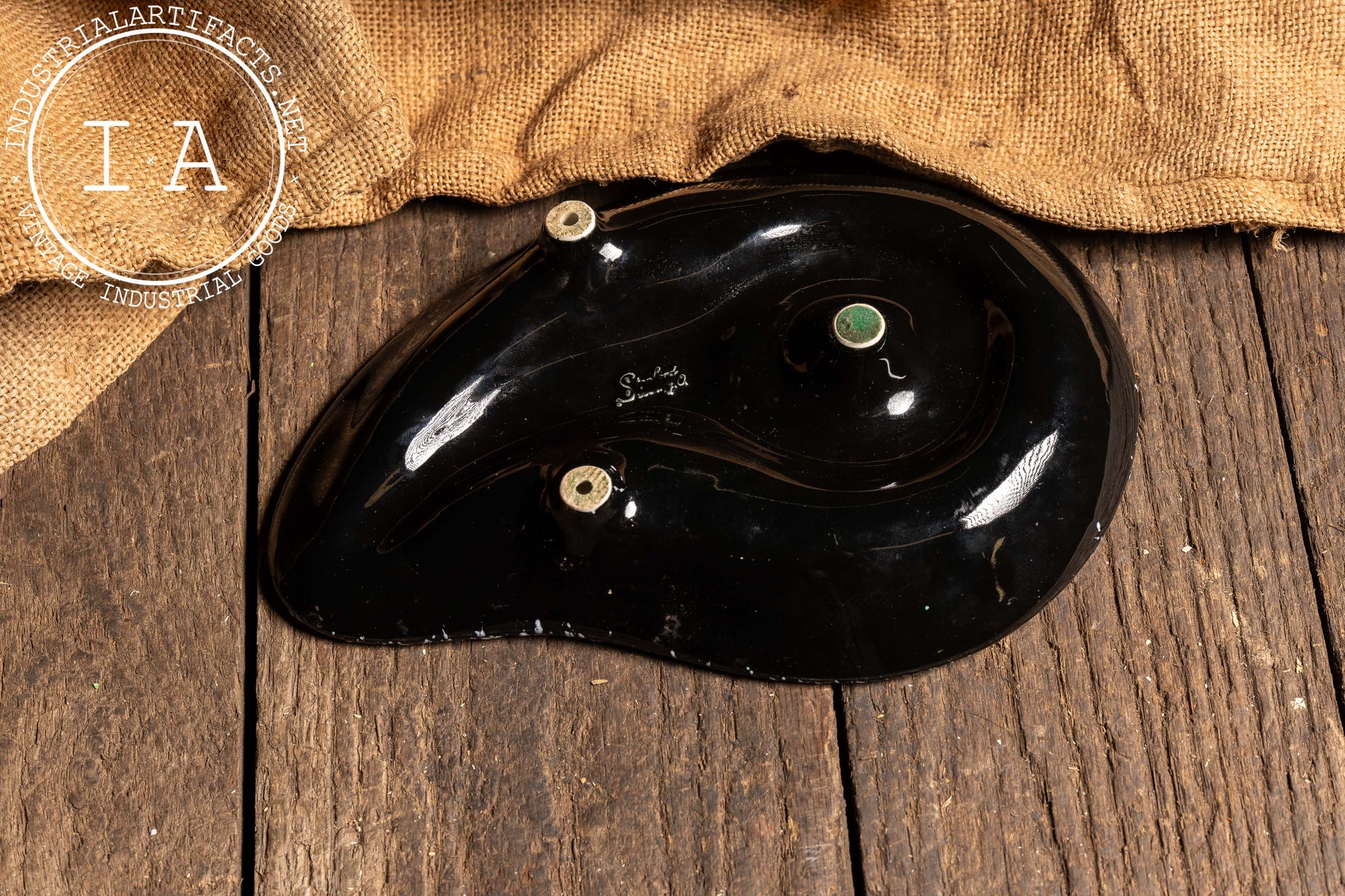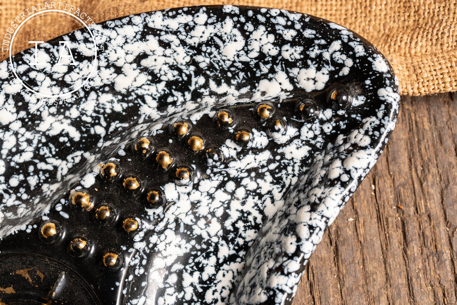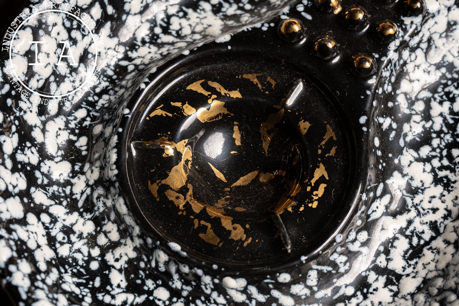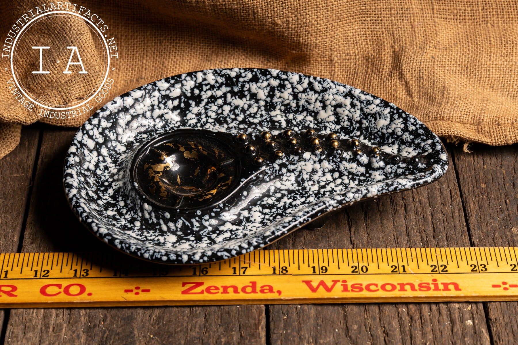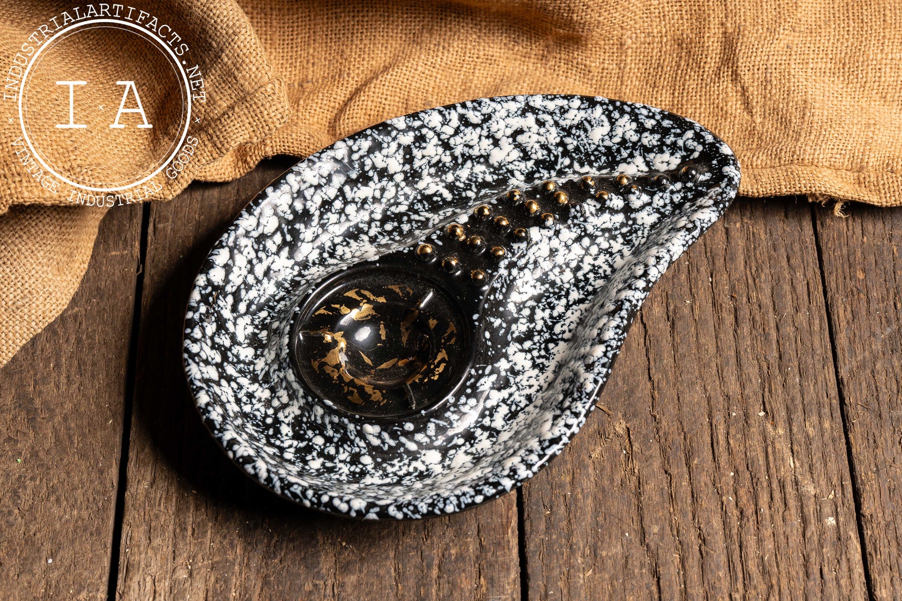 Striking asymmetrical ceramic ashtray featuring a dramatic black ground with white splatter glaze, now firmly attributed to Stanford Art Pottery of Sebring, Ohio-an American manufacturer known for producing decorative and utilitarian wares during the mid-20th century. The sculptural form incorporates a raised, ribbed cigarette rest with applied gold-tone bead accents, leading into a deep central well finished in glossy black with scattered gold flecking. The underside mark reading "Stanford Sebring O." further anchors the piece within this distinctly American postwar ceramic tradition.