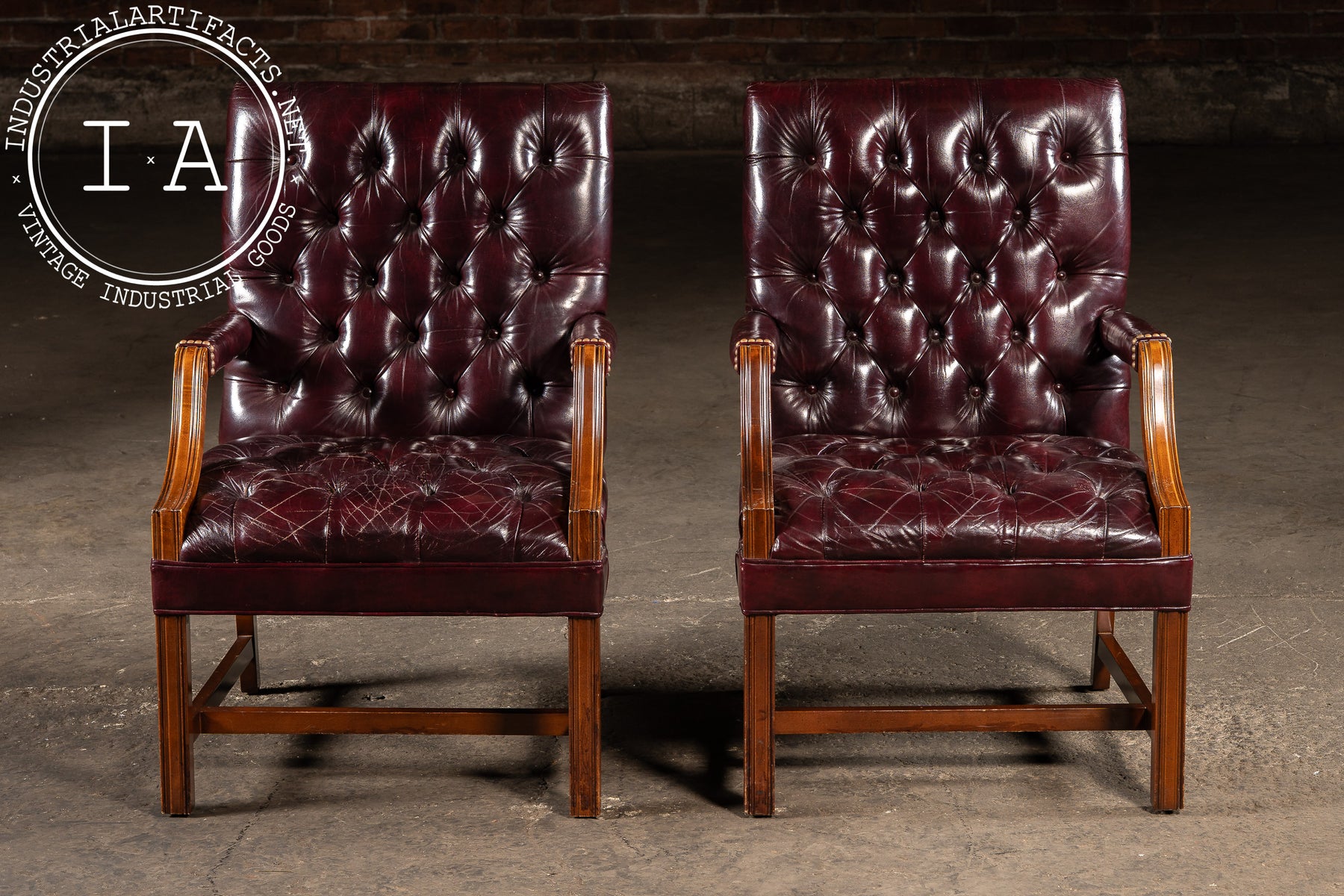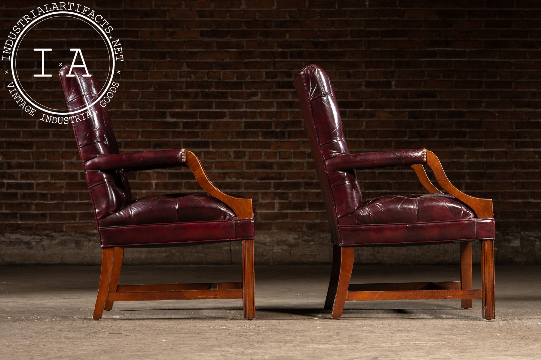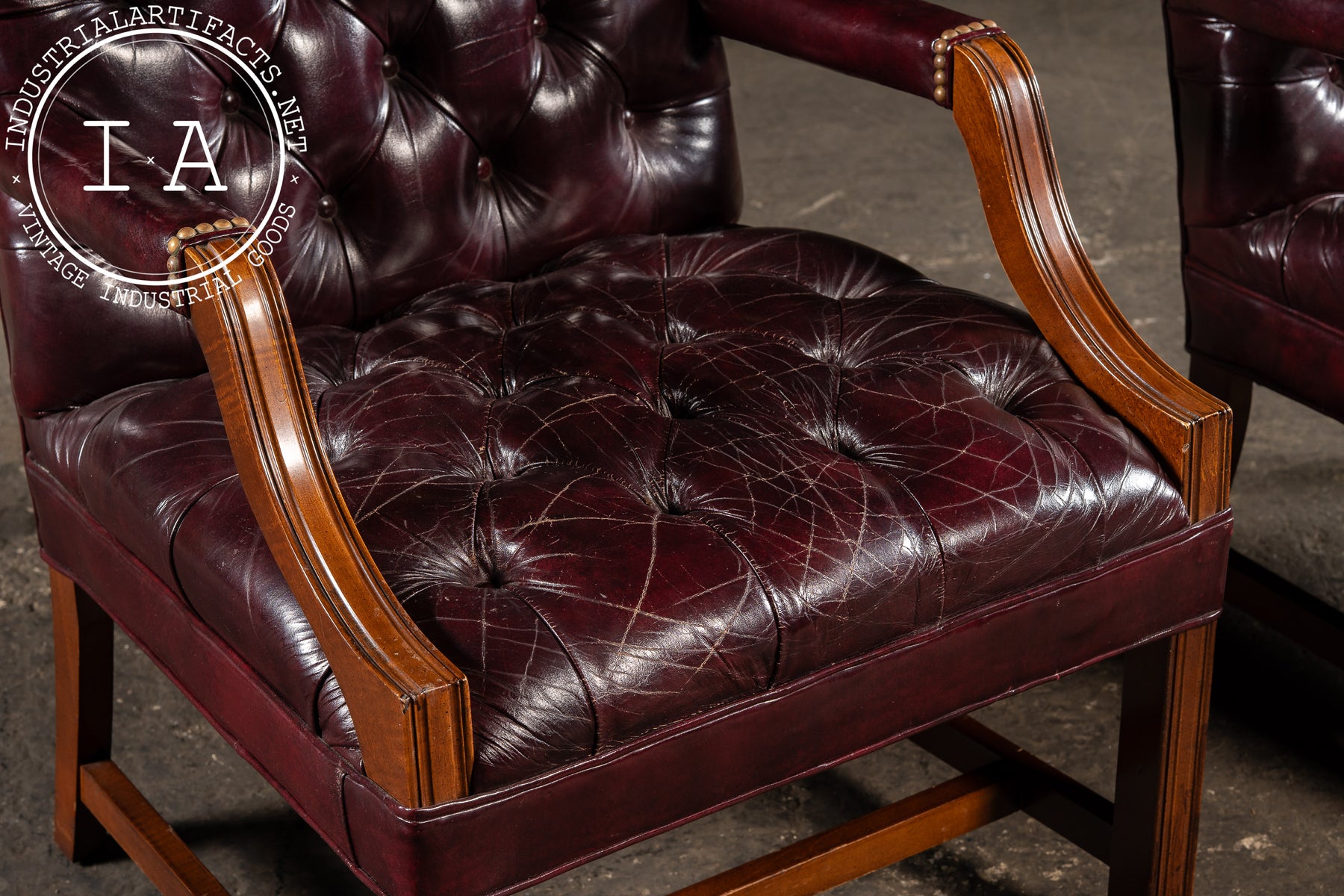Stately pair of square-backed dining chairs upholstered in rich oxblood leather with classic deep button tufting and brass nailhead trim. Each chair features curved walnut arms, squared front legs, and a sturdy stretchered base-balancing refined craftsmanship with executive formality. The high, straight backrest and tailored lines nod to mid-century American interpretations of English traditional design.