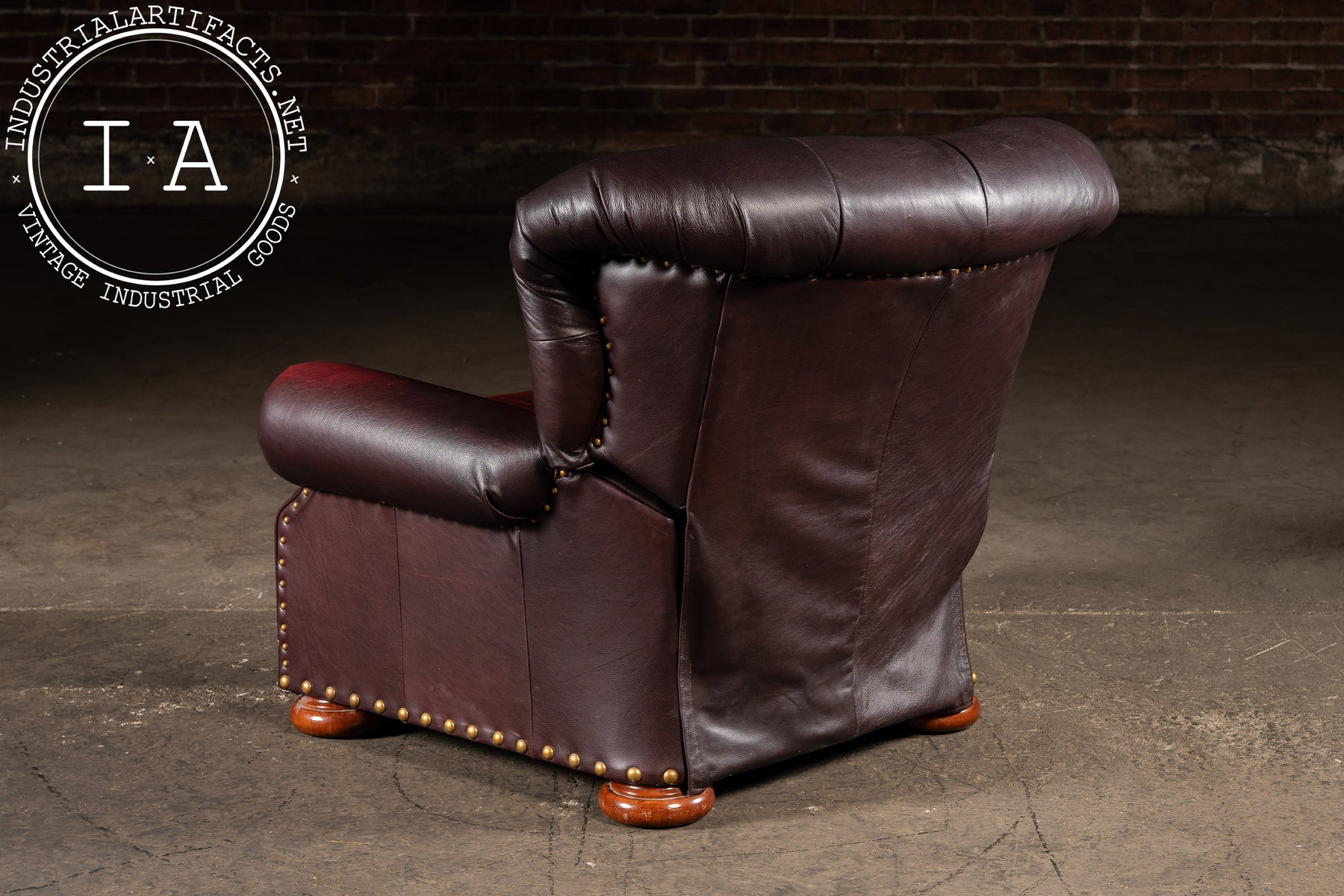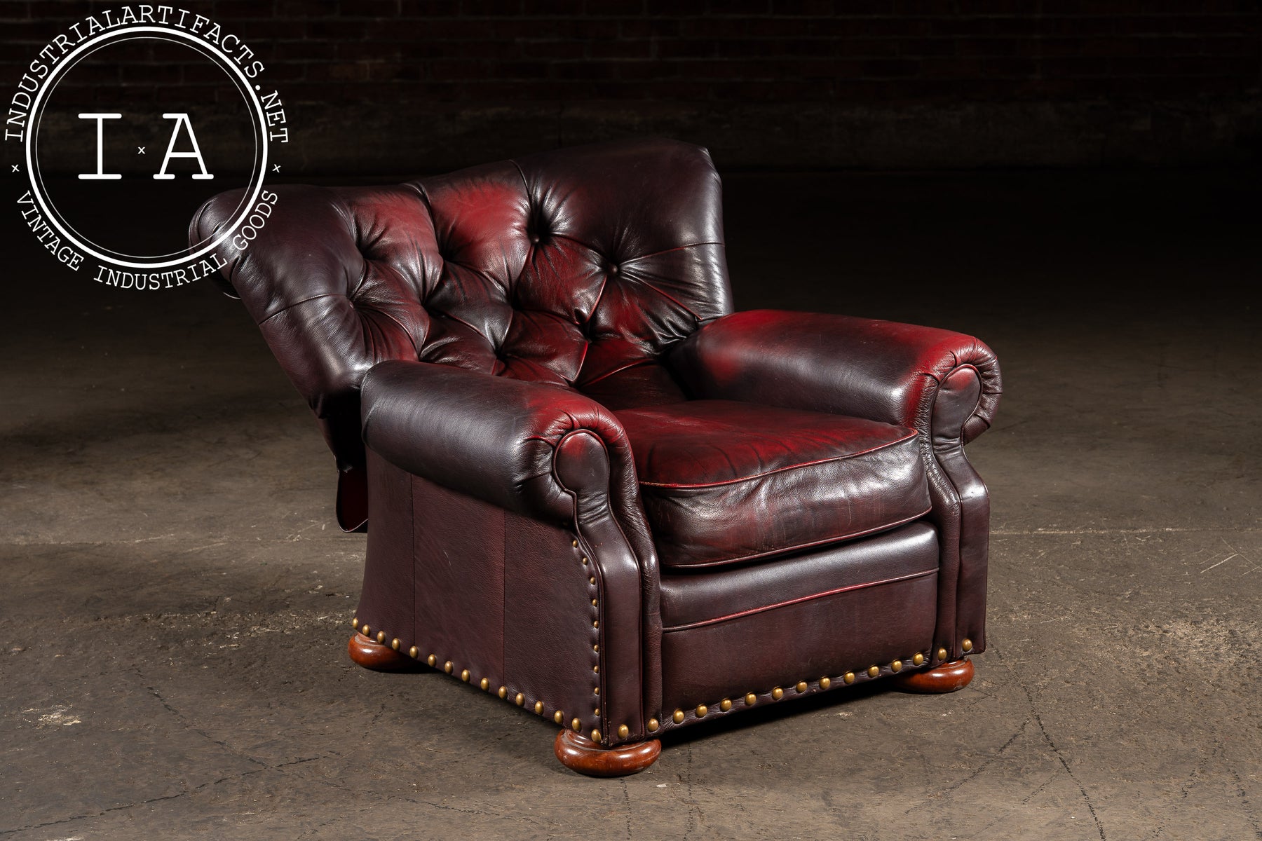Deeply tufted and richly upholstered in oxblood leather, this Churchill-style recliner pairs classic English club design with American mid-century construction. The chair features oversized rolled arms, brass nailhead trim, and turned wooden bun feet. A matching tufted ottoman rests on identical feet, completing the ensemble. Only the chair back reclines-an intentional design reflecting the transitional engineering of early manual recliners, with the ottoman serving as a companion piece for full extension and comfort.