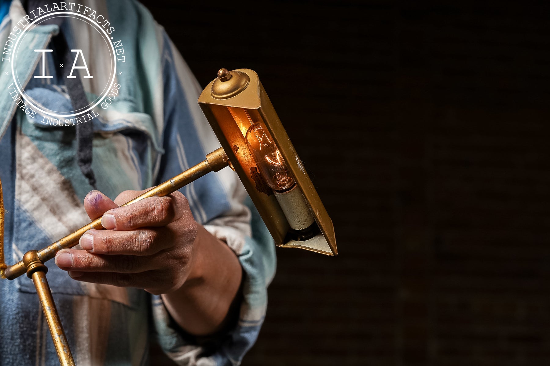 Wall-mounted brass picture or art light with a stepped rectangular shade and multi-jointed articulated arm, allowing the light head to be precisely positioned over artwork, mirrors, or framed displays. The compact shade houses the light source behind a partially enclosed brass shell, directing illumination downward while minimizing glare. The arm assembly features simple knuckle joints and straight tubular sections, emphasizing function-first design with minimal ornamentation. Finished in aged brass with warm patina, the piece carries the quiet authority of early 20th-century architectural lighting-purpose-built, restrained, and mechanically honest.