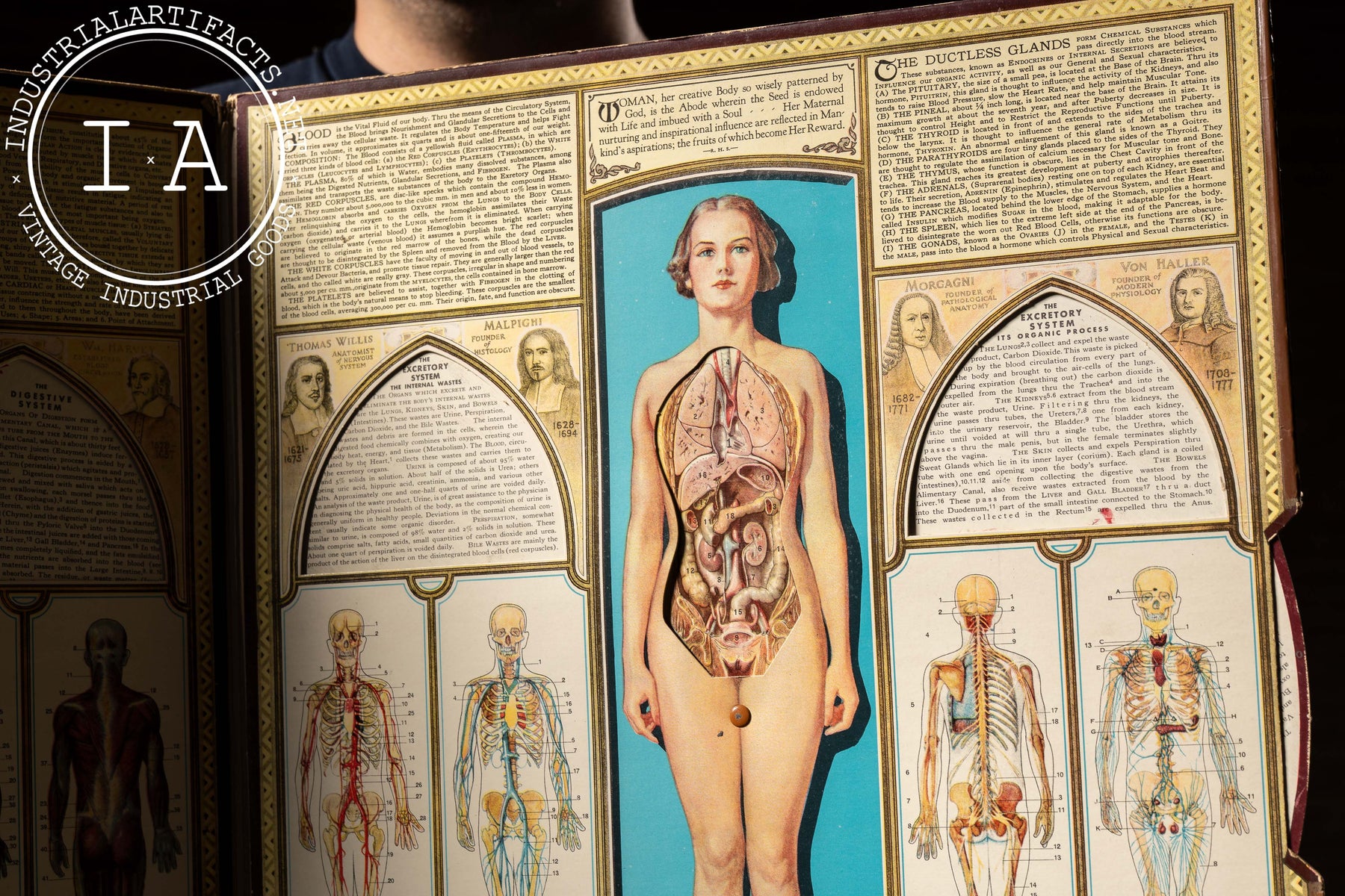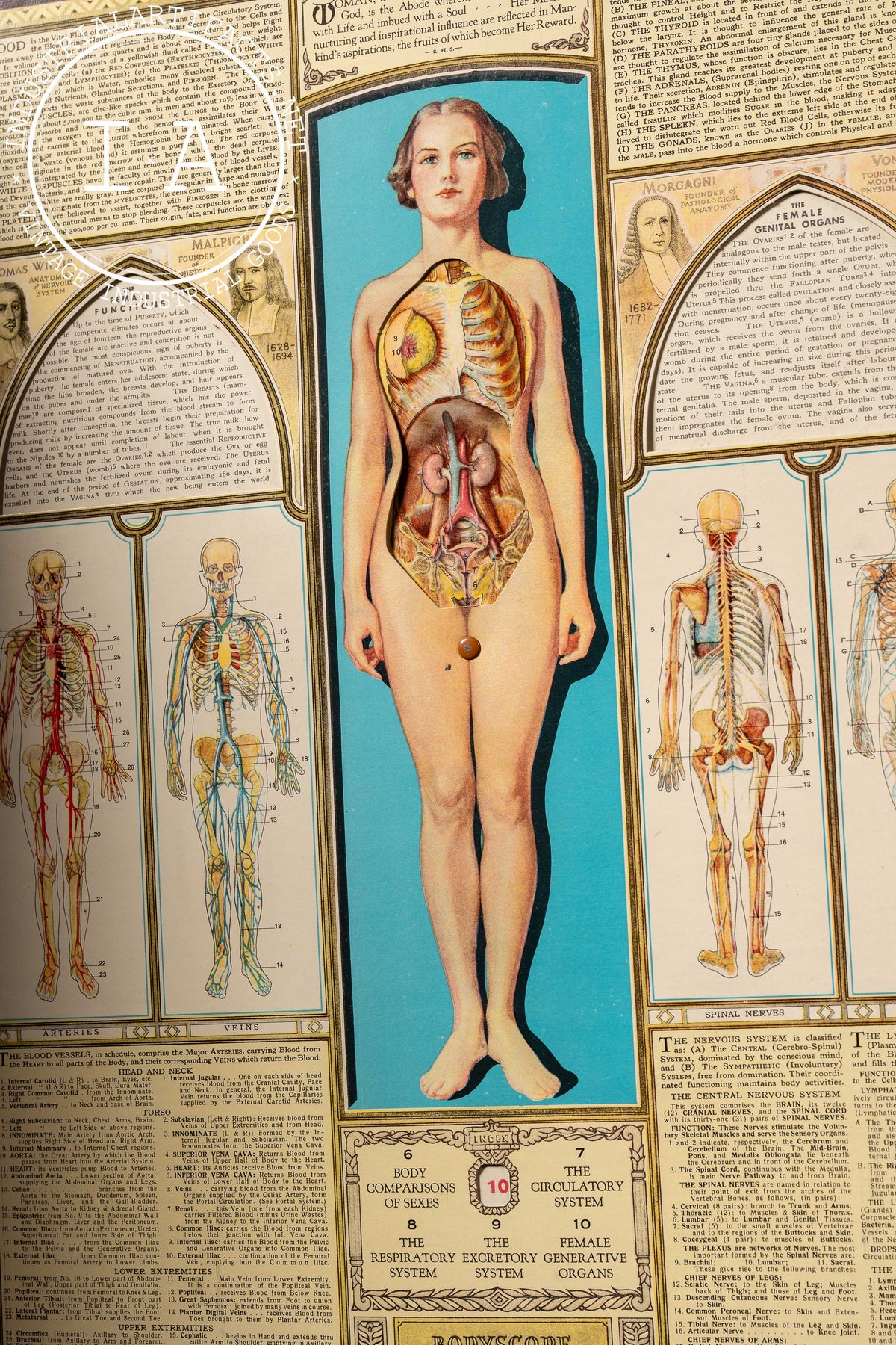 Produced by Bodyscope Inc. of New York, this unique chart was marketed to schools, clinics, and libraries during the late 1930s as a modern visual aid in the popular science and health education boom preceding World War II. Its intricate artwork and mechanical ingenuity make it one of the more ambitious examples of Depression-era printed medical ephemera.