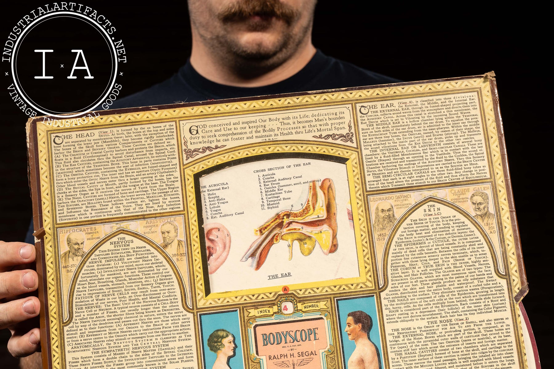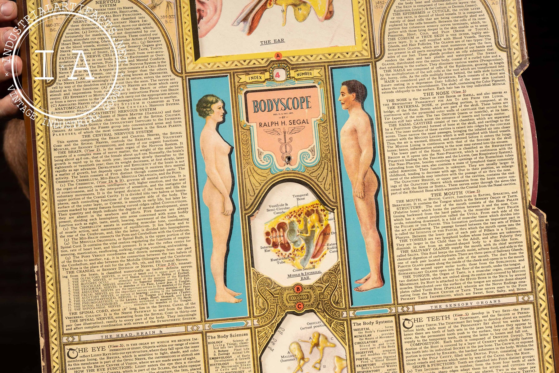 Double-sided educational wall chart titled "Bodyscope" by Ralph H. Segal, featuring revolving paper dials that reveal cross-sections of various human organ systems. Designed as both an anatomical teaching aid and a decorative reference, the chart includes detailed lithographic illustrations of the ear, nervous system, teeth, and skin, framed by extensive descriptive text and bordered in an Art Deco motif. When fully opened, each side can be rotated to align numbered diagrams with corresponding anatomical explanations, a format reflecting early 20th-century interest in interactive learning and physiology visualization.