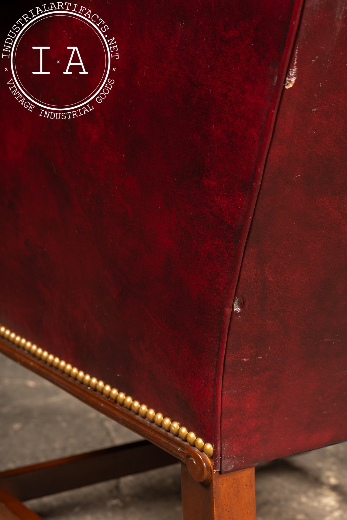 A stately mid-century leather club chair upholstered in deep burgundy tufted leather with brass nailhead trim and a solid mahogany base. The rolled arms and arched back give this piece its traditional library form, while the tight diamond tufting across the seat and back exemplifies precision craftsmanship. The chair's structure is reinforced by straight, fluted front legs and a supportive box stretcher-features common among mid-century executive furnishings built for longevity and style.