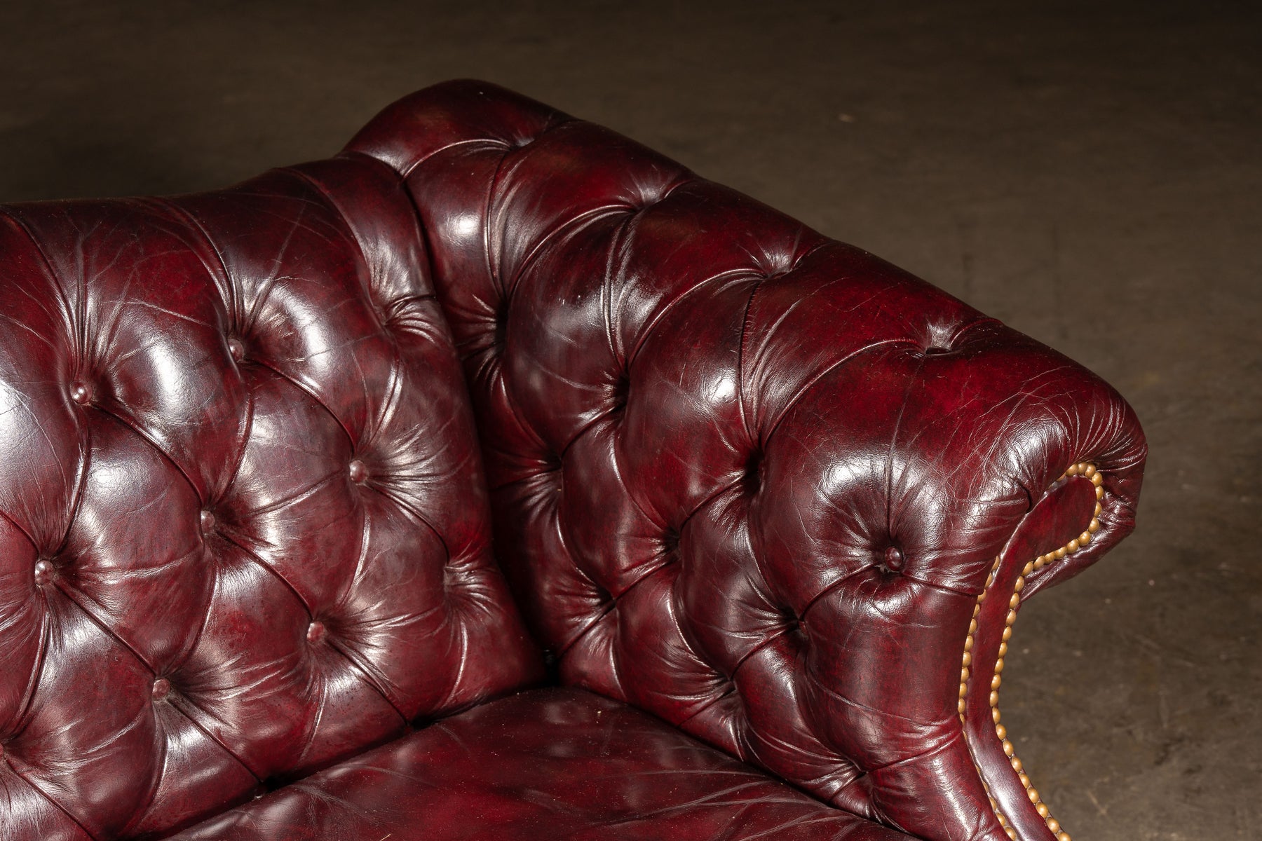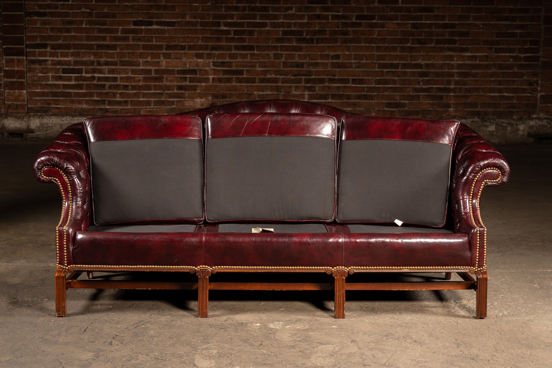 Vintage Chippendale-Style Camelback Chesterfield Leather Sofa in Oxblood