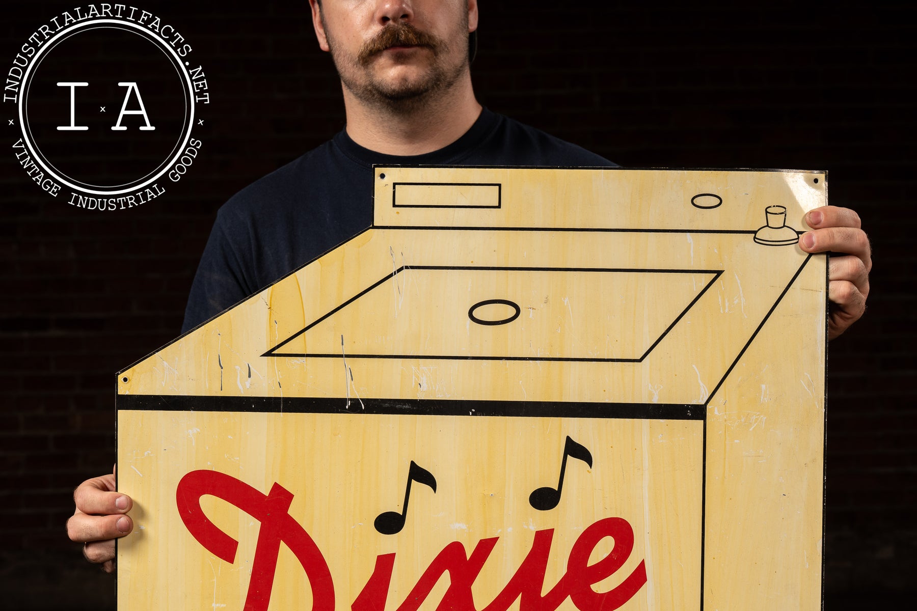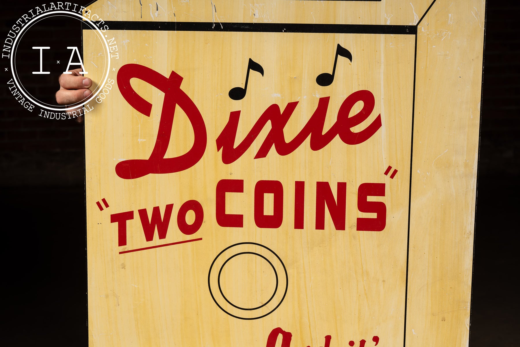 Painted metal advertising sign in the form of a coin-operated washing machine, reading "Dixie 'Two Coins' And It's Automatic." Rendered in a warm yellow tone with bold red script and musical note accents, the sign captures the lively optimism of midcentury American laundromat culture. The playful slogan references the affordability and automation of the era's coin-op washers-a hallmark of postwar domestic innovation.
