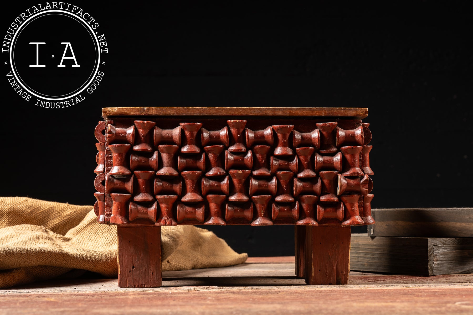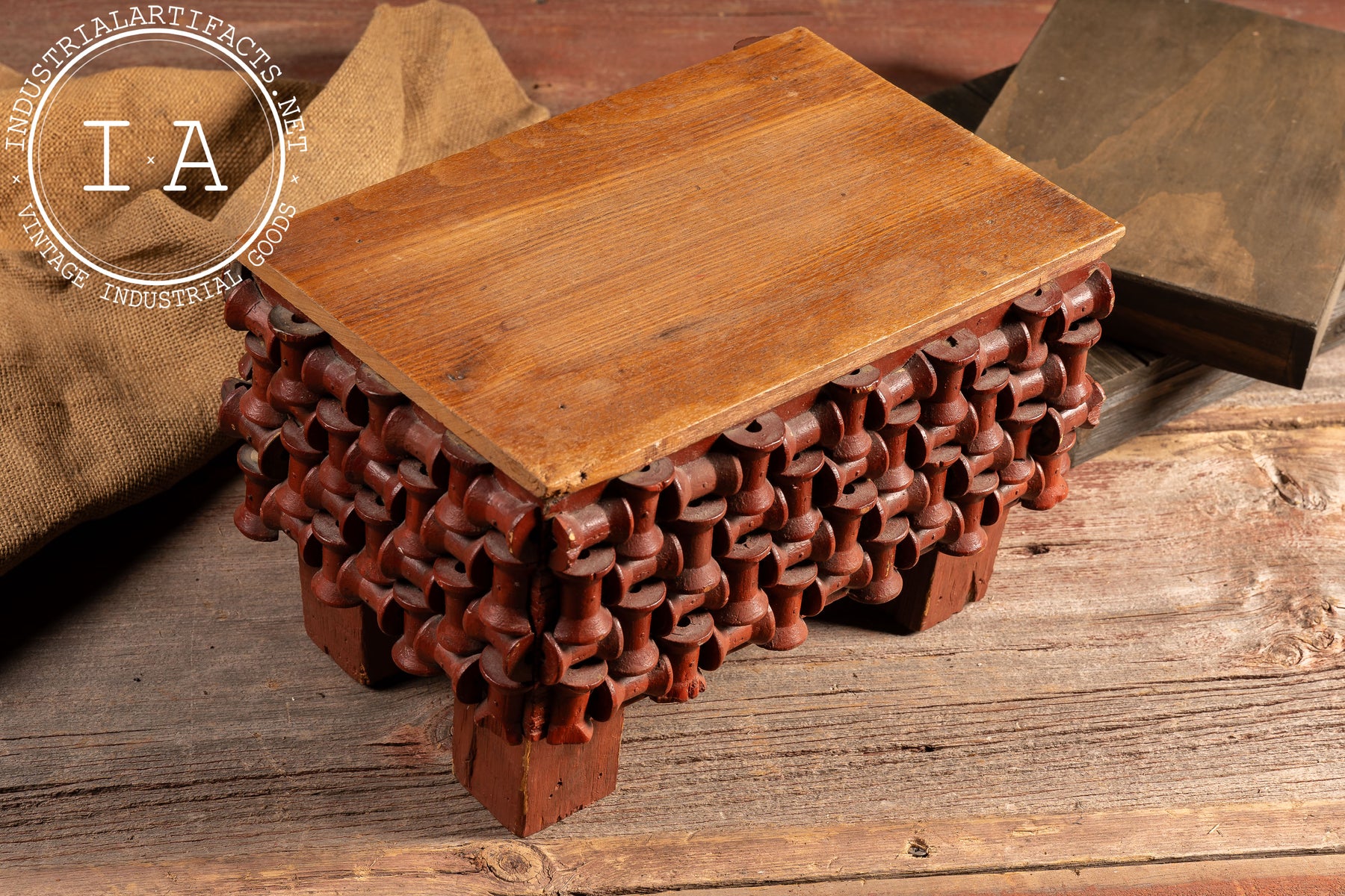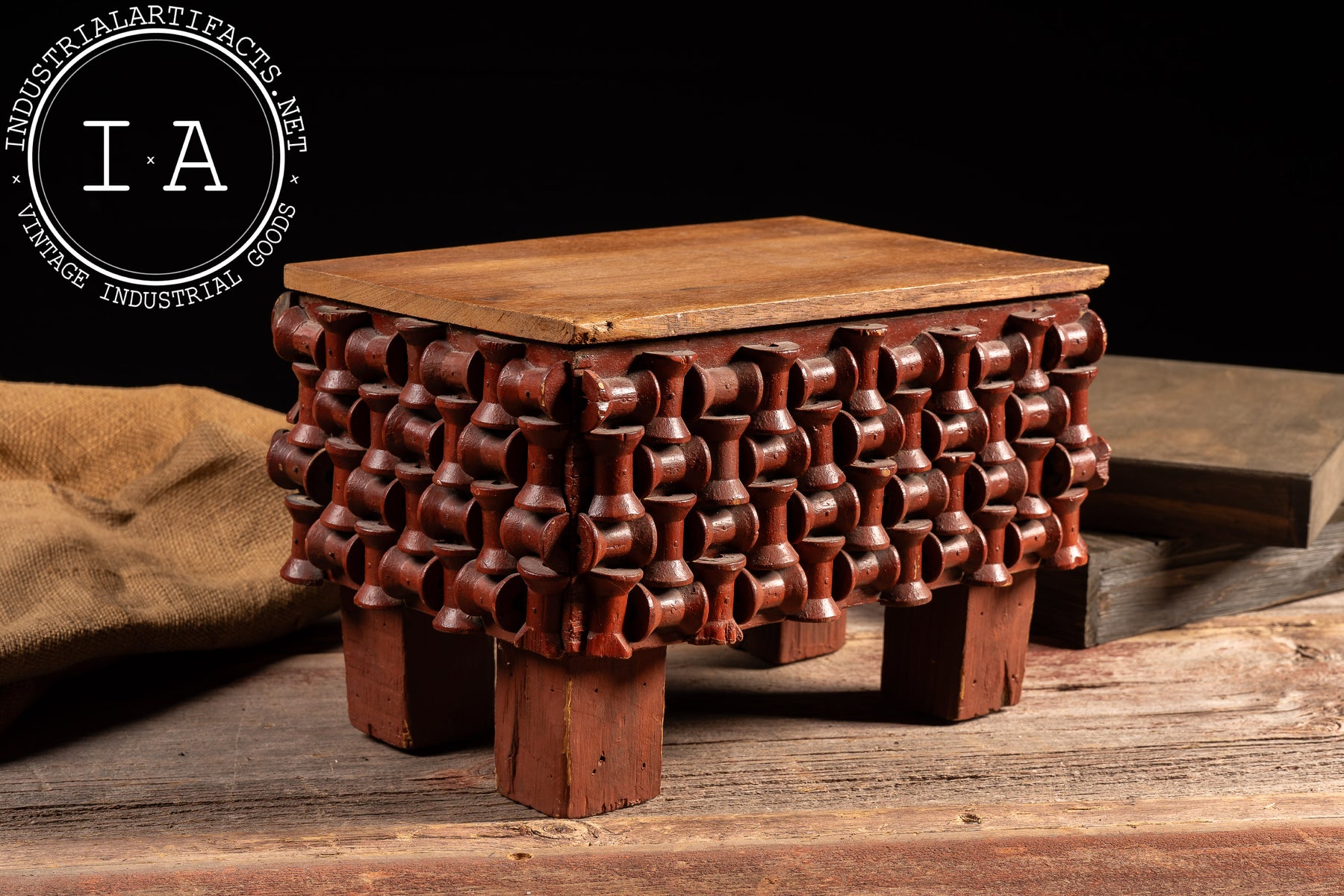 Small folk art stool constructed from stacked wooden spools arranged in a dense grid, supporting a simple rectangular plank top. The spools are painted a deep red-brown tone and set between block-style feet, creating a highly graphic, architectural surface with strong texture and repetition. The top board shows honest wear and softened edges from use, contrasting with the rhythmic, almost sculptural quality of the turned elements below.