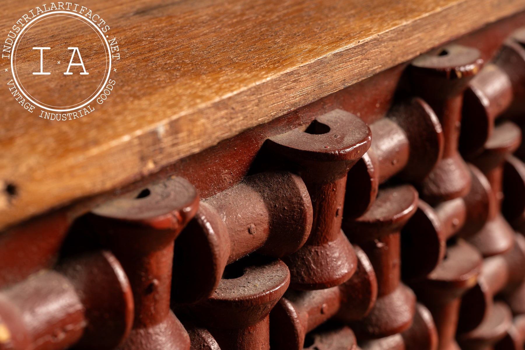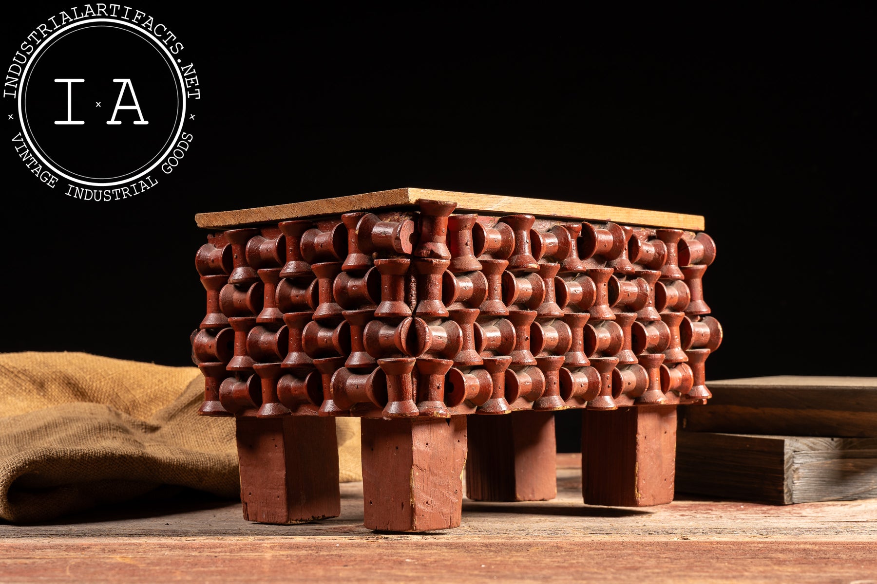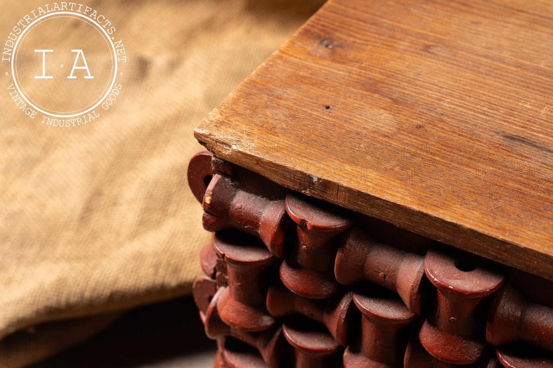 Small folk art stool constructed from stacked wooden spools arranged in a dense grid, supporting a simple rectangular plank top. The spools are painted a deep red-brown tone and set between block-style feet, creating a highly graphic, architectural surface with strong texture and repetition. The top board shows honest wear and softened edges from use, contrasting with the rhythmic, almost sculptural quality of the turned elements below.