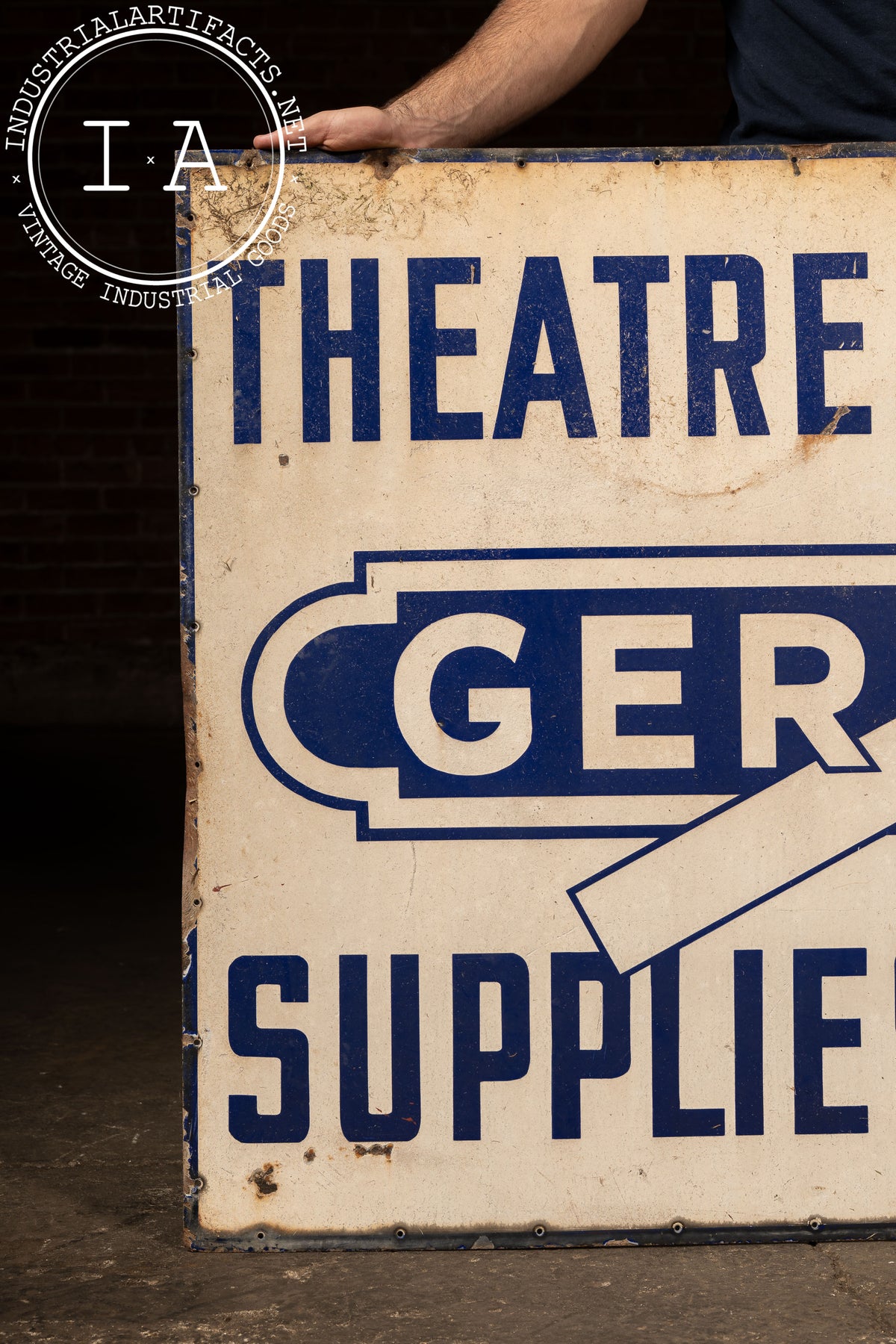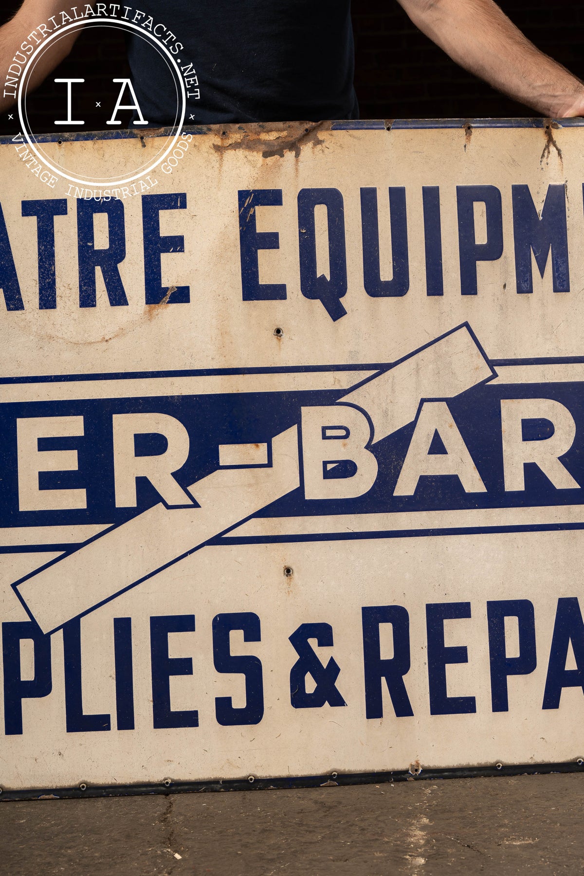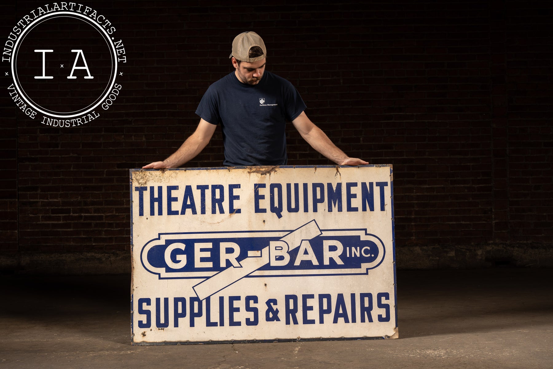 Large painted tin sign advertising "Theatre Equipment - Supplies & Repairs" by Ger-Bar Inc., a Chicago-based manufacturer and supplier of projection, lighting, and sound systems for cinemas and stage houses. The design features bold navy lettering with a central logo framed by an elongated oval border and offset white bar motif, echoing the streamlined graphics of mid-century commercial signage. Likely displayed outside a service warehouse or supply depot, this piece reflects the golden age of movie exhibition and the specialized industry that kept theatres running nationwide.